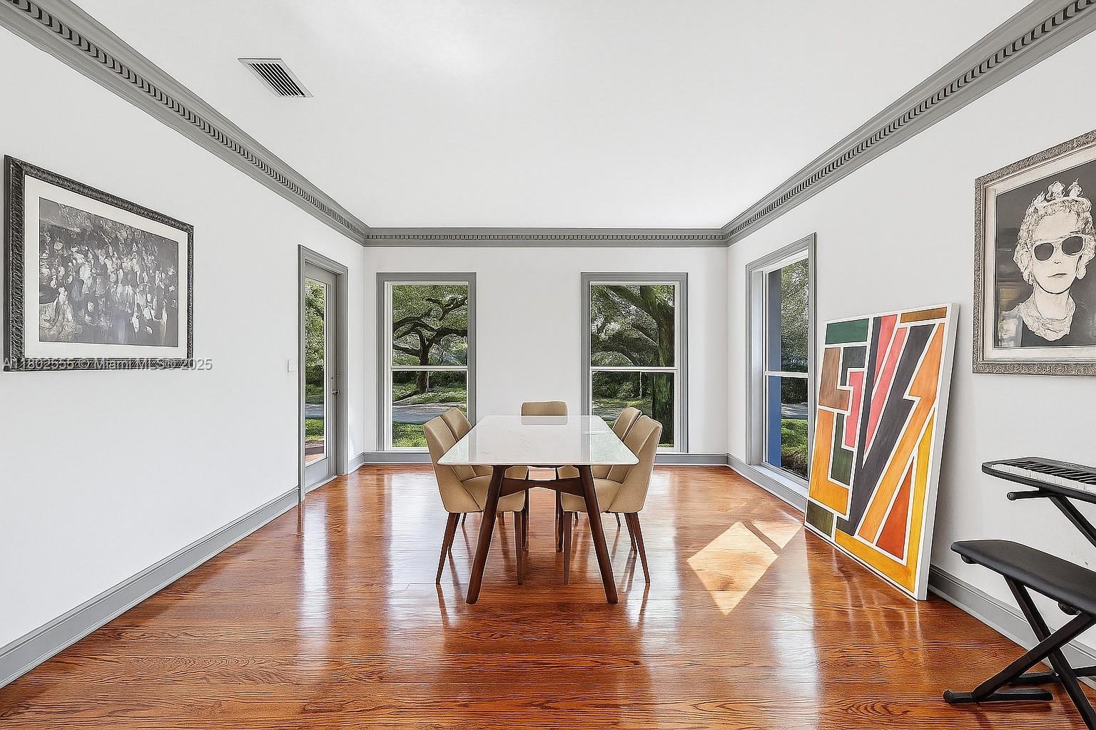 Charming 5 Bedrooms, two-story home on whimsical tree-lined quiet street in South Gables’ prestigious Platinum Triangle. Custom-built in 1990, 11652 SF lot, it features formal living & dining rooms, high ceilings, crown/chair rail moldings, and beautiful wood floors. The spacious family room opens to an oversized kitchen with center island, breakfast nook & ample storage. One bedroom and bath are located downstairs, plus another room ideal for a 6th bedroom or game room. Upstairs, the generous primary suite includes 2 walk-in closets and a large bath. 3 additional bedrooms and one bath complete the second floor. Enjoy the screened porch, laundry room, 2-car garage, and location in the sought-after Sunset Elementary school district. Sun-filled garden with Room for a pool & outdoor kitchen.