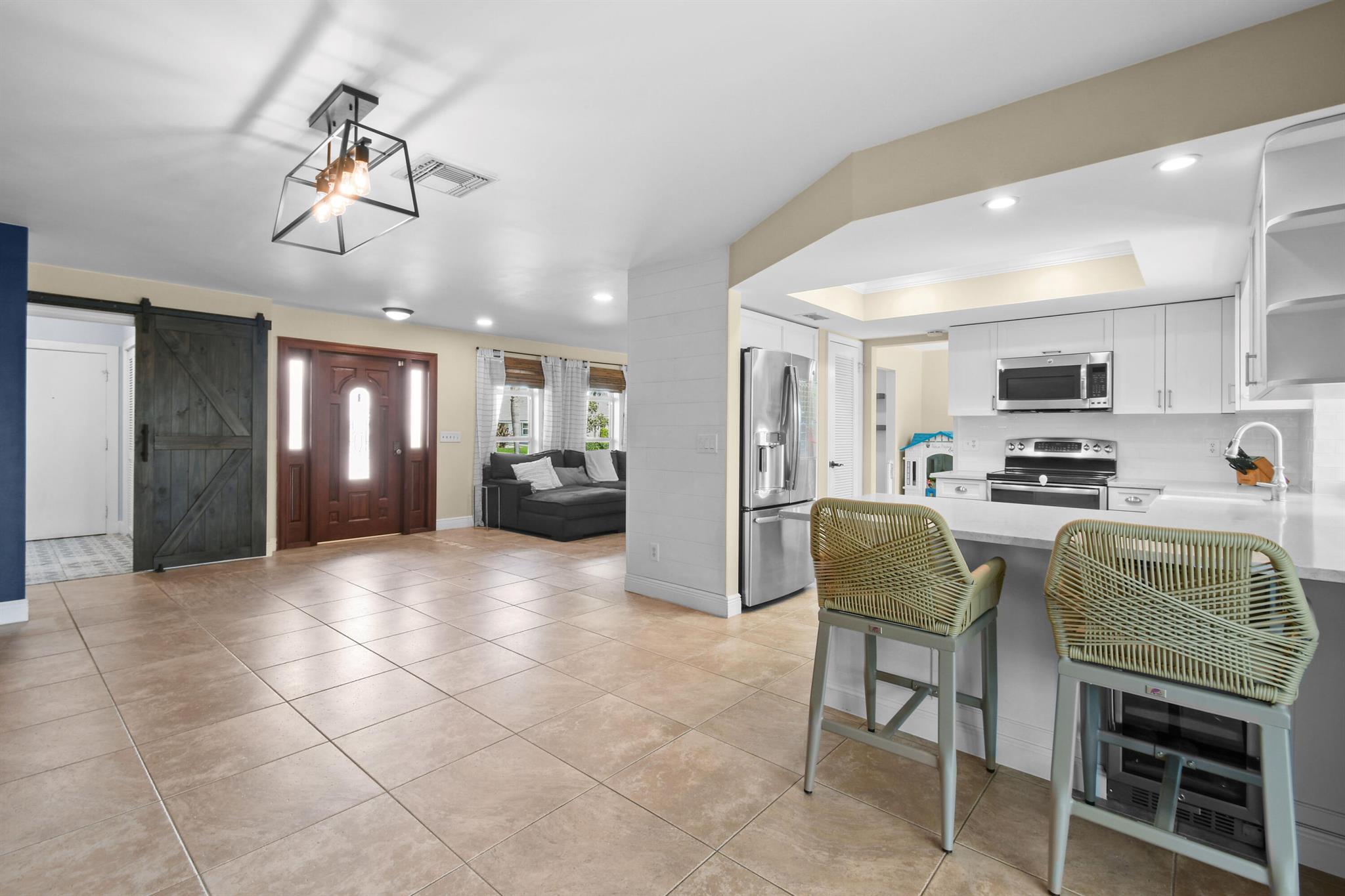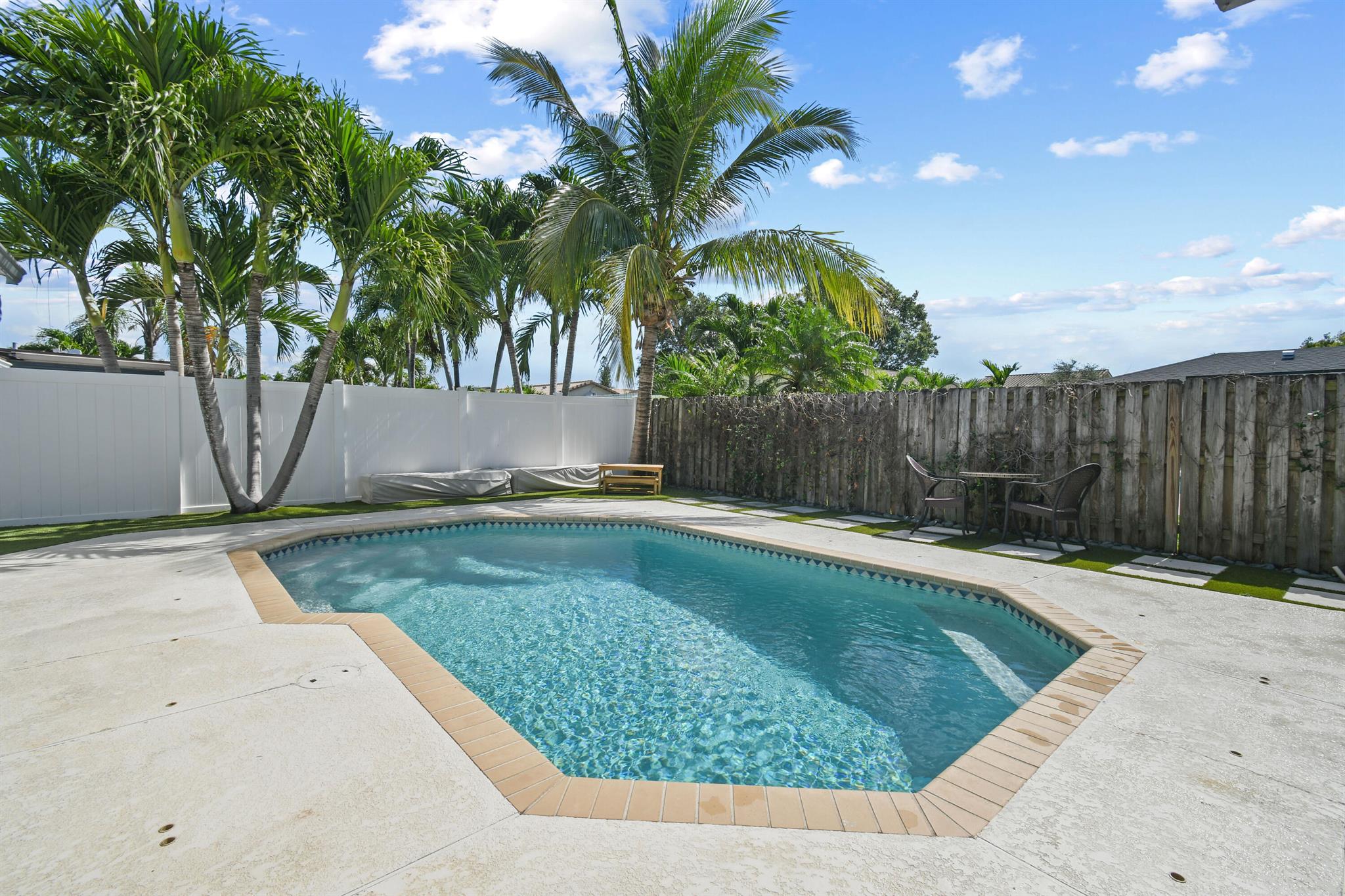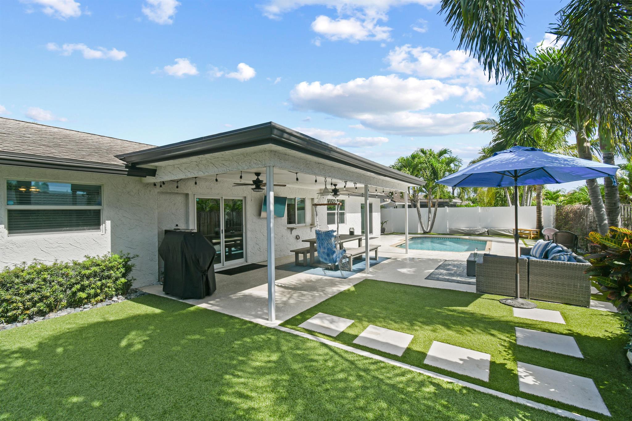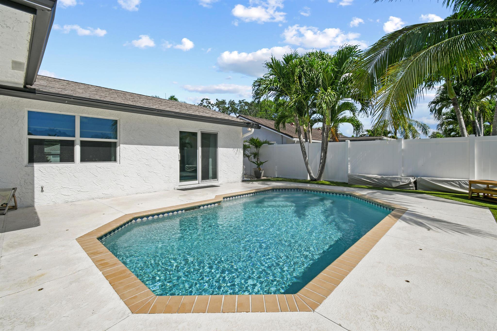 Beautifully updated home in an incredibly central location. This move in ready home features full impact glass, updated kitchen and primary bathroom, an inviting backyard that's primed to entertain you and your guests, and a driveway big enough to host them! (+2 car garage!) Abundant natural light throughout. Primary bedroom recently outfitted with a brand new bathroom and custom closet buildout. Elegant backyard features ample covered and uncovered patio space, pool, and pet friendly turf throughout. Garden Woods is a lovely non-HOA neighborhood that is at the absolute center of all that Palm Beach Gardens has to offer. Don't miss out!