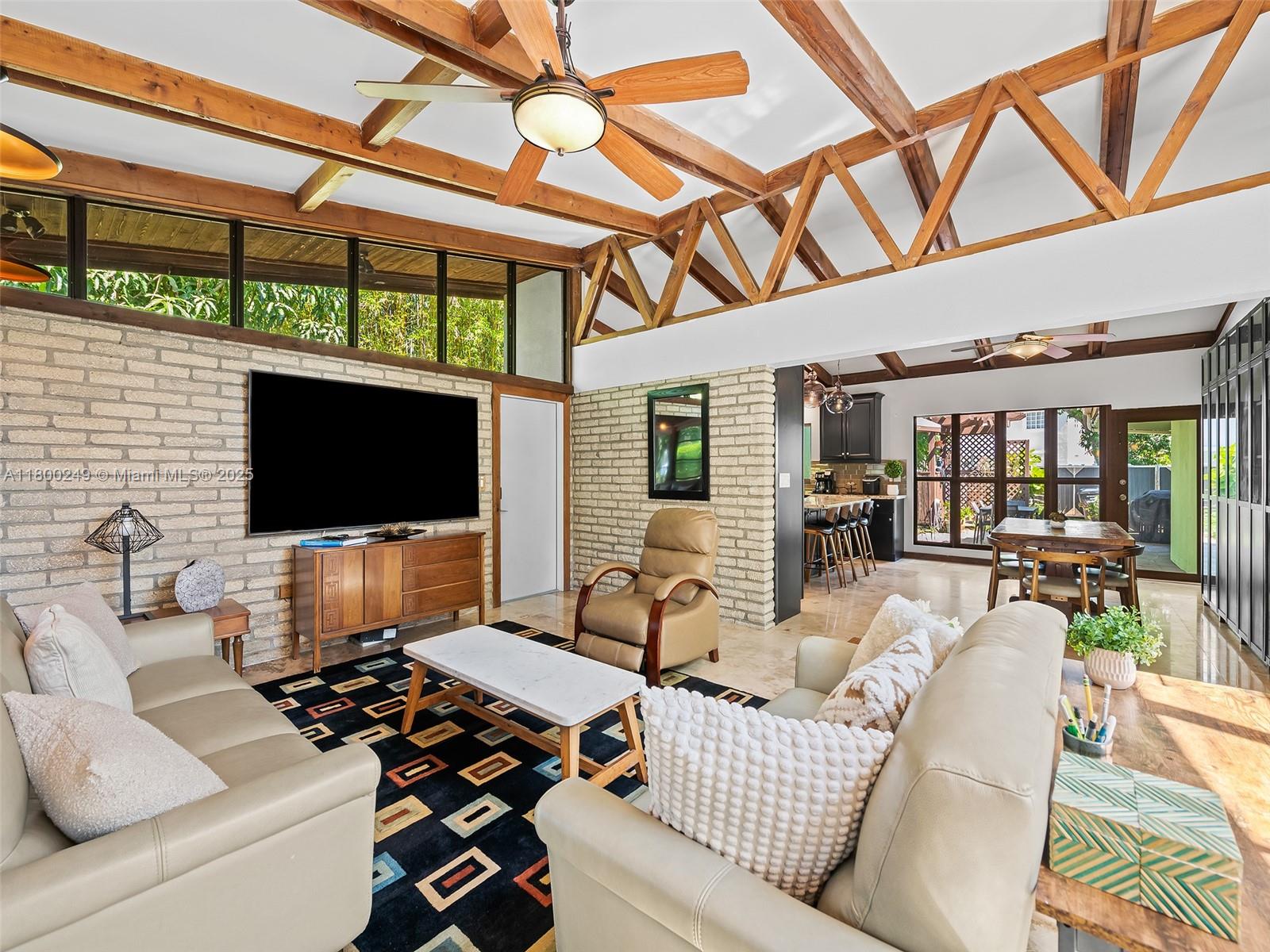 Welcome to The Porch House—a rare opportunity to own a piece of South Florida architectural history. Designed by iconic mid-century architect Igor B. Polevitzky, this 3-bed, 2-bath gem showcases his vision of tropical modernism. Featuring slump brick walls, an exposed structural-timber vaulted roof, floor-to-ceiling glass, and open-concept living, it’s filled with natural light. The gourmet kitchen offers a gas range, built-in fridge, and sleek layout ideal for entertaining or everyday living. Surrounded by lush tropical landscaping, the home offers privacy and seamless indoor-outdoor flow to a sunlit pool and lounge area. Located just blocks from downtown Hollywood and the iconic Hollywood Beach Broadwalk, this is a unique chance to own a home of pedigree, serenity, and lasting style.