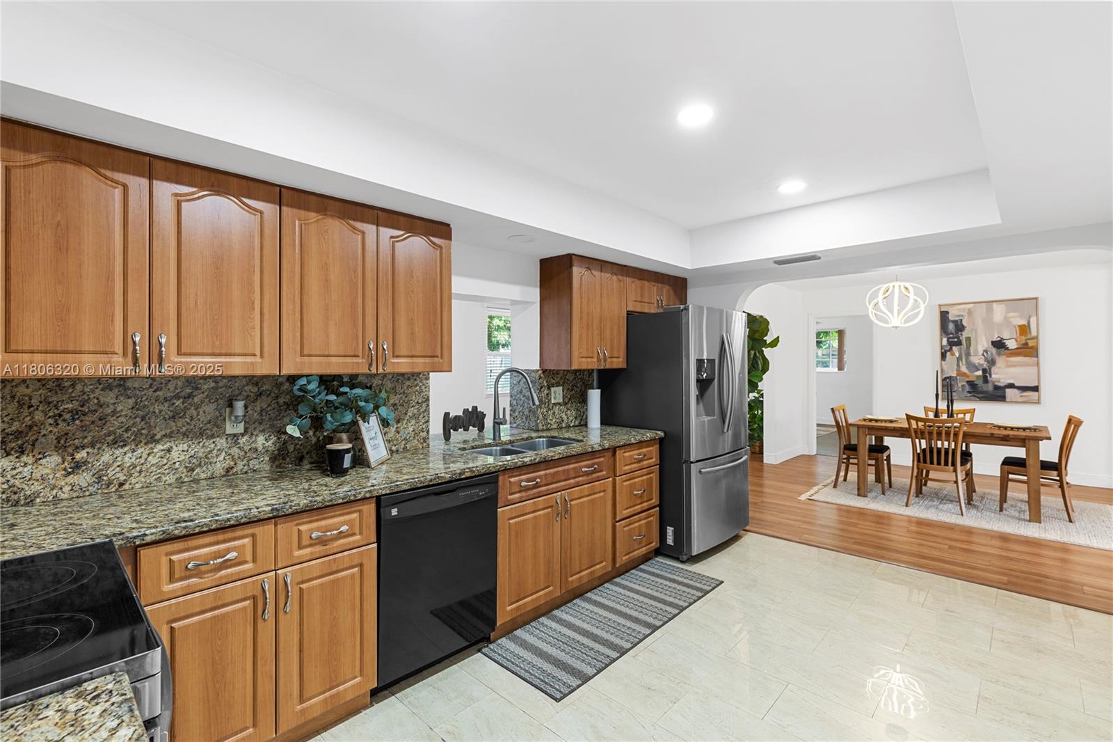 Beautifully maintained one-story home nestled on an expansive lot, complete with a circular driveway offering ample parking. Step inside to find a spacious living & dining area that flows seamlessly into an oversized den/TV room—perfect for entertaining or relaxing with family. The updated eat-in kitchen boasts stunning granite countertops, designer cabinetry with glass inserts, and plenty of room for gatherings. Laminate flooring runs throughout the home, creating a warm and cohesive feel. The garage provides a versatile extra space—ideal for a home office, studio, or playroom. Outside, enjoy a generous backyard.Conveniently located near shopping, restaurants, and more, this home is ready for a quick close.