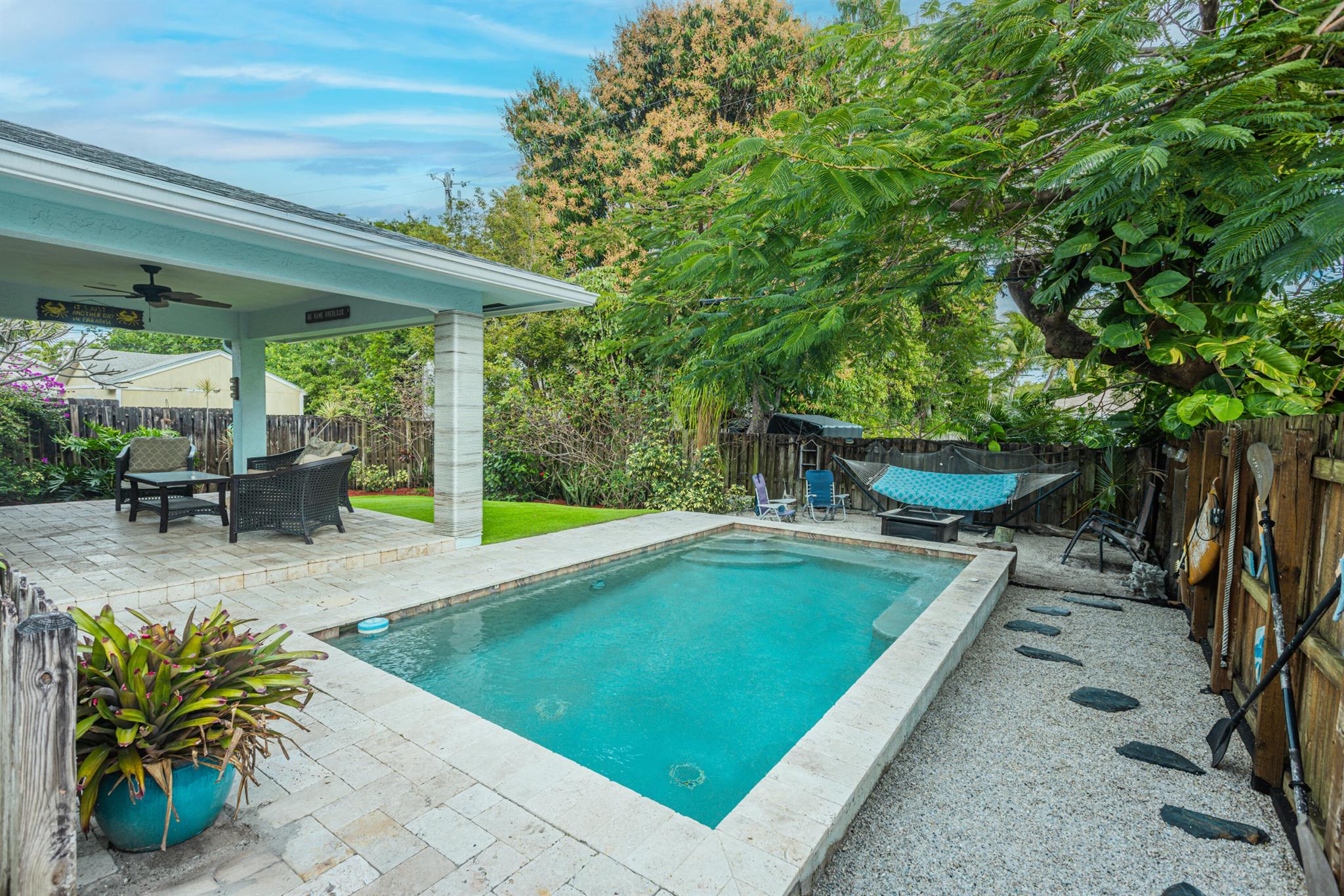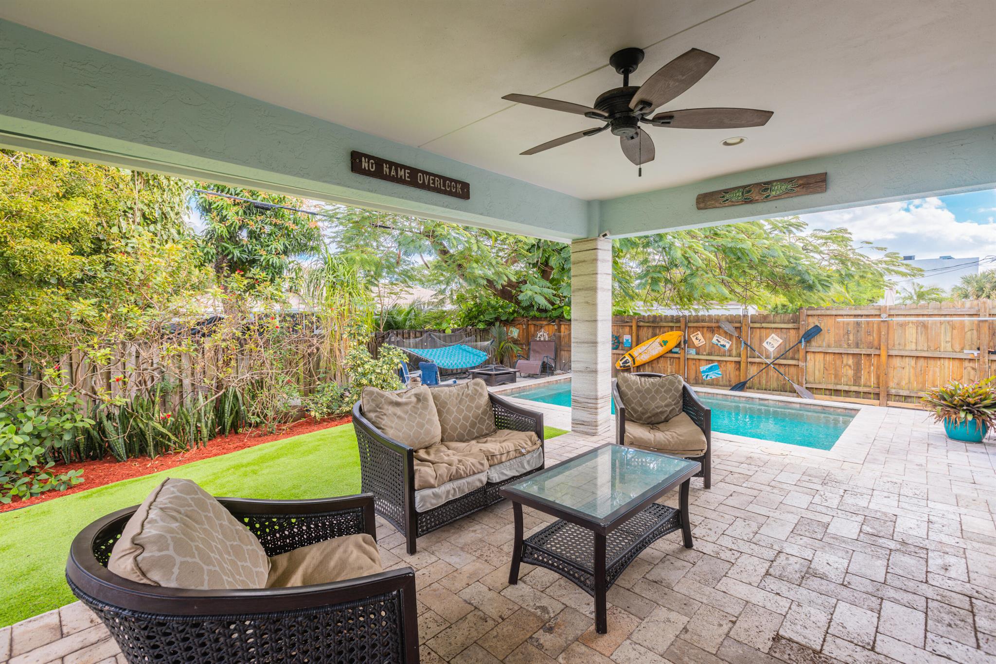 Great Location! Beautiful 3 bedroom, 2 bathroom house with a POOL, located in a highly desirable area of Pompano Beach. Great investment opportunity for short term rental or enjoy this home yourself. Interior is virtually staged . The home features impact windows throughout. Beautiful custom made kitchen with granite countertops, stainless steel appliances, and a gas stove. Enjoy the private fenced yard, which includes a covered patio with pavers surrounding the pool and artificial grass for low-maintenance living. The best part? There's no HOA, allowing you to park your boats, RVs, and fully utilize the property. This fantastic location is close to restaurants, shopping malls, and the ocean, less than 1.4 miles away. Don't miss this great opportunity!