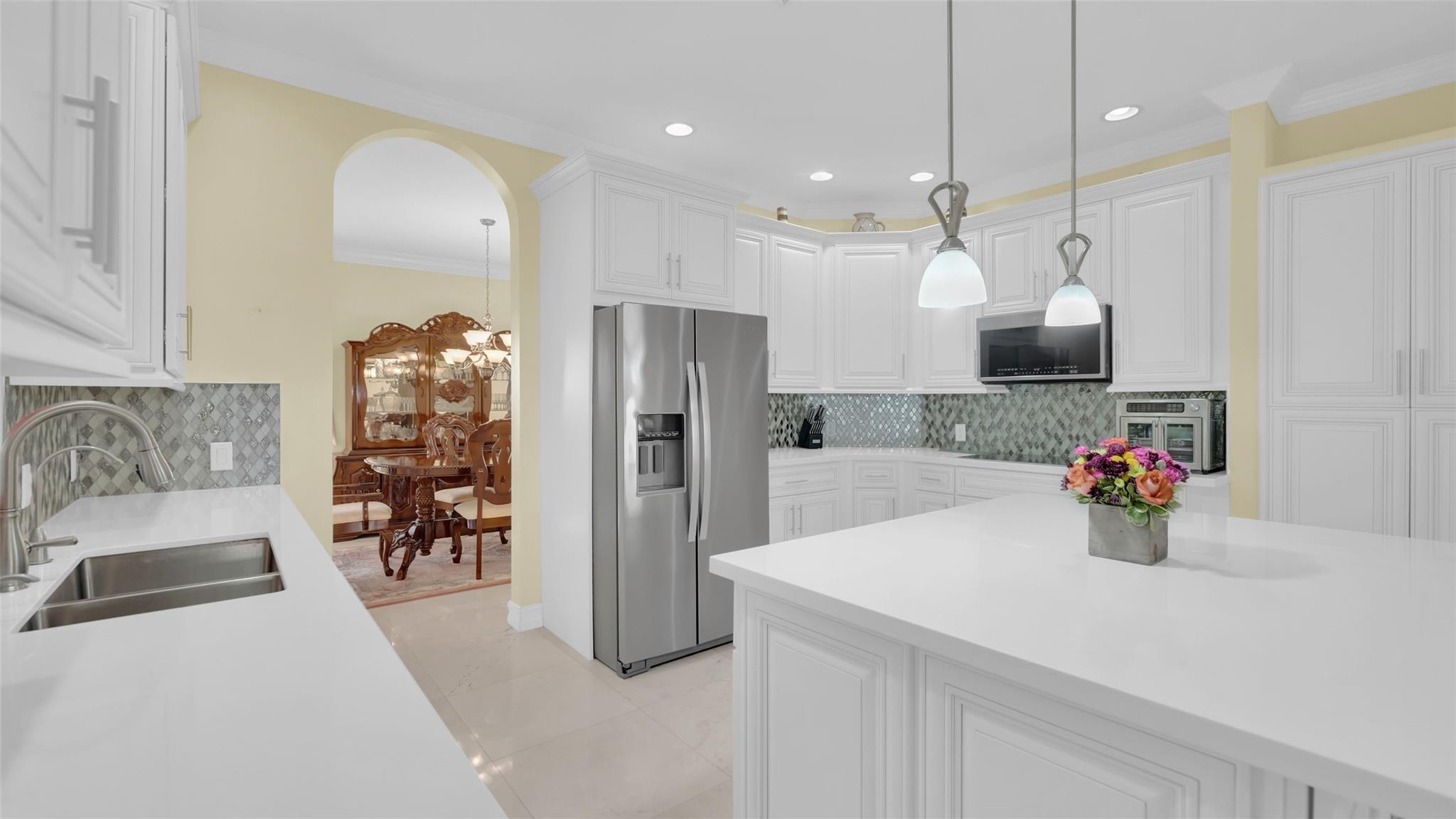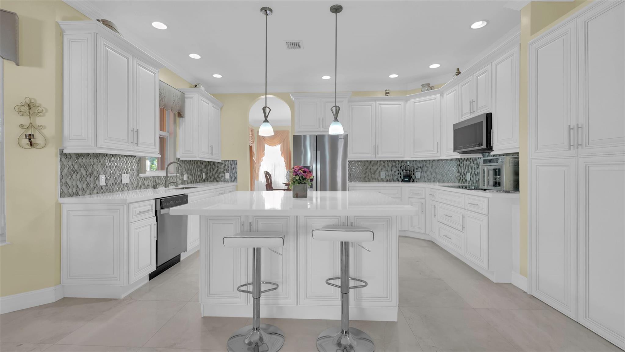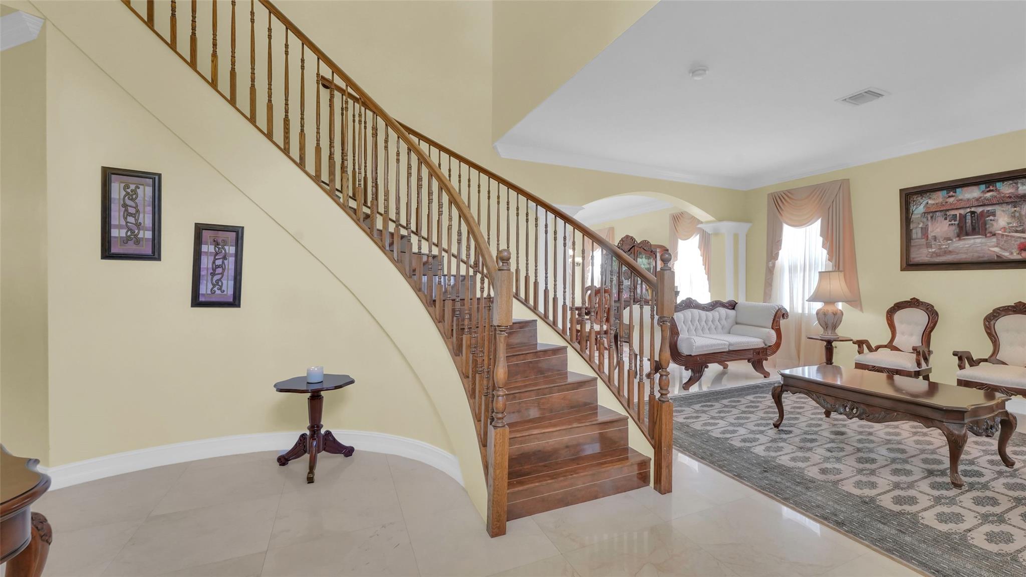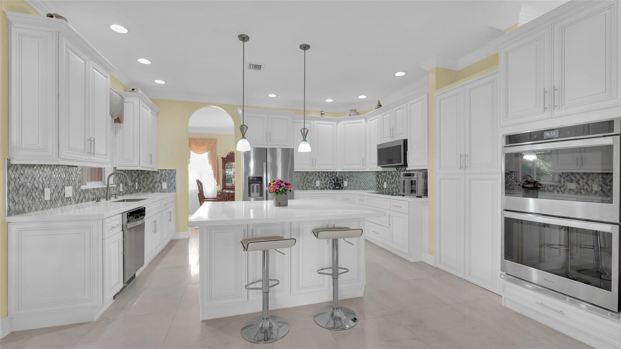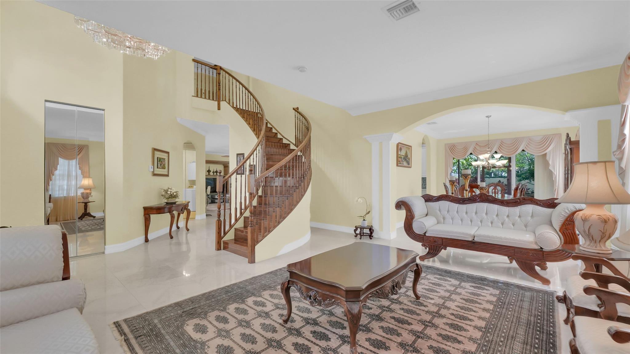 This beautifully renovated home features stunning quartz countertops and rich wooden cabinetry . The entire first floor is adorned with marble flooring, adding sophistication to every room . Tastefully updated bathrooms provide a timeless look that complements any décor style . Enjoy the spacious master bedroom, with a cozy sitting area perfect as a reading nook, home office, or nursery . An ensuite bedroom on the main floor offers comfort and flexibility for guests or multigenerational living. Upgrades include newer stainless-steel appliances, and double ovens, for the home chef. Outside is a well-manicured lawn surrounded by lush greenery and exotic fruit trees! Don’t miss the opportunity to own this move-in-ready gem that blends style, comfort, and functionality in one perfect package!