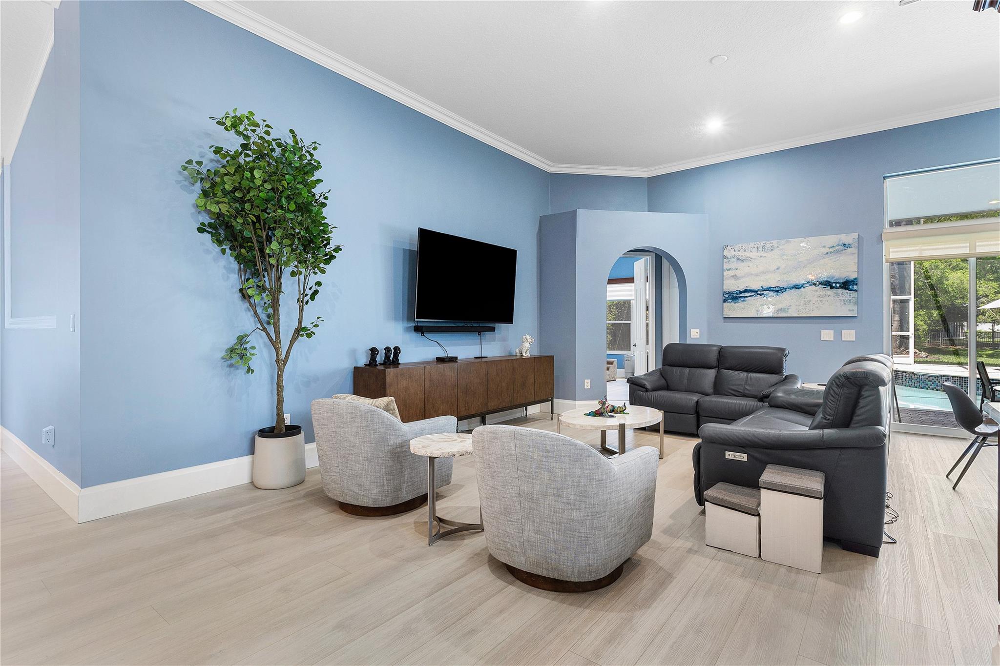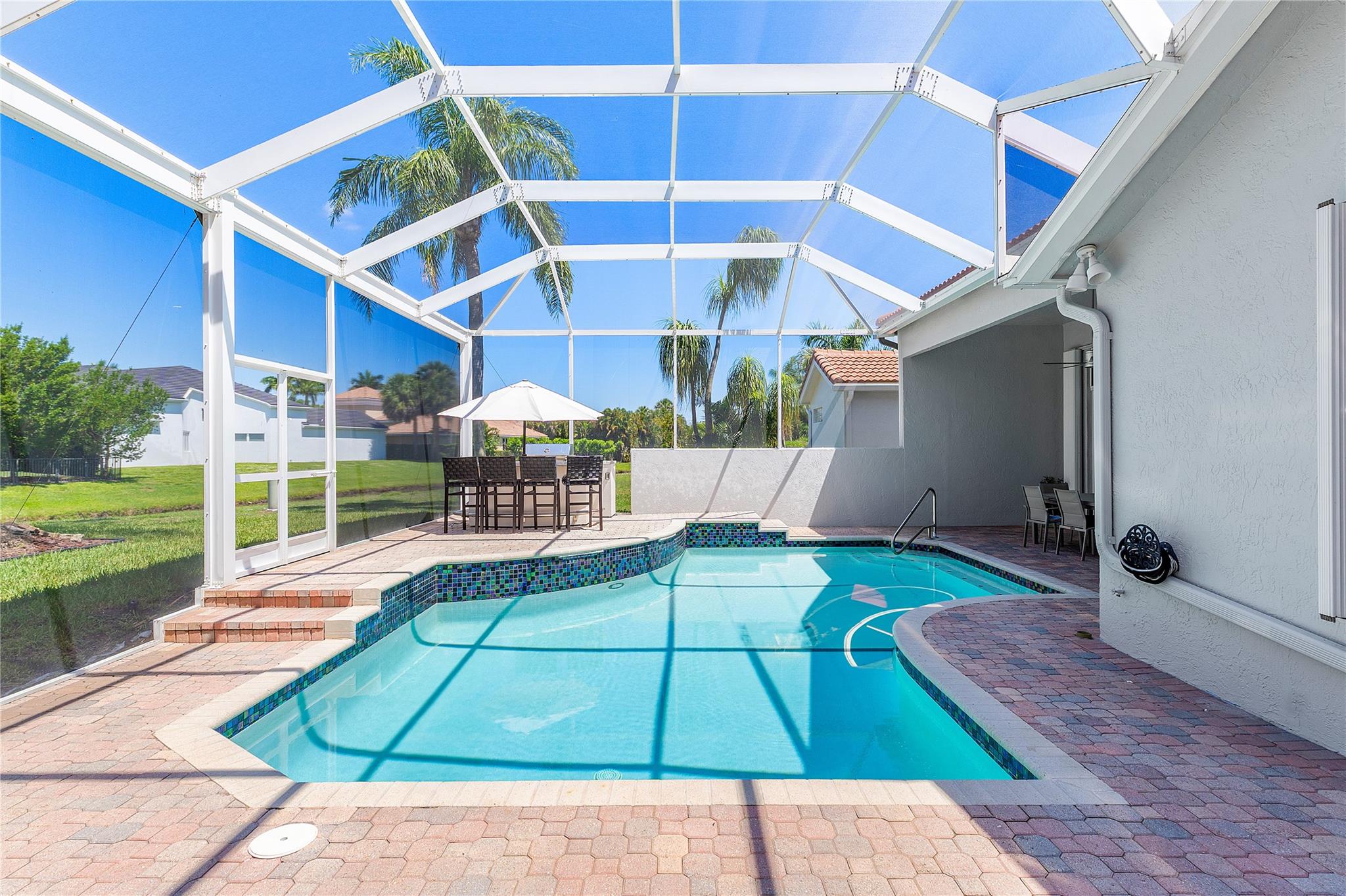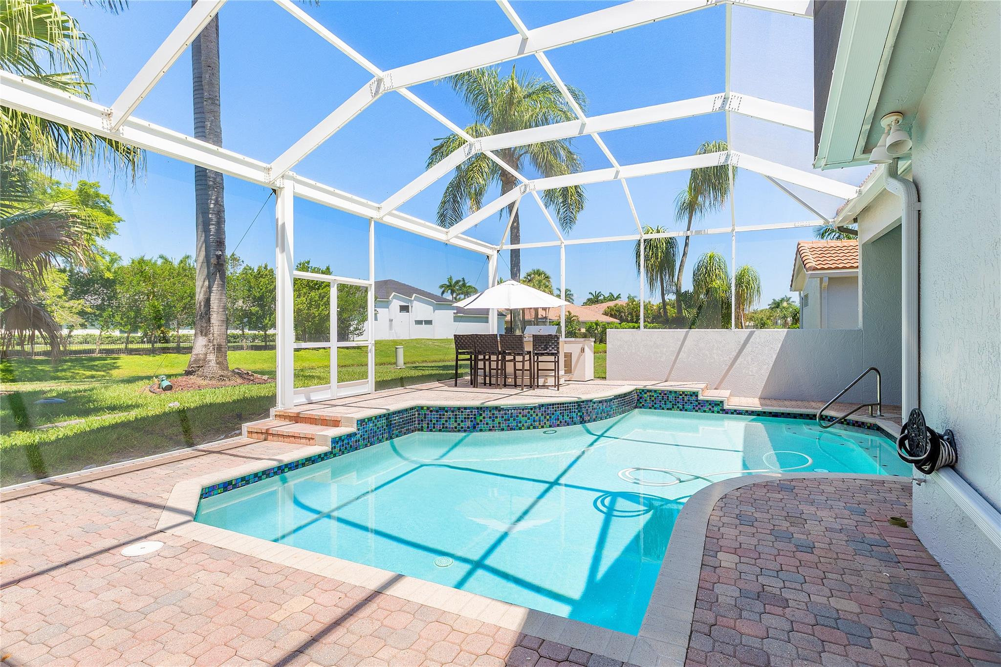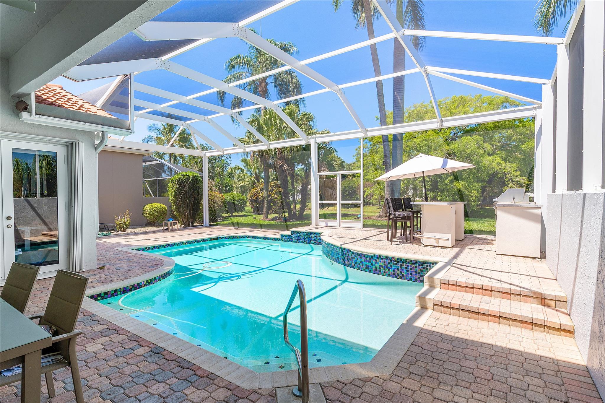 This move-in-ready home is ideal for family living & entertaining! 3 bedrooms (4 large closets), 2.5 baths, a SCREEN-ENCLOSED pool & outdoor kitchen. The open floor plan features new appliances, custom cabinets, a 2019 roof & an expanded living room (2021). Some impact glass & accordion shutters add protection. Freshly painted inside & out (2025), w/new washable laminate flooring & oversized baseboards. Includes formal dining, living & family rooms, plus an open kitchen overlooking the pool-perfect for sunsets. The spacious master suite has pool access, a soaking tub, separate shower, dual vanities & walk-in closets. Add’l rooms include a stylish guest room, 3rd-bedroom w/a walk-in closet & a den/office. The pool area has dining space, outdoor kitchen, bar seating + Whole House generator.