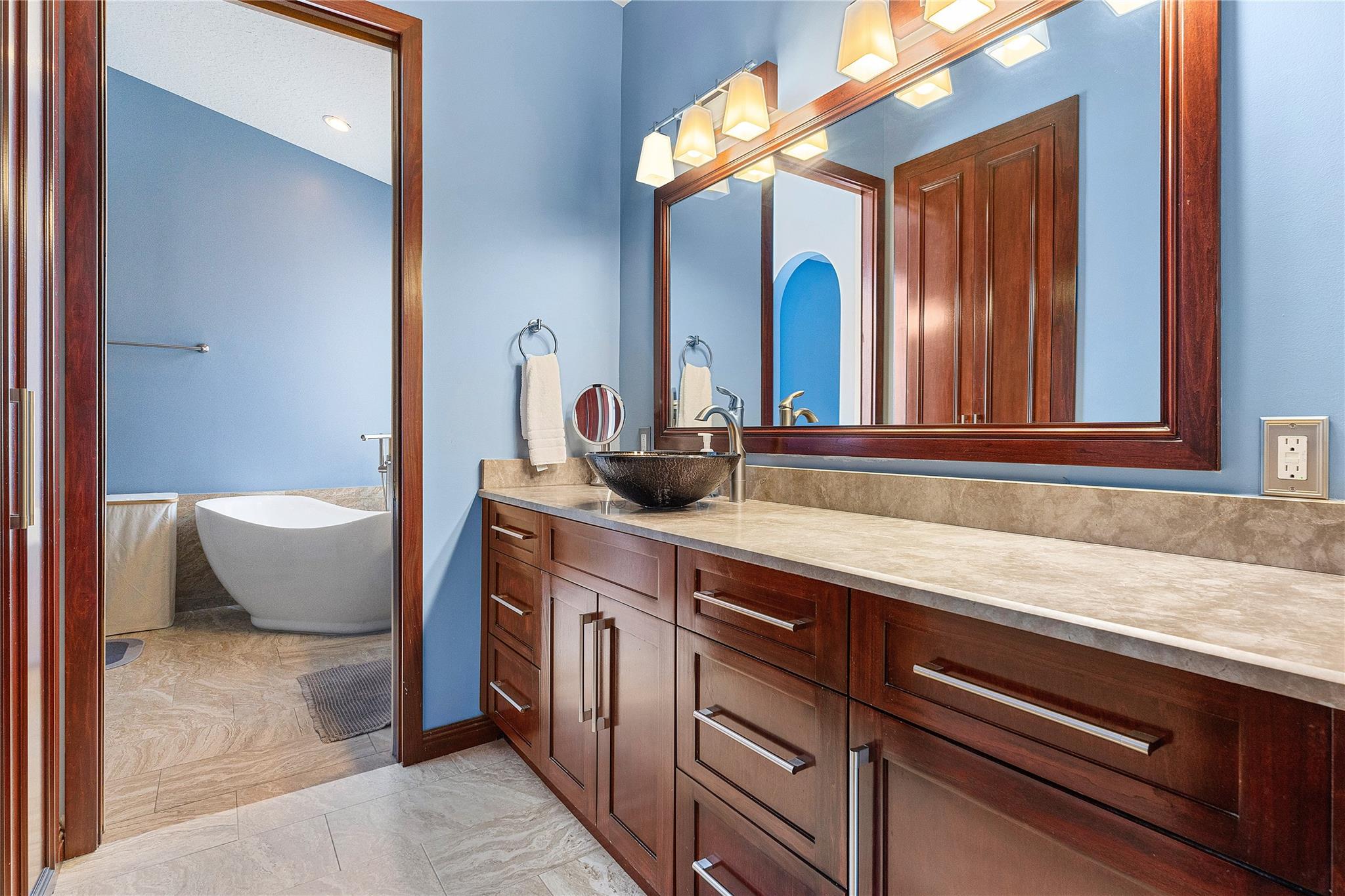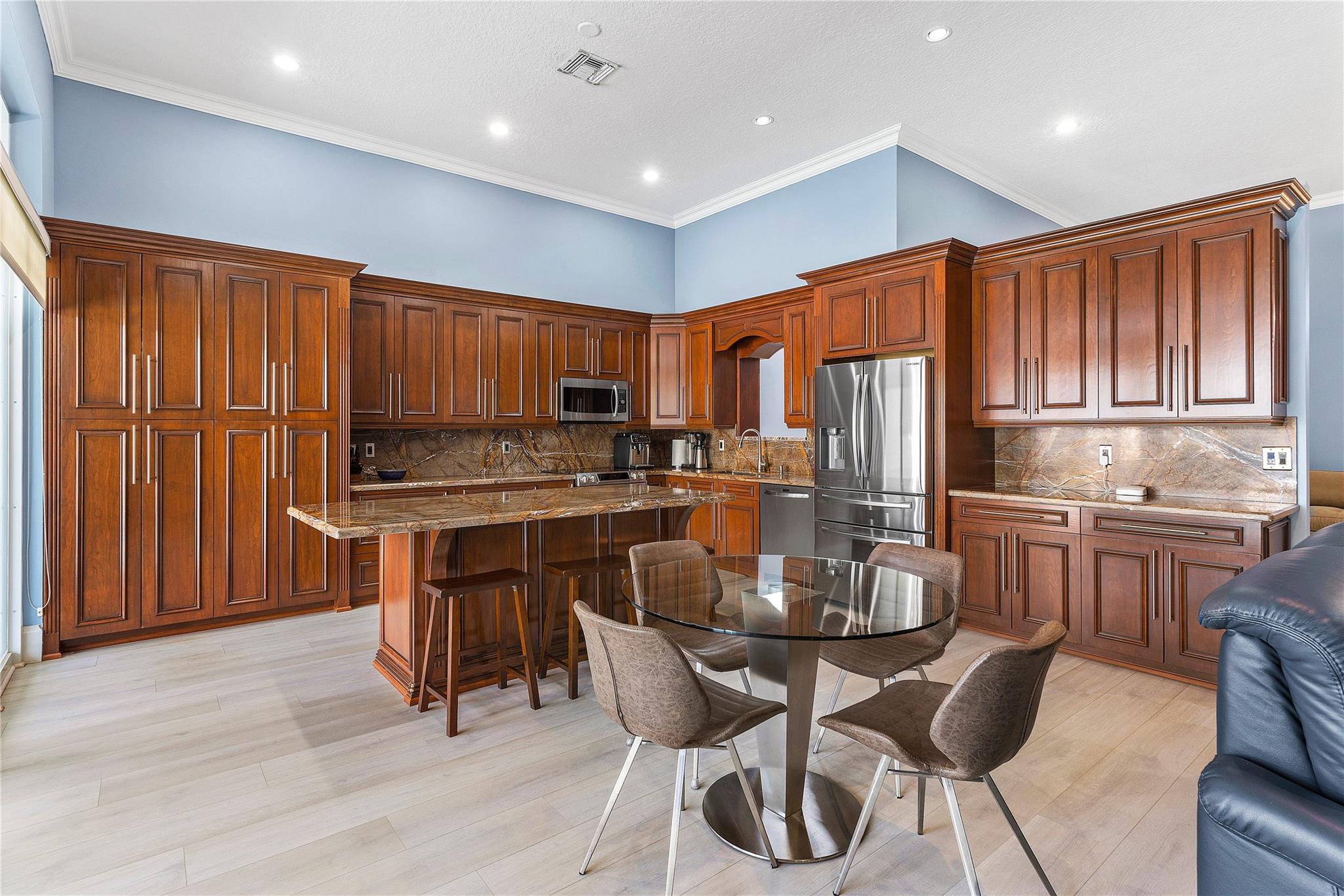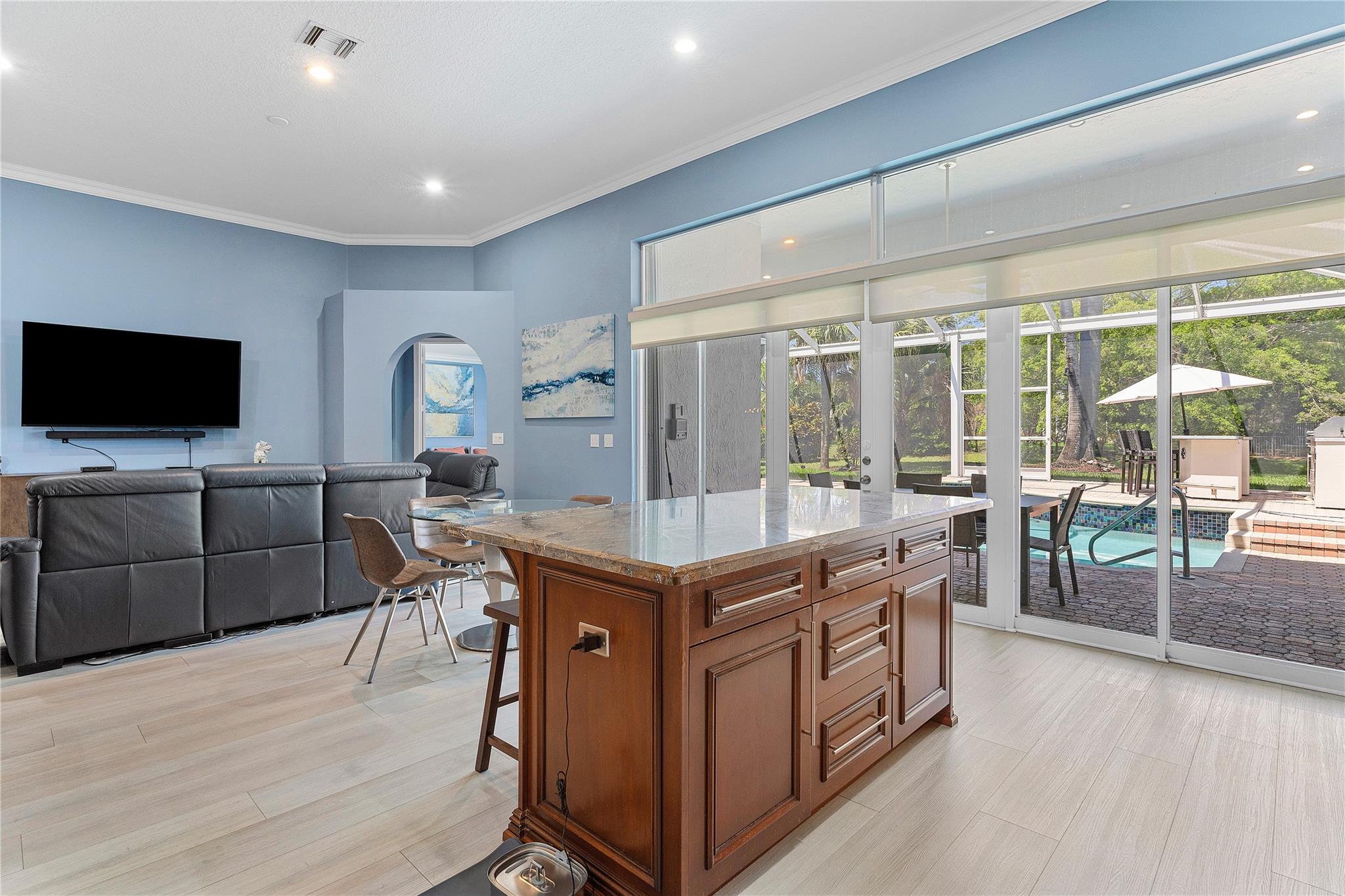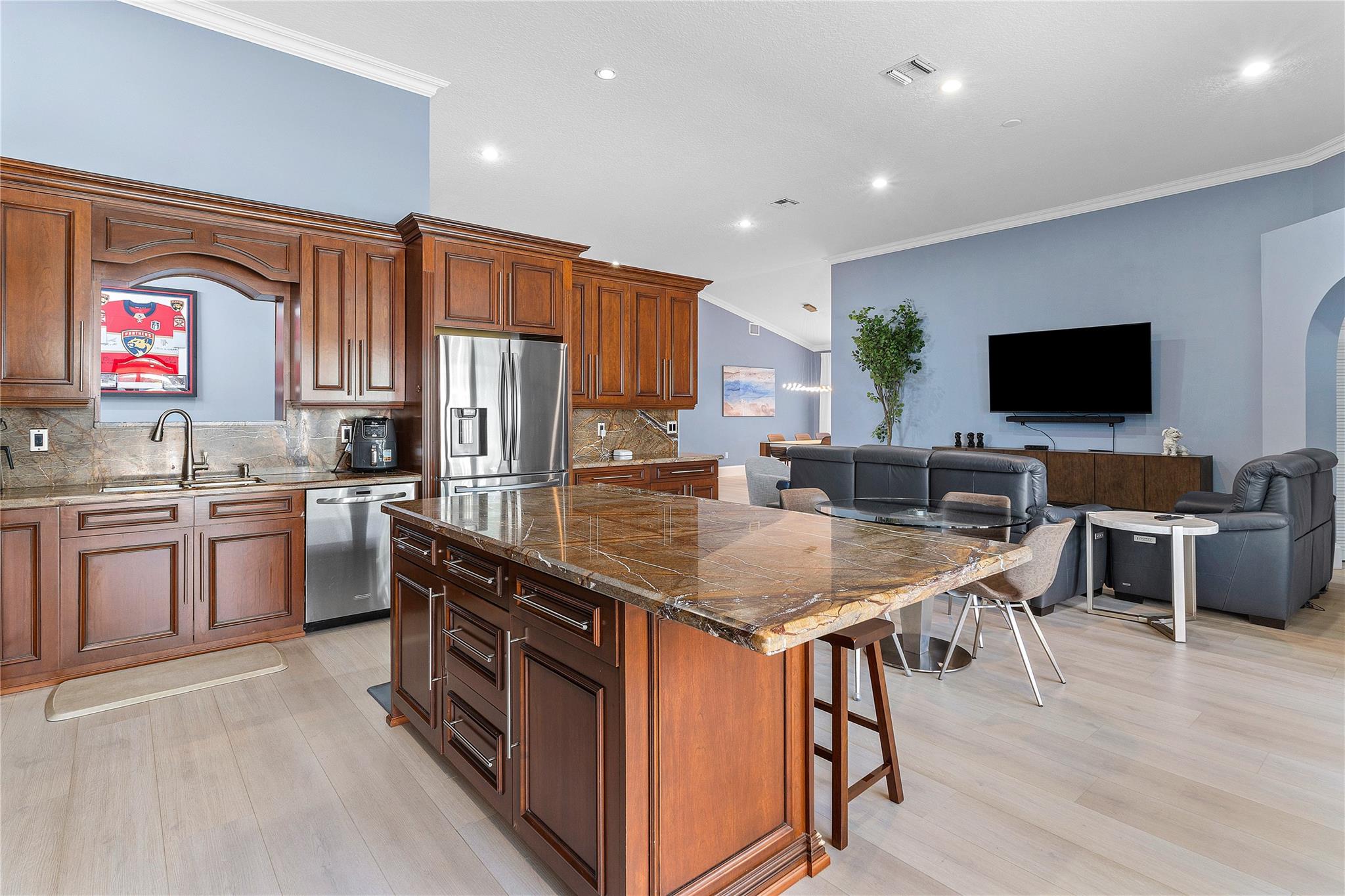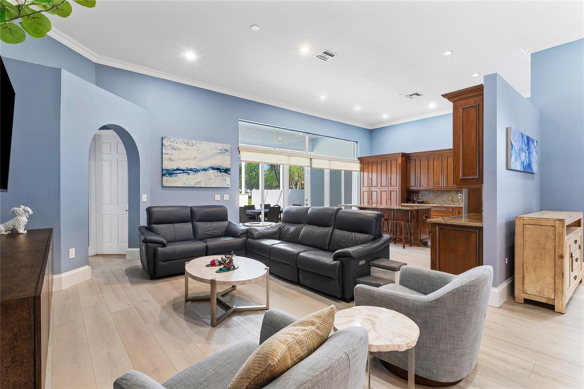 This move-in-ready home is ideal for family living & entertaining! 3 bedrooms (4 large closets), 2.5 baths, a SCREEN-ENCLOSED pool & outdoor kitchen. The open floor plan features new appliances, custom cabinets, a 2019 roof & an expanded living room (2021). Some impact glass & accordion shutters add protection. Freshly painted inside & out (2025), w/new washable laminate flooring & oversized baseboards. Includes formal dining, living & family rooms, plus an open kitchen overlooking the pool-perfect for sunsets. The spacious master suite has pool access, a soaking tub, separate shower, dual vanities & walk-in closets. Add’l rooms include a stylish guest room, 3rd-bedroom w/a walk-in closet & a den/office. The pool area has dining space, outdoor kitchen, bar seating + Whole House generator.
