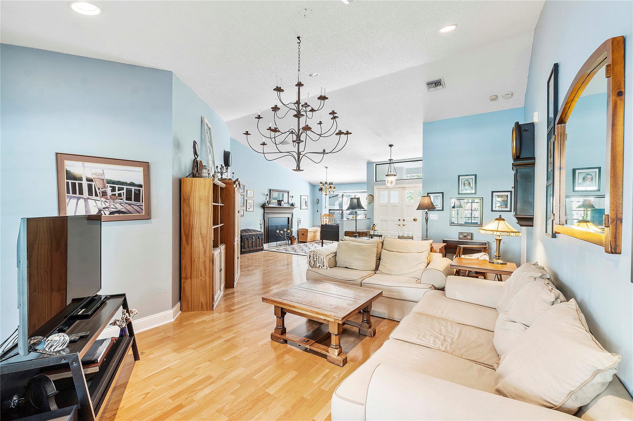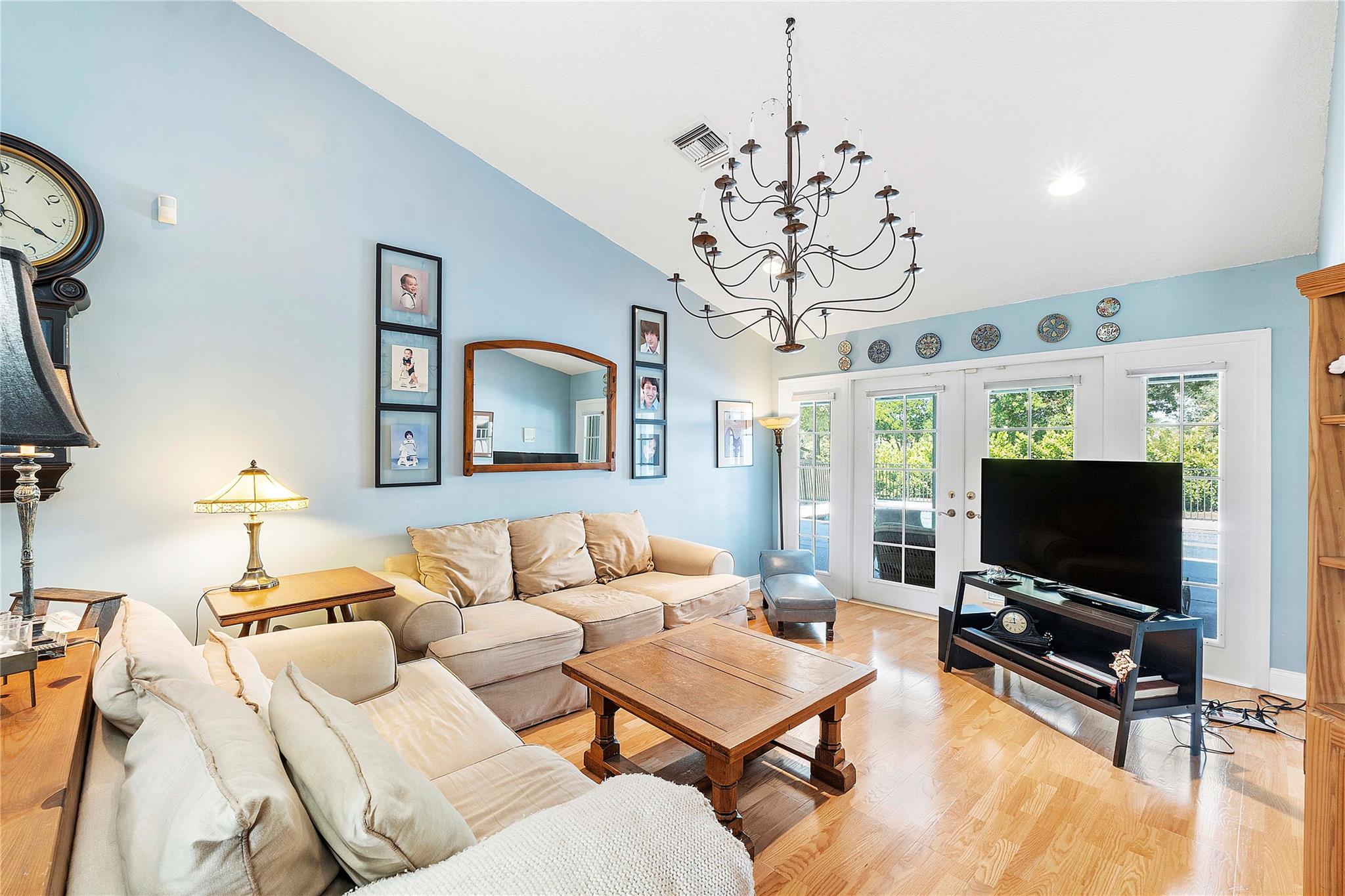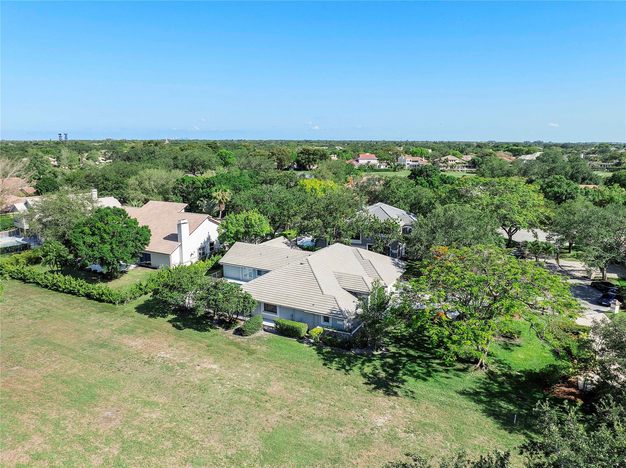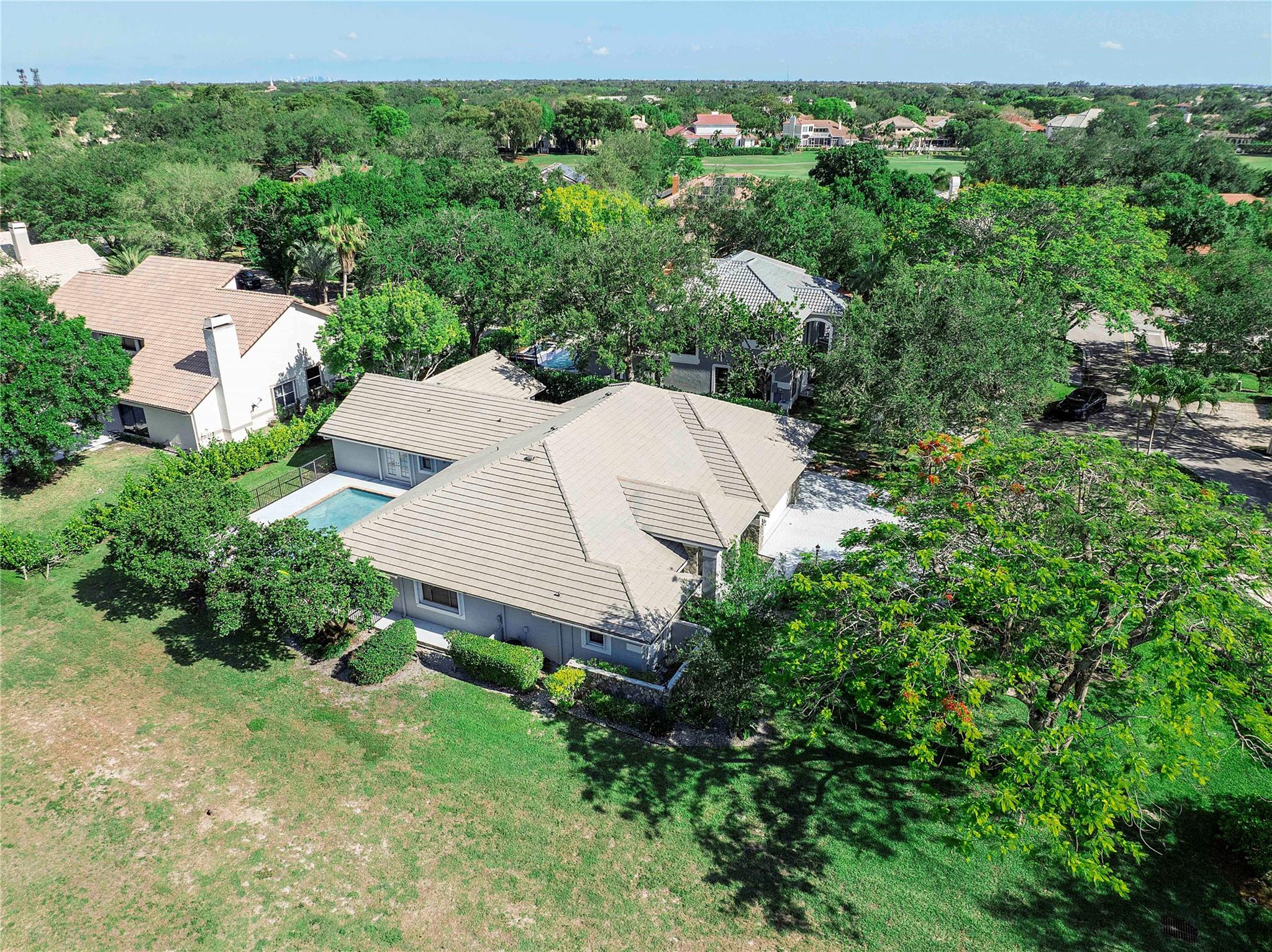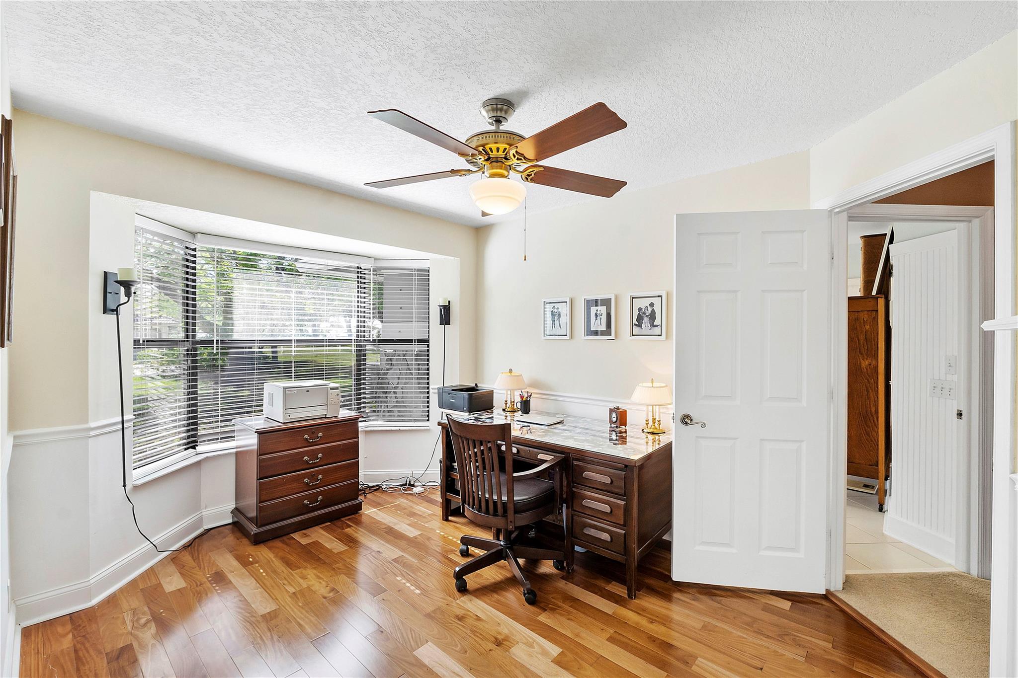 Tucked away on a quiet cul-de-sac in the desirable Eagle Trace community, this custom-built home offers privacy, comfort, and space. Overlooking the golf course, enjoy peaceful views from your large, covered patio and fully fenced pool area. Thoughtfully designed split-bedroom layout features five bedrooms with spacious closets, including two en-suite rooms, one with its own cozy sitting area. Fifth bedroom doubles perfectly as a home office. Clean finishes and classic details: beautiful hardwood floors, cathedral and vaulted ceilings (no popcorn), recessed lighting, casement-trimmed windows, and elegant French doors throughout. Enjoy the comfort of large bedrooms with walk-in closets and a three-zone AC. Home features hurricane protection and offers various community amenities.
