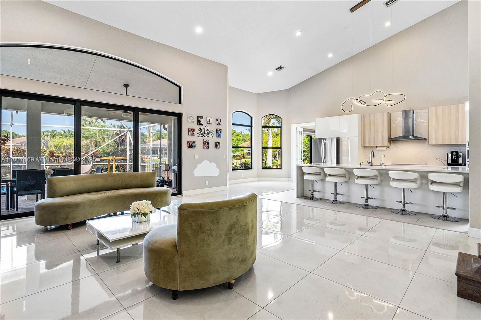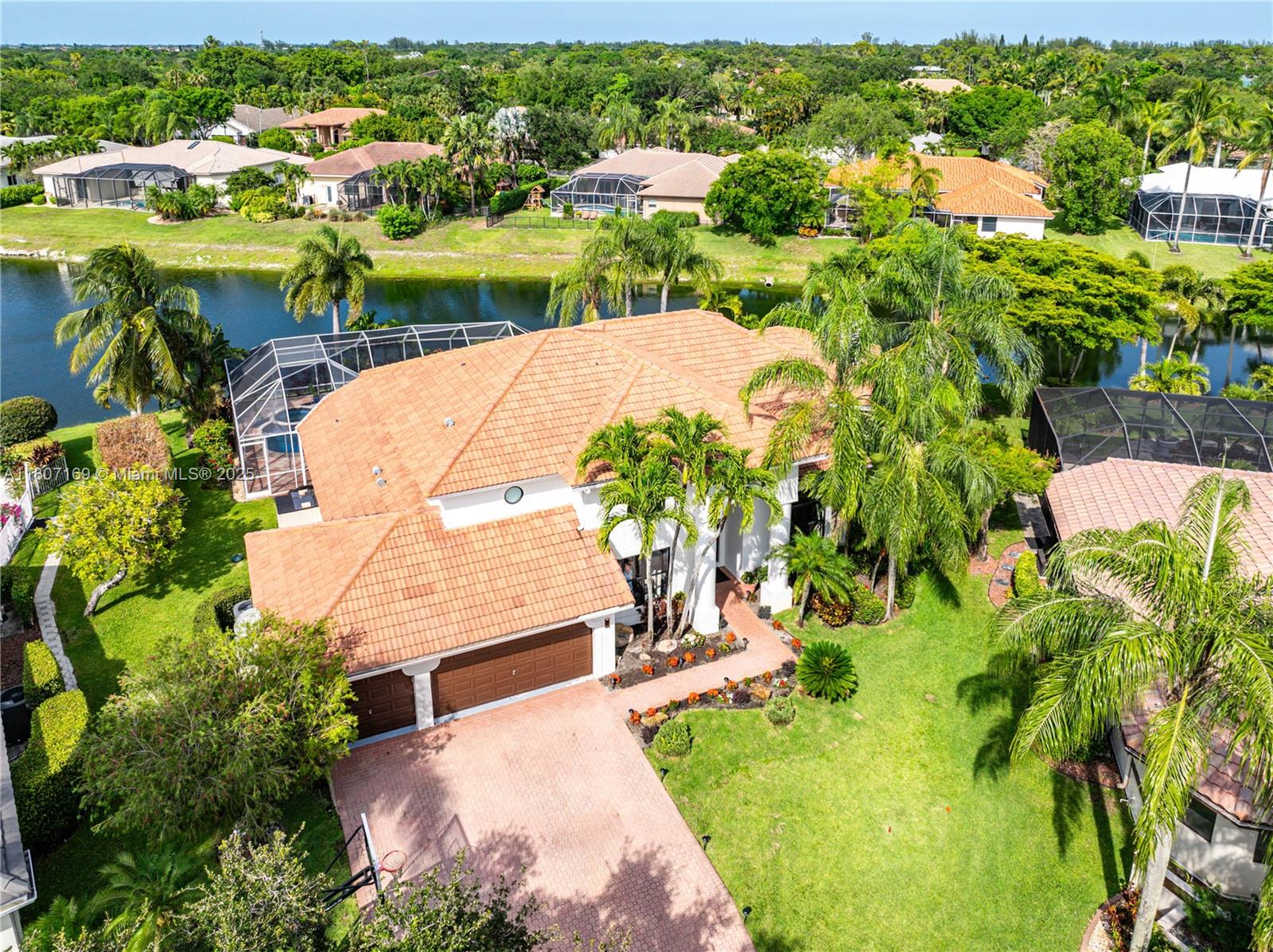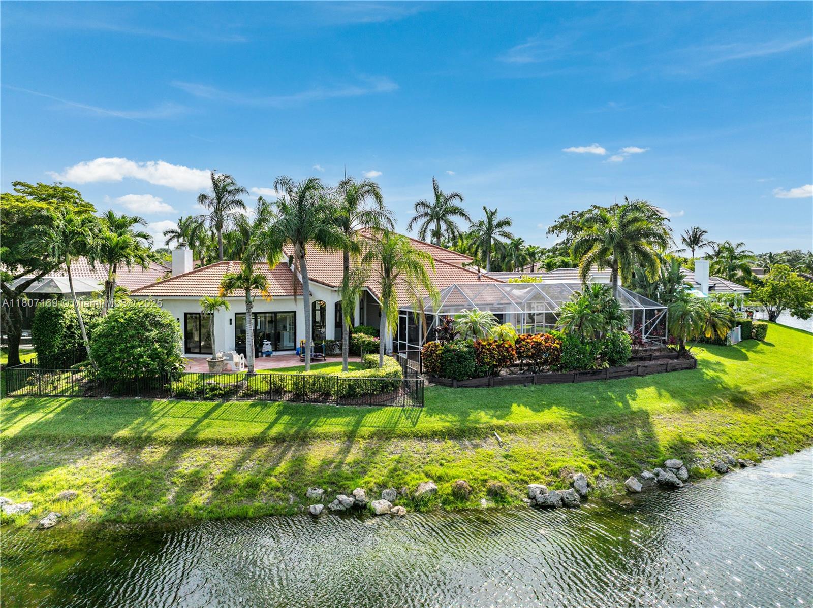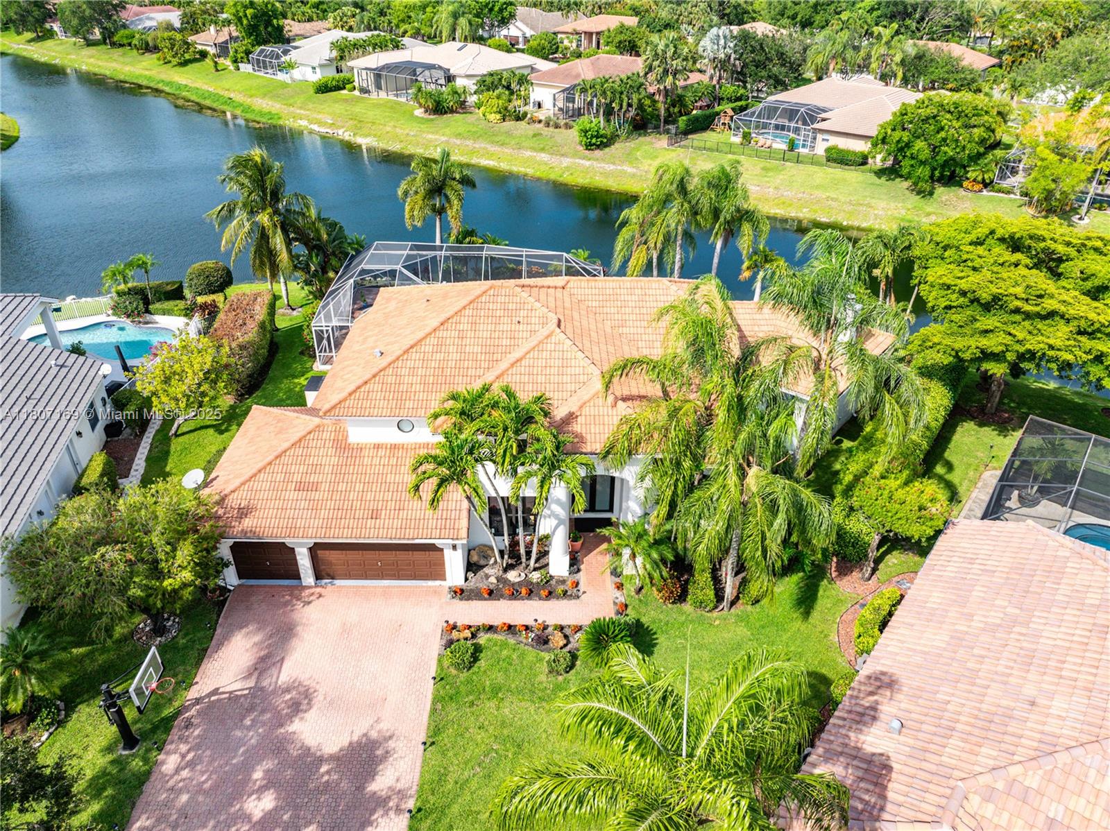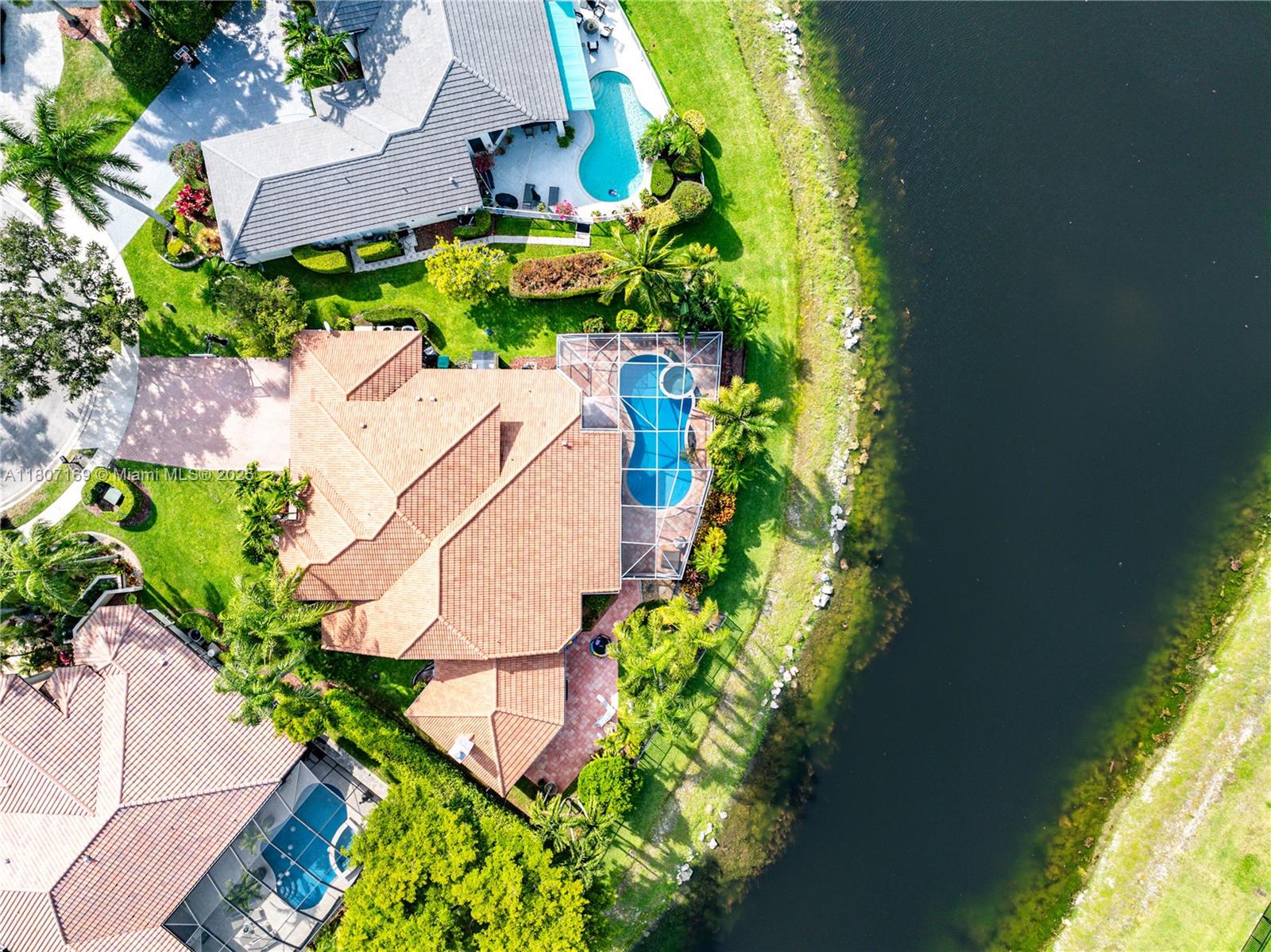 Redefined luxury waterfront residence. Perfectly positioned on a quiet cul-de-sac, it boasts 180 feet of serene water frontage and breathtaking panoramic views. Dramatic, open-concept, features soaring ceilings, striking glass staircase, updated marble floors. The gourmet chef's kitchen is a dream, seamlessly flowing into expansive living and dining spaces—ideal for effortless entertaining. Unwind in the lavish first-floor primary suite. The versatile loft can easily be a 5th bedroom, while the impressive media/rec room offers endless possibilities for fun and relaxation. Outdoors, enjoy both screened and open patios, a sparkling heated salt pool and spa, and lush, meticulously landscaped grounds. Full impact windows and a whole-house generator ensure complete security and comfort.