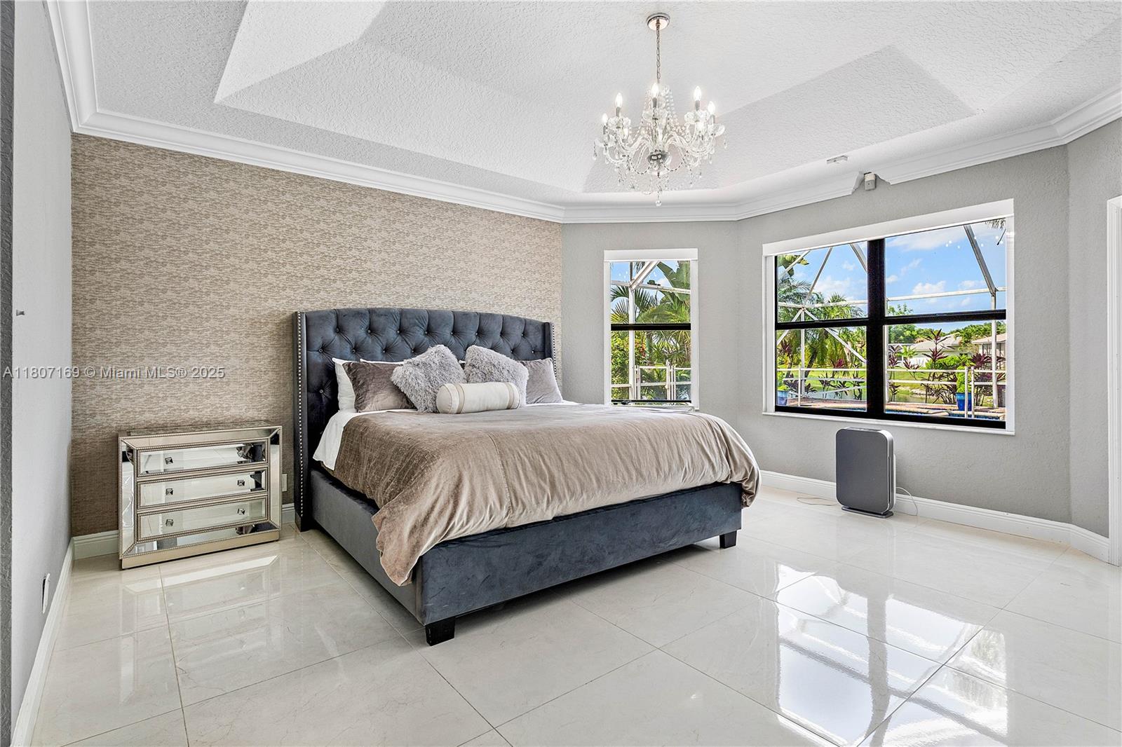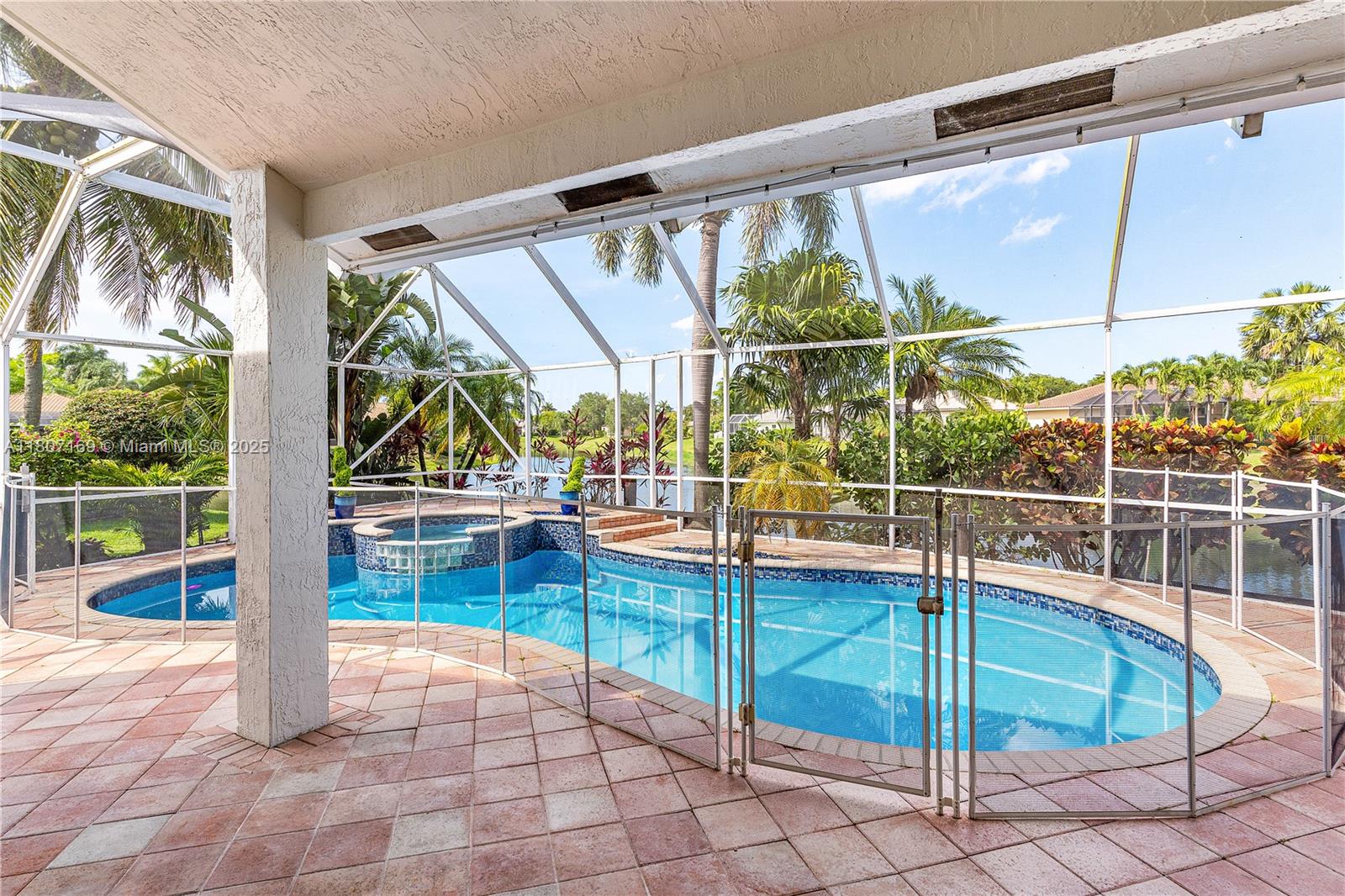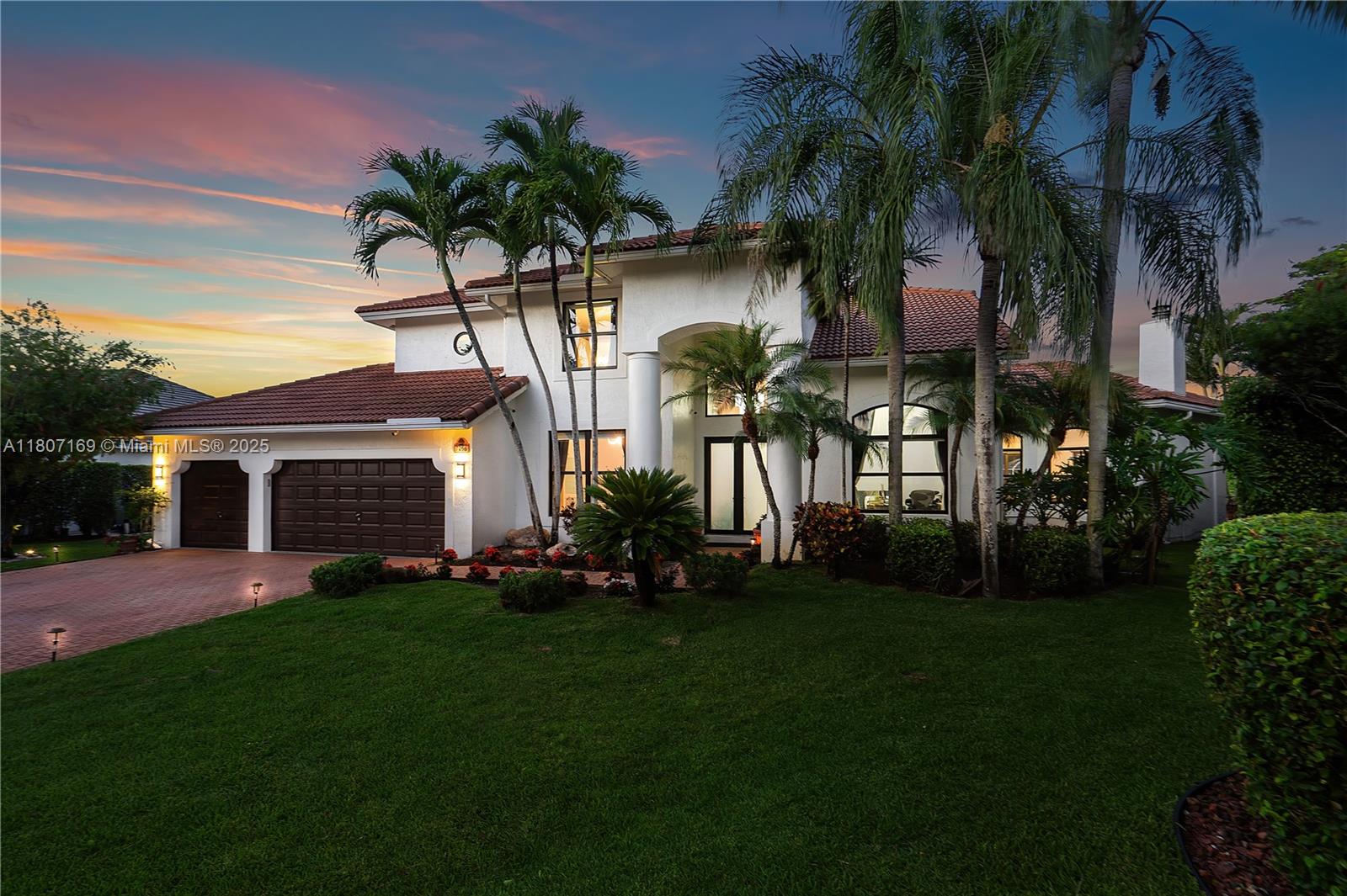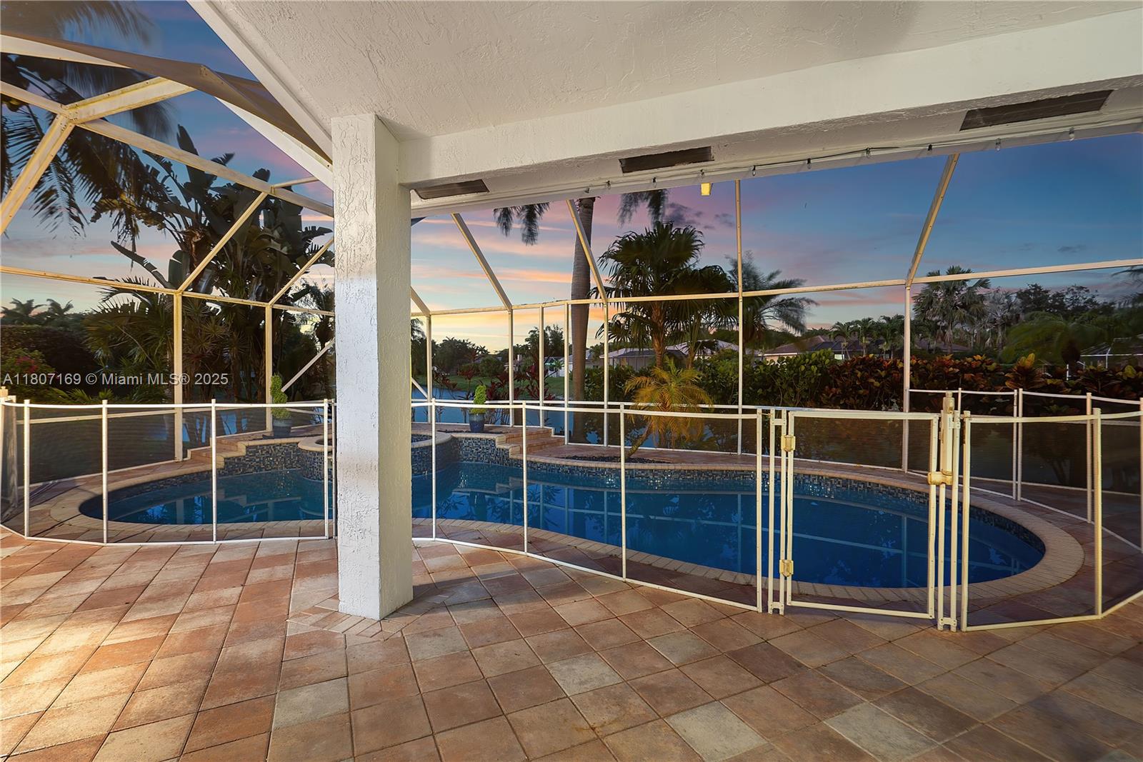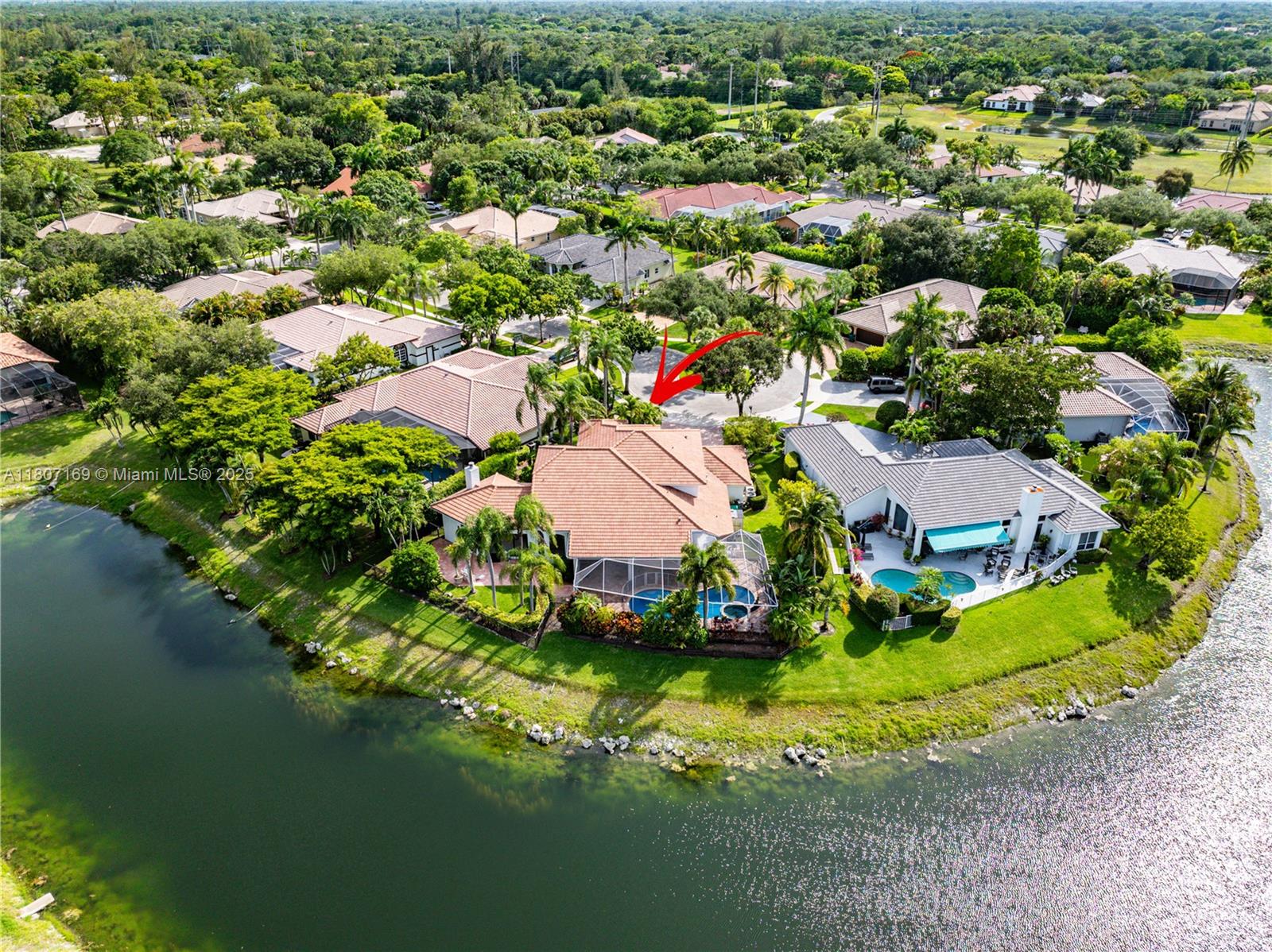 Redefined luxury waterfront residence. Perfectly positioned on a quiet cul-de-sac, it boasts 180 feet of serene water frontage and breathtaking panoramic views. Dramatic, open-concept, features soaring ceilings, striking glass staircase, updated marble floors. The gourmet chef's kitchen is a dream, seamlessly flowing into expansive living and dining spaces—ideal for effortless entertaining. Unwind in the lavish first-floor primary suite. The versatile loft can easily be a 5th bedroom, while the impressive media/rec room offers endless possibilities for fun and relaxation. Outdoors, enjoy both screened and open patios, a sparkling heated salt pool and spa, and lush, meticulously landscaped grounds. Full impact windows and a whole-house generator ensure complete security and comfort.