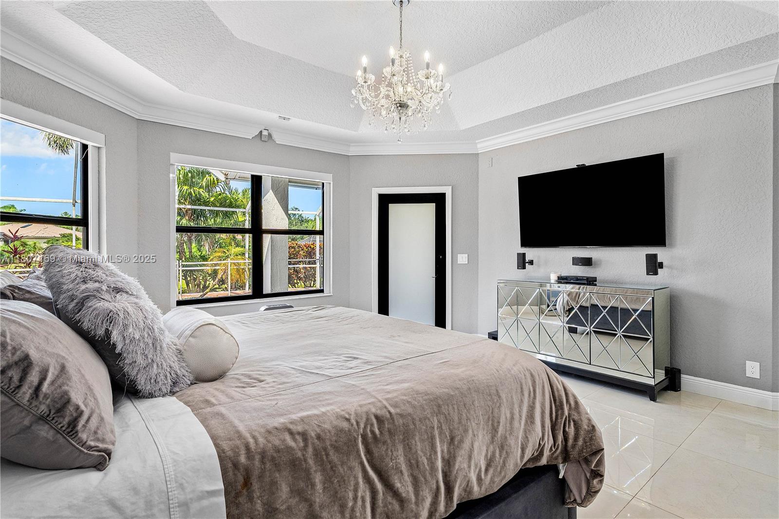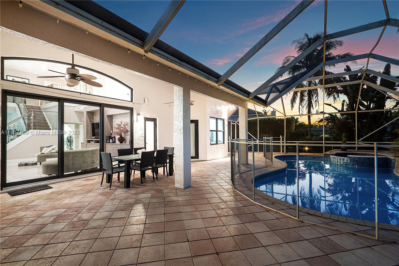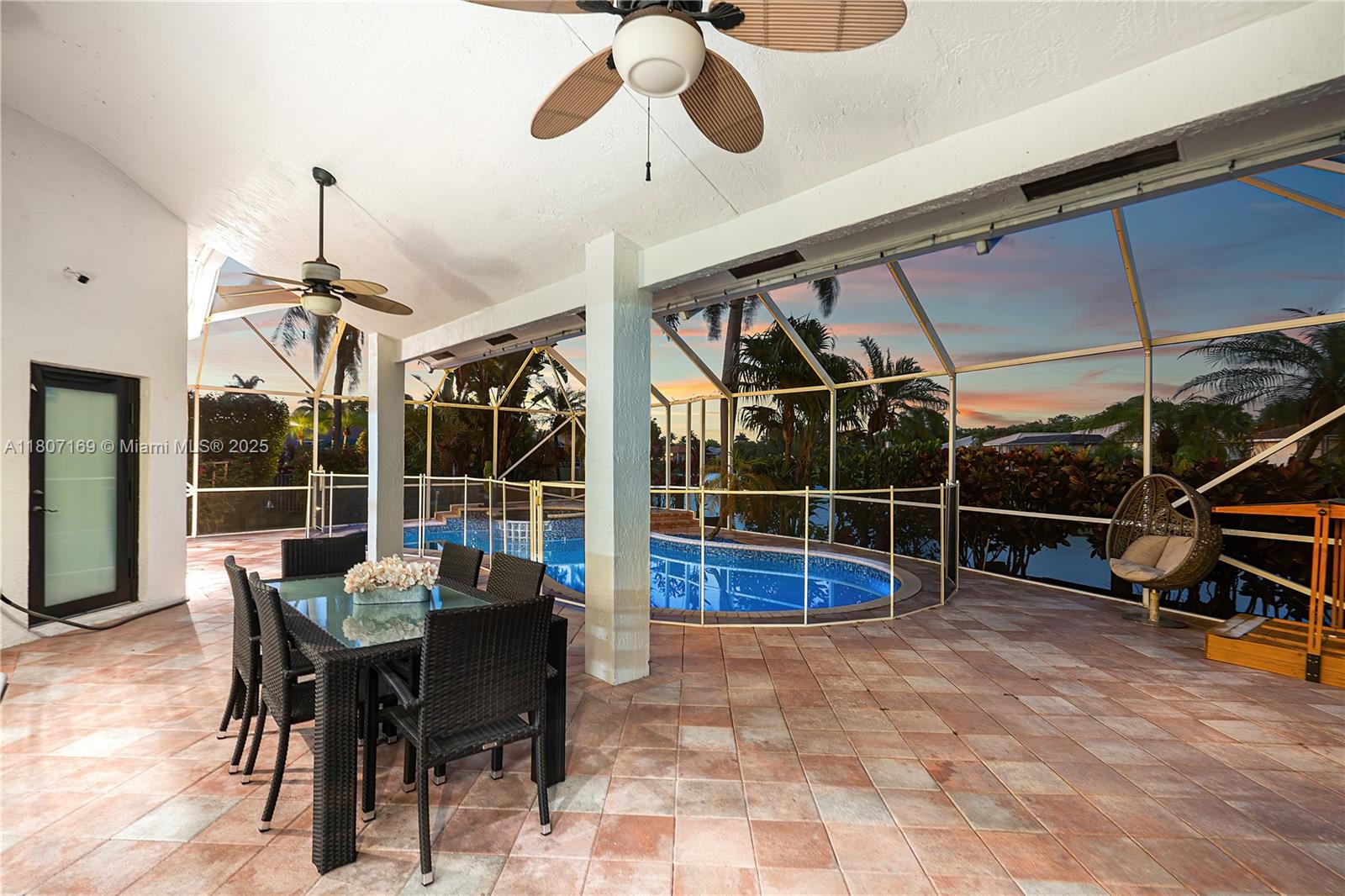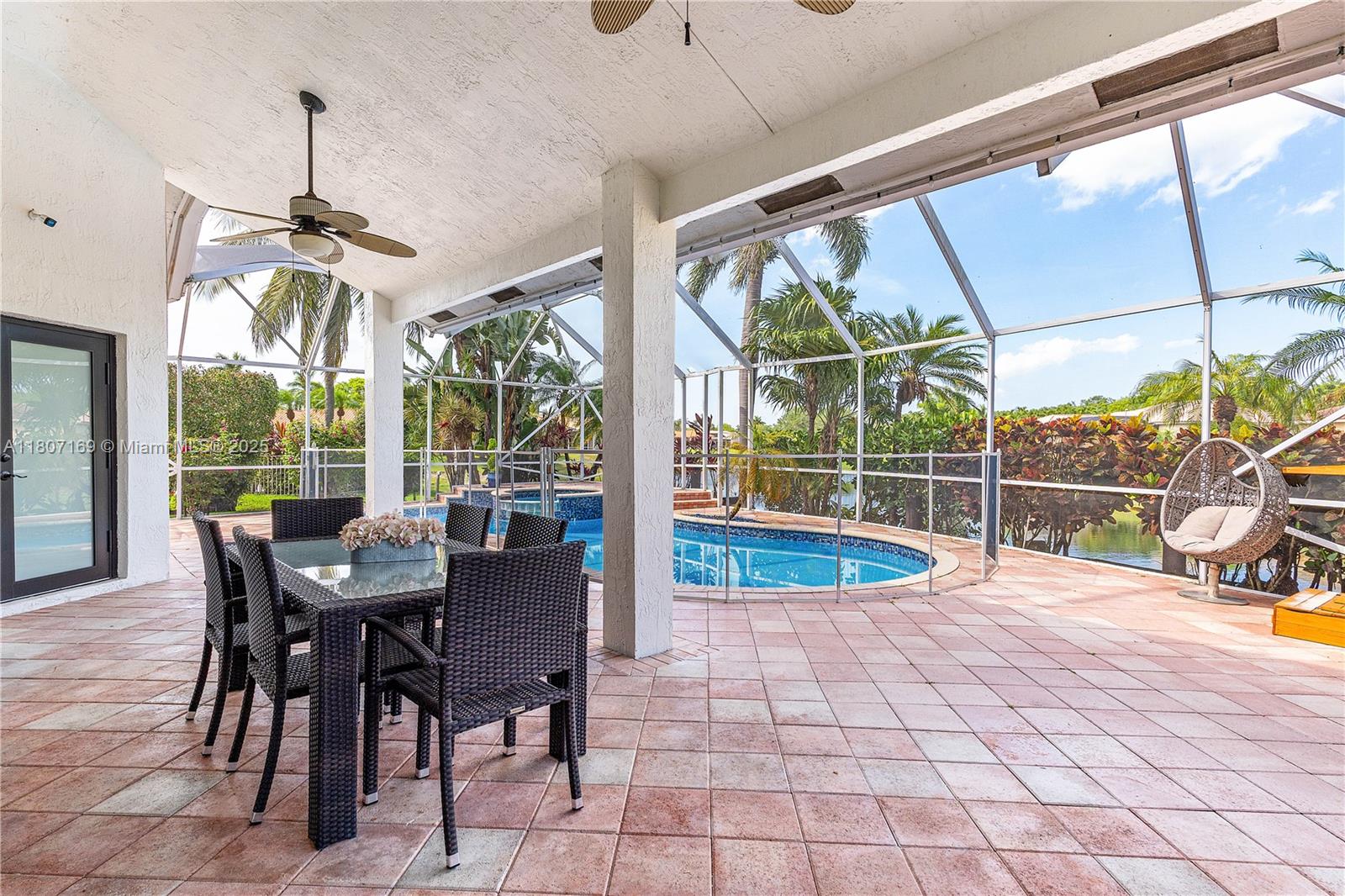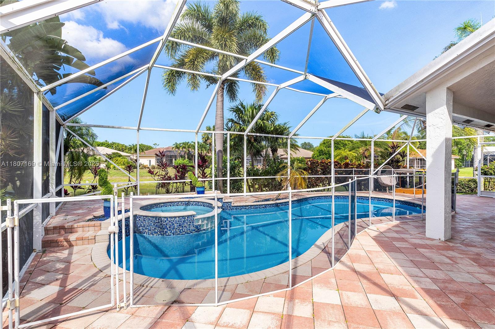 Redefined luxury waterfront residence. Perfectly positioned on a quiet cul-de-sac, it boasts 180 feet of serene water frontage and breathtaking panoramic views. Dramatic, open-concept, features soaring ceilings, striking glass staircase, updated marble floors. The gourmet chef's kitchen is a dream, seamlessly flowing into expansive living and dining spaces—ideal for effortless entertaining. Unwind in the lavish first-floor primary suite. The versatile loft can easily be a 5th bedroom, while the impressive media/rec room offers endless possibilities for fun and relaxation. Outdoors, enjoy both screened and open patios, a sparkling heated salt pool and spa, and lush, meticulously landscaped grounds. Full impact windows and a whole-house generator ensure complete security and comfort.