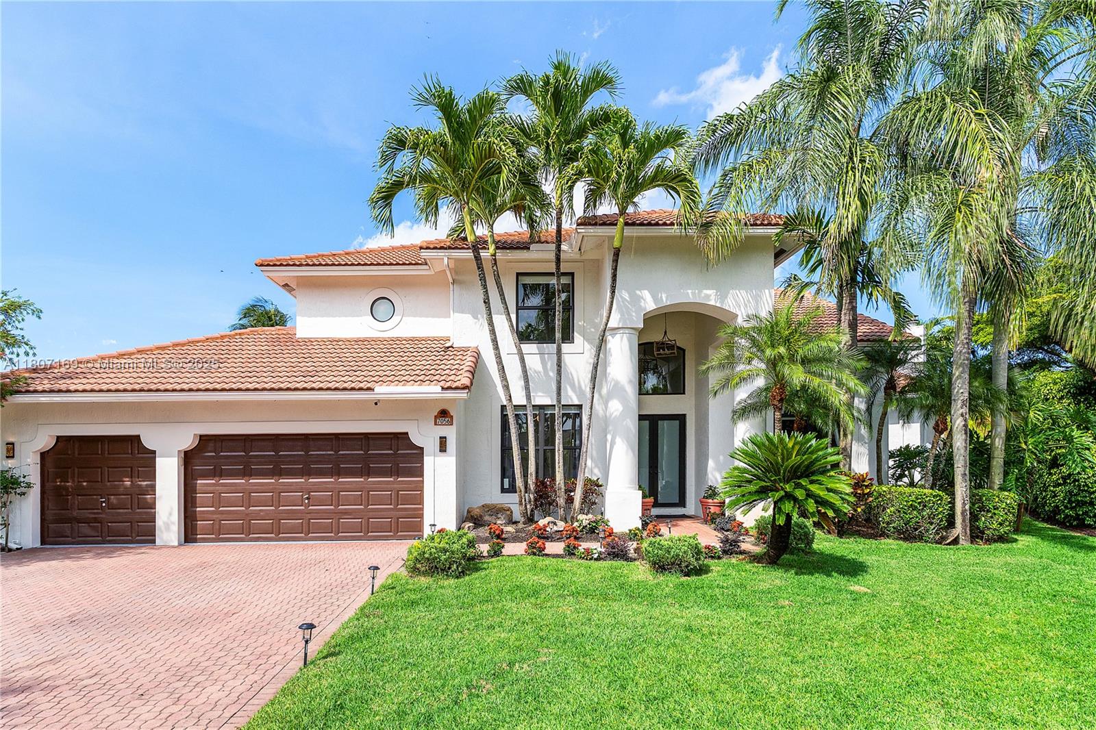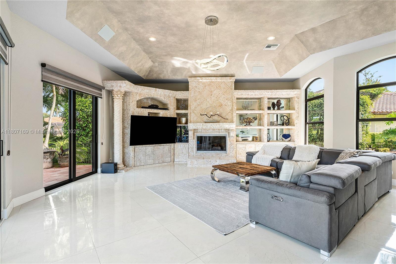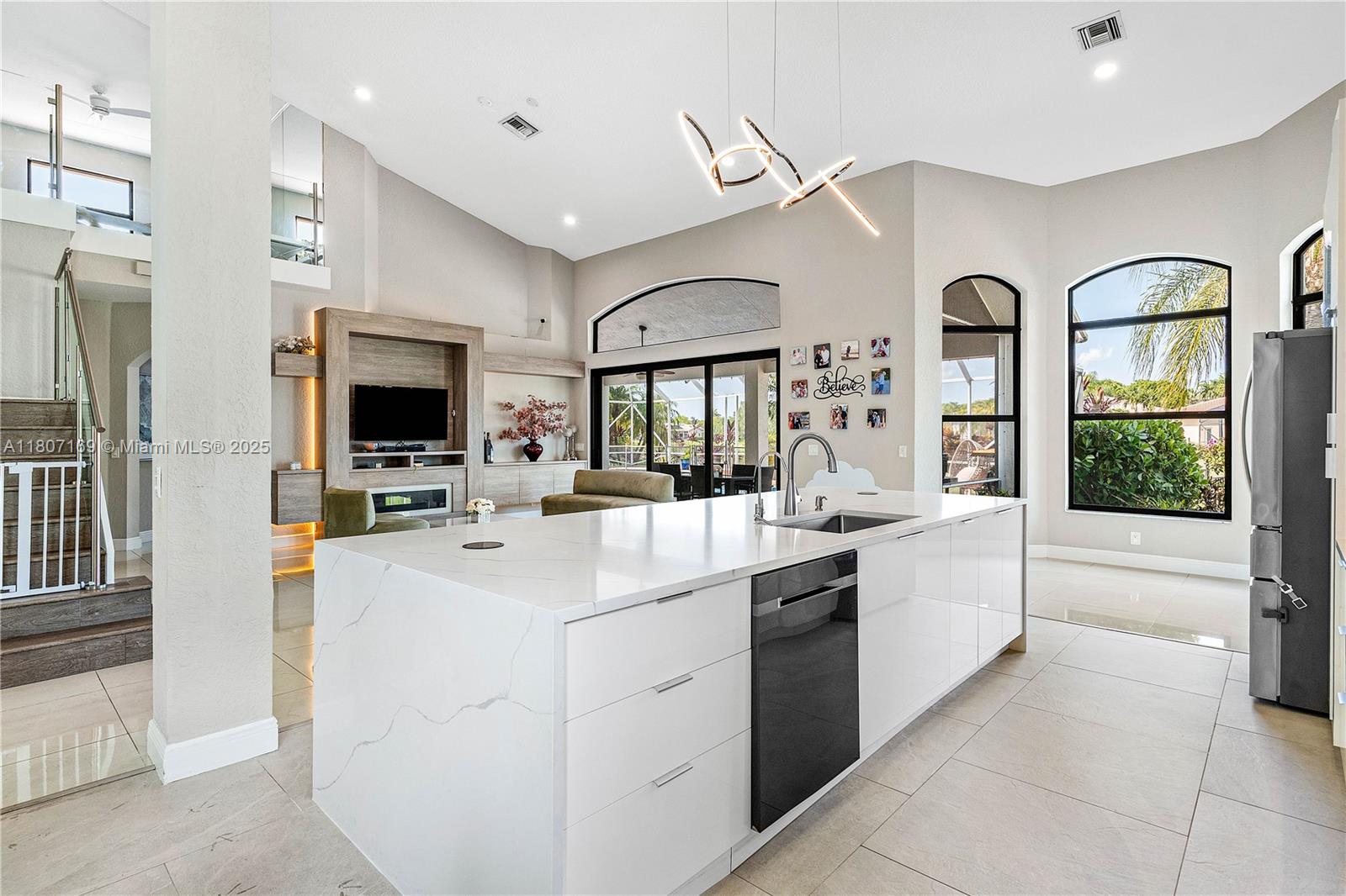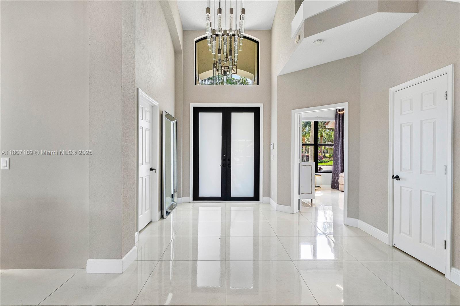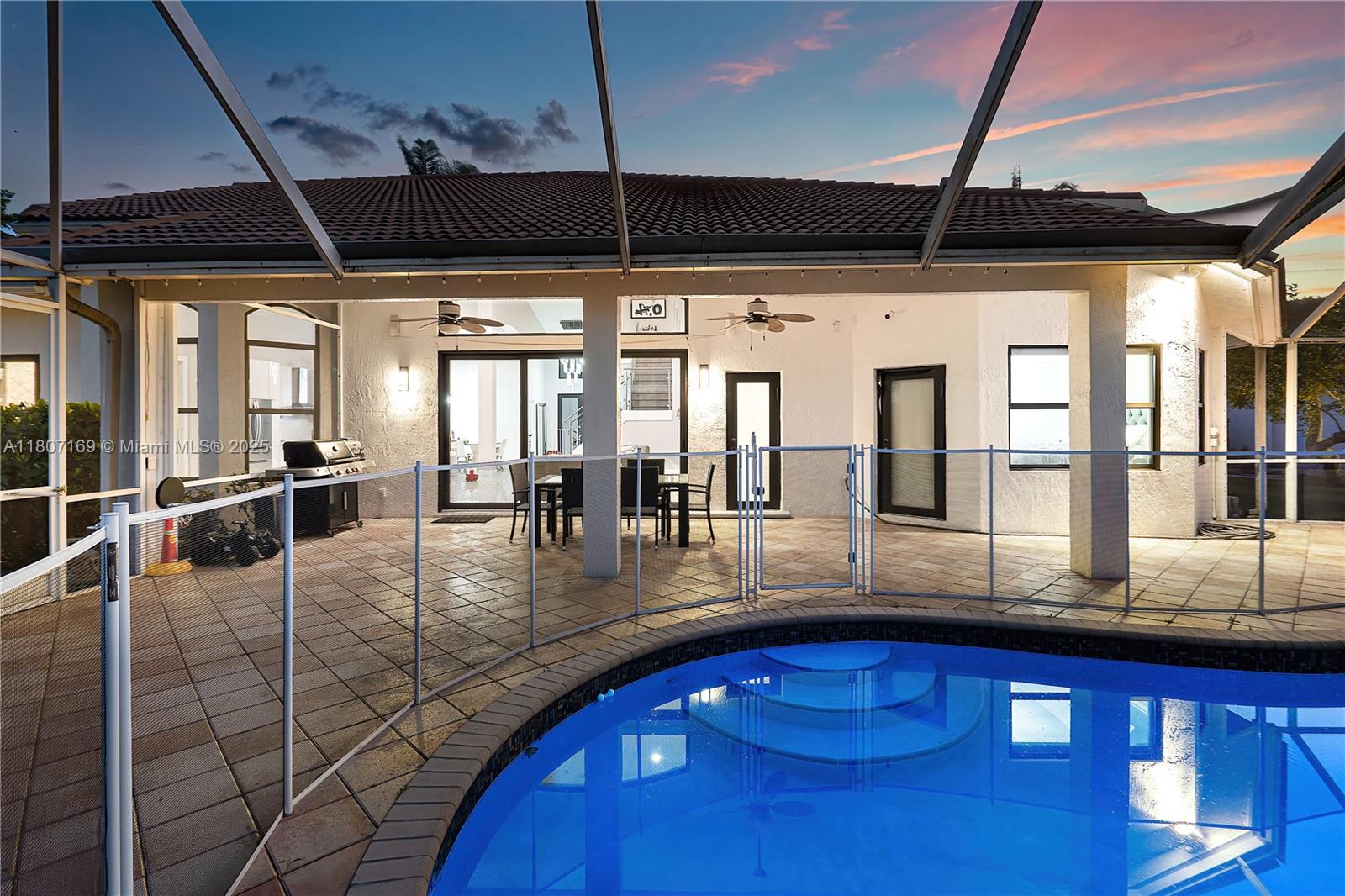 Redefined luxury waterfront residence. Perfectly positioned on a quiet cul-de-sac, it boasts 180 feet of serene water frontage and breathtaking panoramic views. Dramatic, open-concept, features soaring ceilings, striking glass staircase, updated marble floors. The gourmet chef's kitchen is a dream, seamlessly flowing into expansive living and dining spaces—ideal for effortless entertaining. Unwind in the lavish first-floor primary suite. The versatile loft can easily be a 5th bedroom, while the impressive media/rec room offers endless possibilities for fun and relaxation. Outdoors, enjoy both screened and open patios, a sparkling heated salt pool and spa, and lush, meticulously landscaped grounds. Full impact windows and a whole-house generator ensure complete security and comfort.