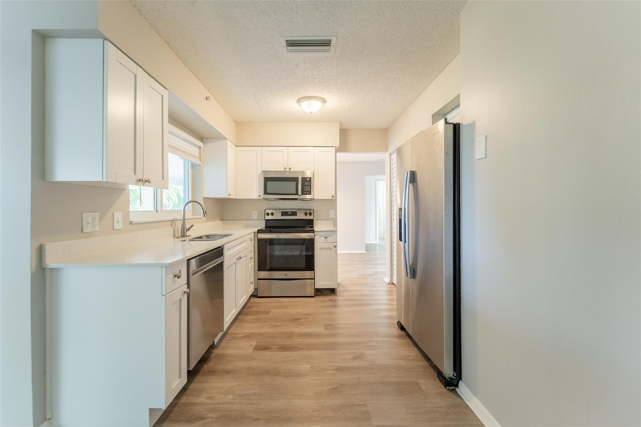 Welcome to this beautifully maintained 1-story home offering 3 spacious bedrooms and 2 full bathrooms. Step inside to an inviting open layout featuring stylish laminate flooring and fresh new interior paint throughout the main living areas. The kitchen is a chef’s delight, showcasing crisp white cabinetry, gleaming granite countertops, stainless steel appliances, and ample prep and storage space. Enjoy relaxing mornings on the welcoming front porch and cozy evenings in the fenced backyard complete with a covered patio—perfect for outdoor dining and entertaining. The primary suite features a private bath, and all bedrooms provide comfortable living spaces. Additional highlights include a dedicated driveway for convenient parking and great curb appeal.
