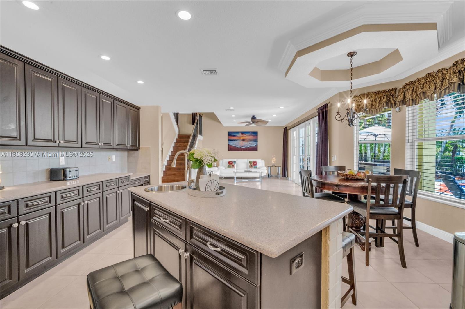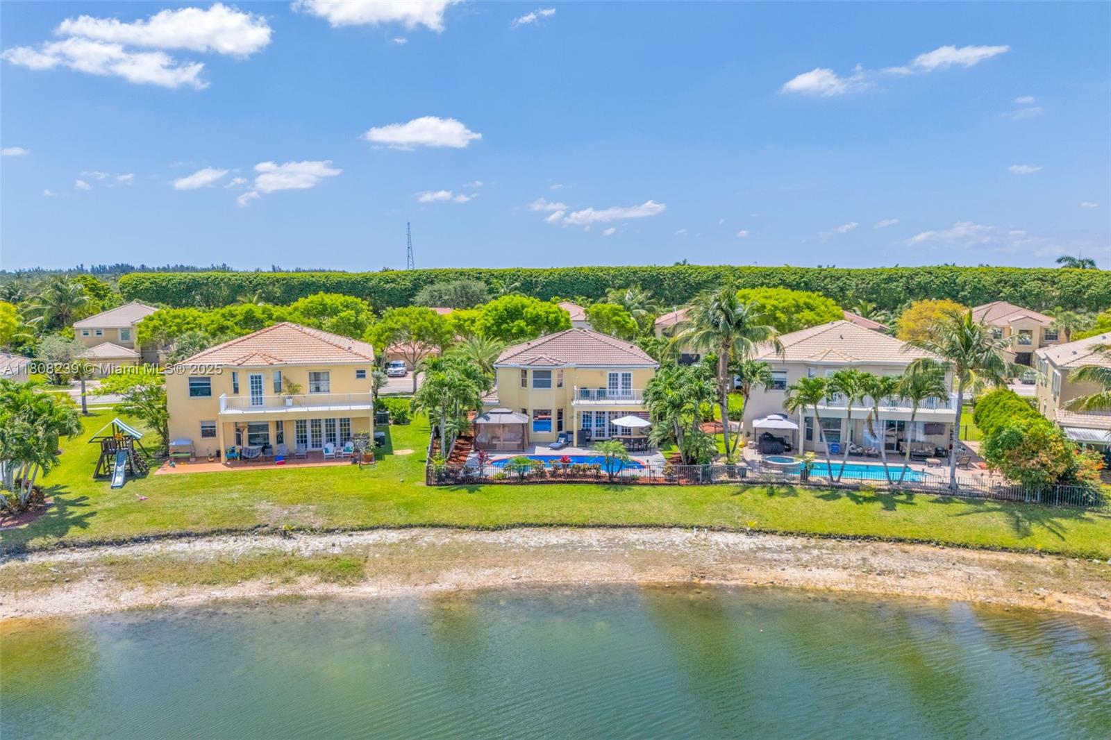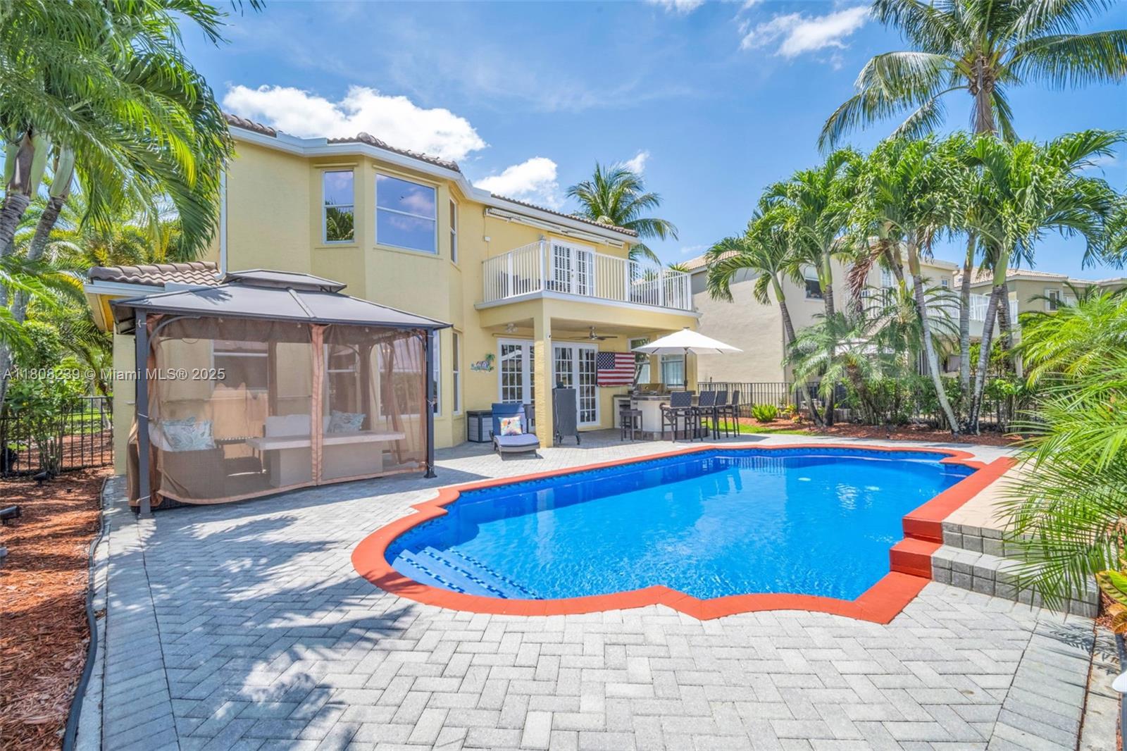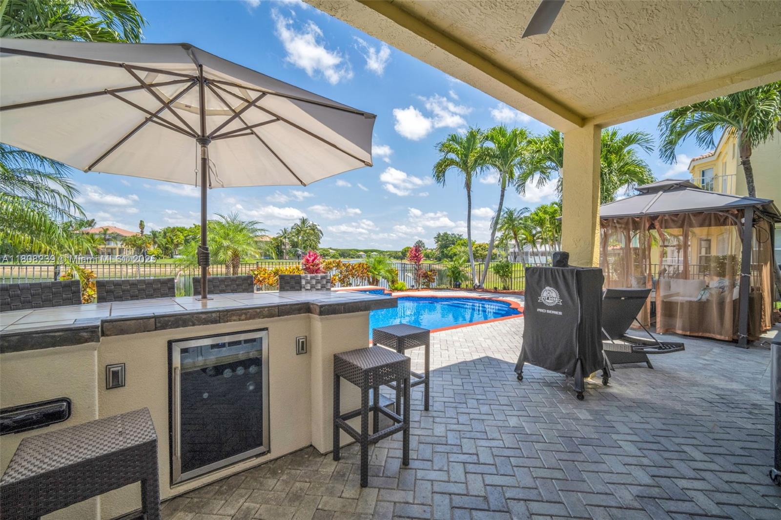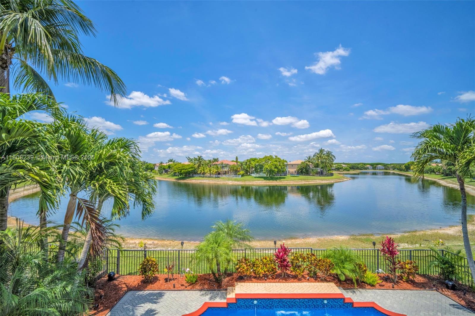 Step into your dream home—where luxury meets tranquility on a breathtaking lakefront setting. Two-story. Oversized lot. Premium upgrades throughout. Designed for luxury living. Gourmet kitchen, Corian countertops, tumbled marble backsplash, center island. Family room french doors open to covered patio with lake views. Spacious master suite with tray ceiling, double-door entry, and private sitting area. Upstairs office with lake view balcony. All bedrooms upstairs. Resurfaced pool-2022. Outdoor kitchen. Power awning and outdoor sound system. Landscaping with lighting. Electronic blinds over French doors. Outdoor gazebo with sofa and fire pit. New roof-2021. 5-ton A/C-2021. Tank-less water heater-2021. Water softener system. A piece of paradise with amazing sunsets. Move-in-ready