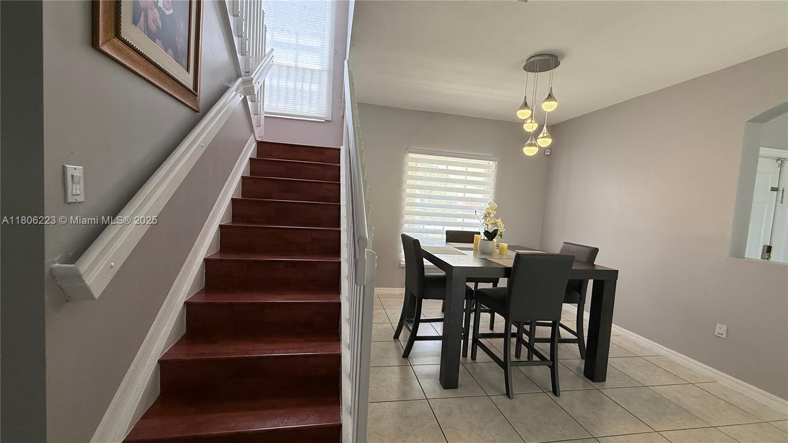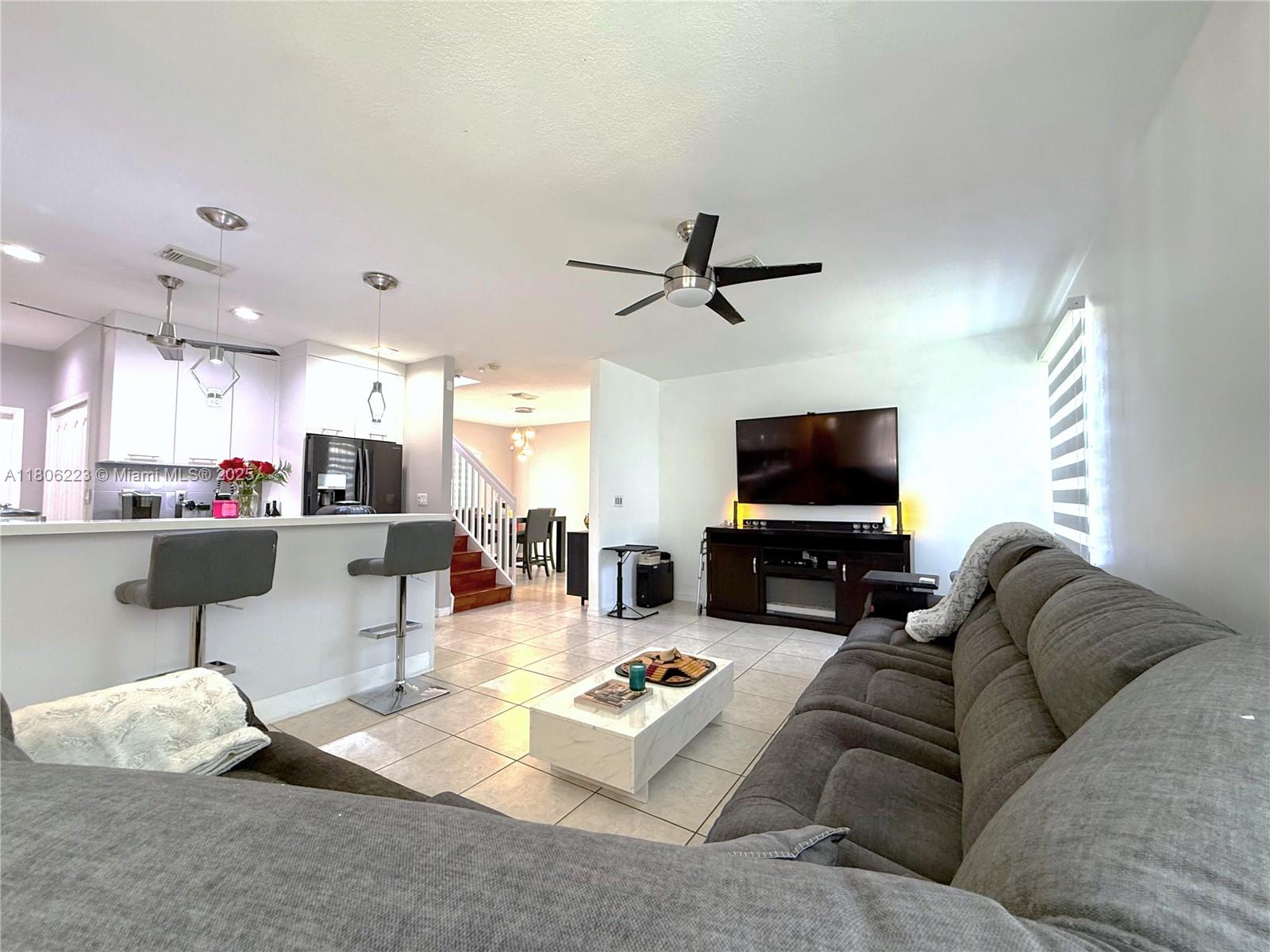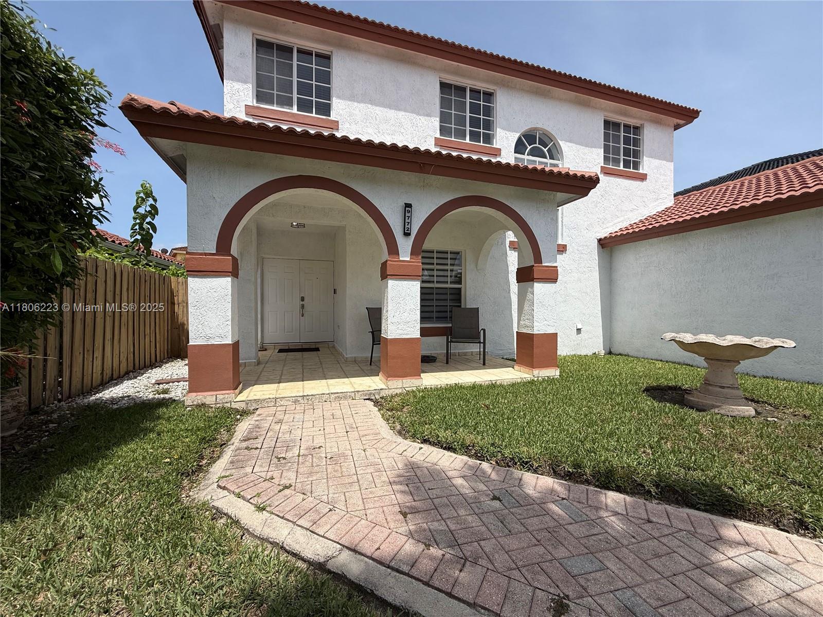 In the sought-after subdivision of Gardens Hills. This Spanish style home features arched doorways and red tile roofing for a classic design. You will be greeted by a generous size formal living and dining room, family room and kitchen combination. Kitchen remodeled with stainless steel appliances, new cabinets and quartz countertop. Bedroom and full bathroom located on the first level. The second level offers three bedrooms, including a master suite with en-suite bathroom, two additional bedrooms, a joining bathroom designed with ample space. Outside the property reveals a large fenced in back yard, perfect size to build a pool. The exterior was painted in 2024.This home has NO HOA. Combine the charm of Miami living, the convenience of being close to shopping, dining and major highways.