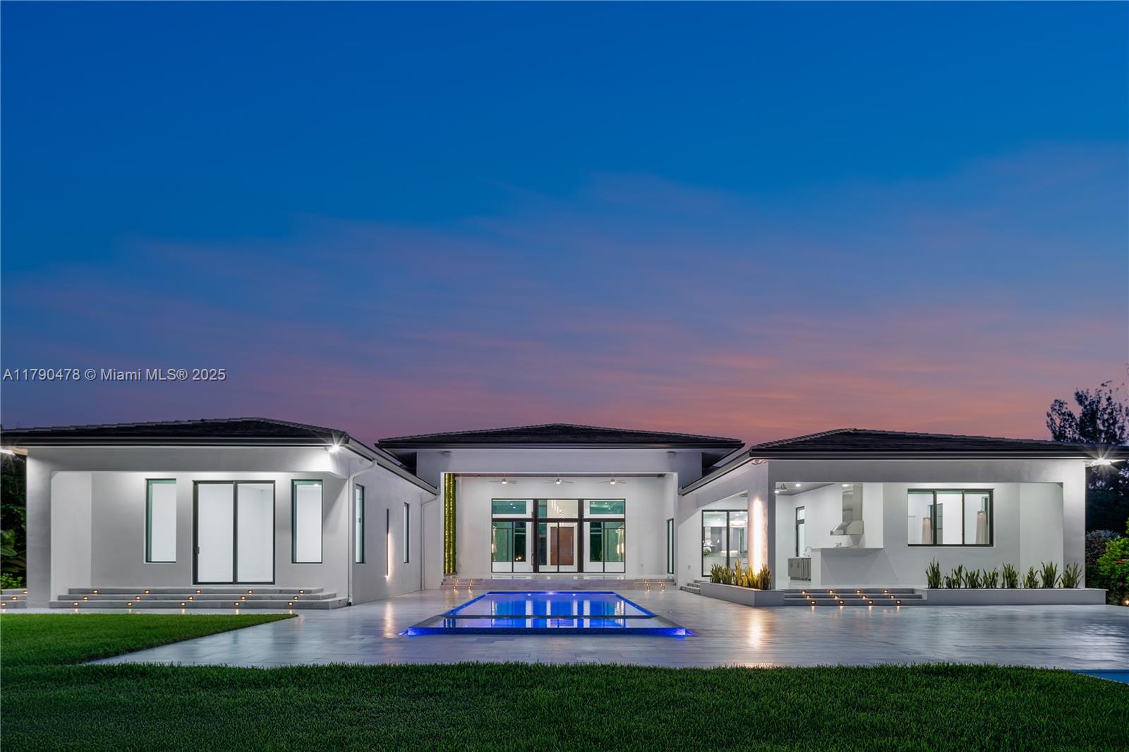 Modern residence in Plantation, FL: contemporary luxury on a private 1.1-acre lot. 5,599 sq ft climate-controlled. A 27-ft porch, 10-ft door, high ceilings, marble floors. 4 bedrooms, including primary suite with spacious closets and expansive shower. Italian-designed kitchen with 7x11 island and THERMADOR appliances. Includes a fully equipped movie theatre, sound system SONOS interior & exterior, spacious office, 3-car garage, 2 covered parking and driveway for up to 6 additional cars. Outside, 48x17 pool with jacuzzi, LED lighting, waterfalls, Viking summer kitchen, and 1,000 sq ft terrace. Tech-ready smart systems and surveillance cameras. High-end design and amenities. Close to AHS school, Supermarket, gas station, Major intersections and highway.