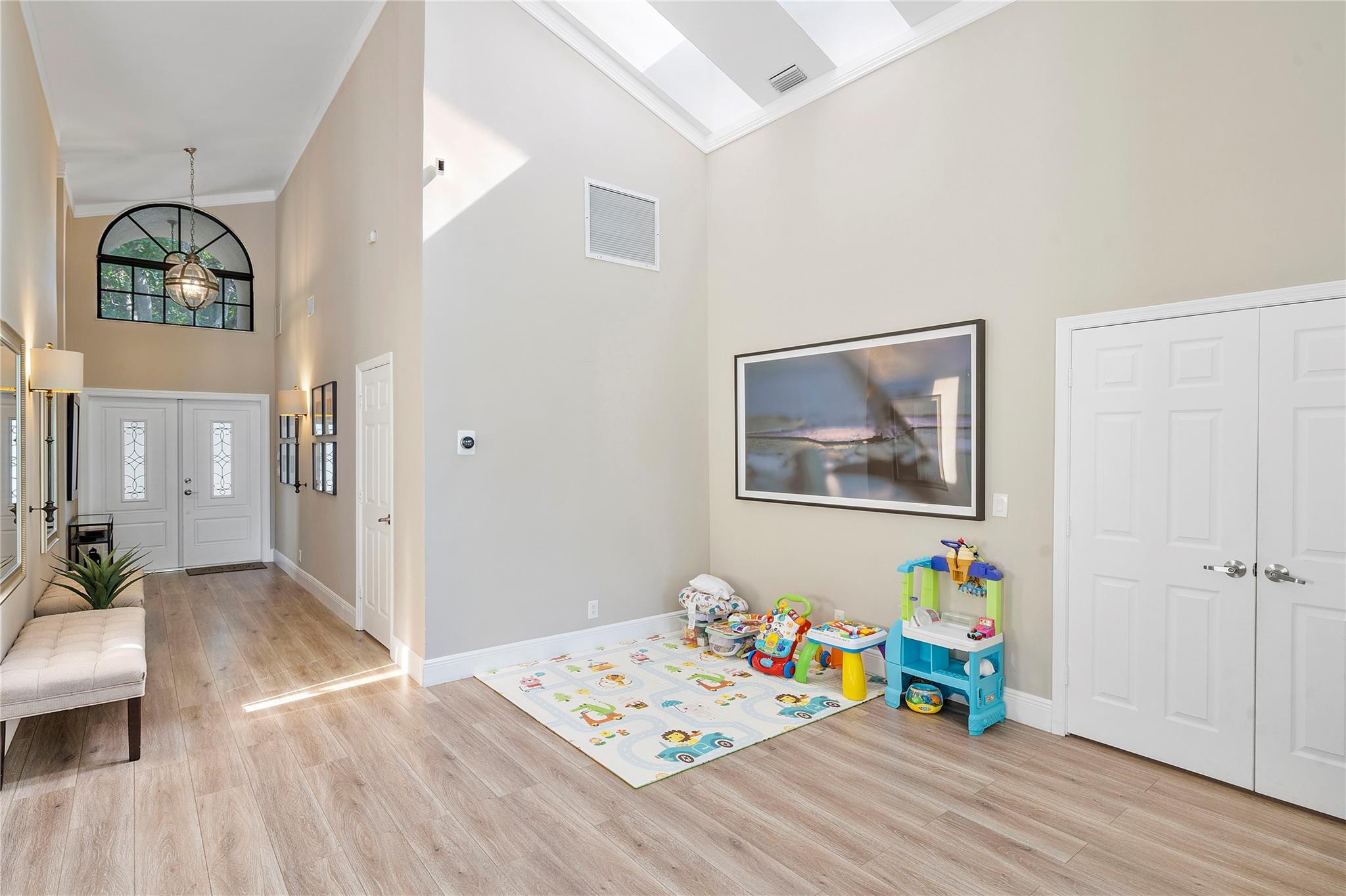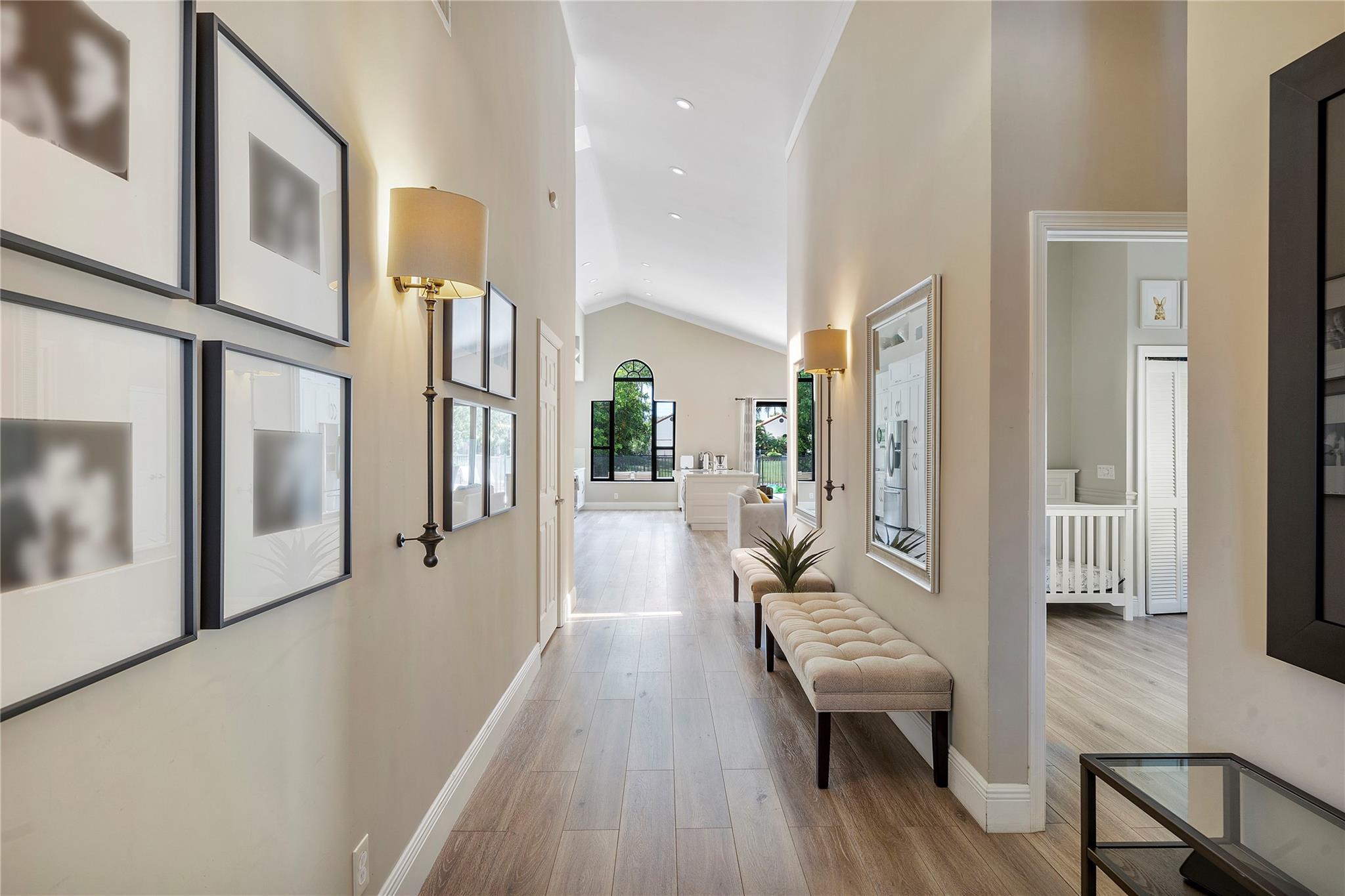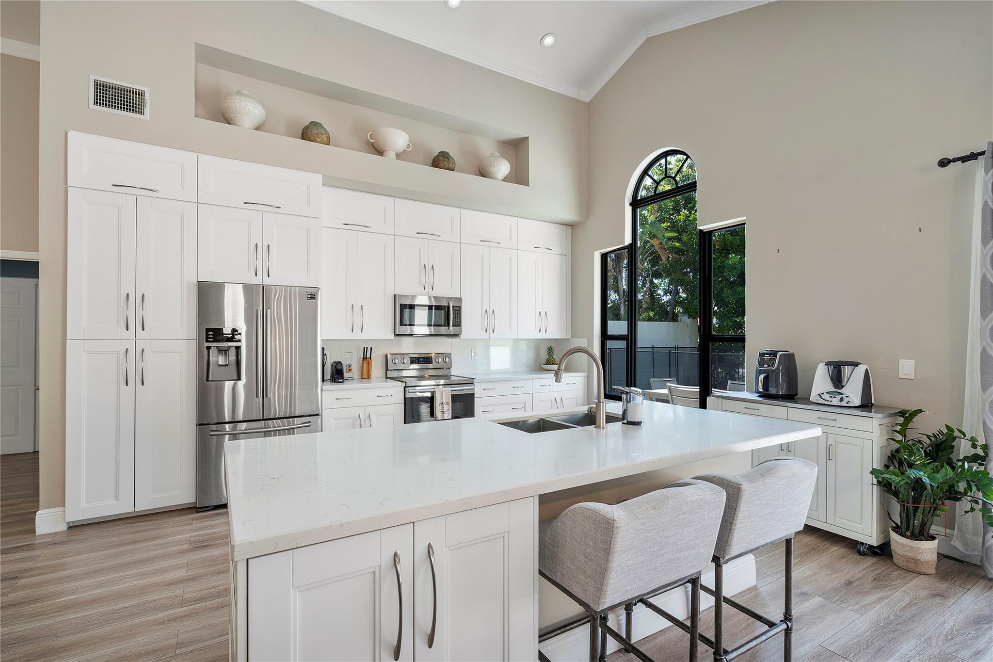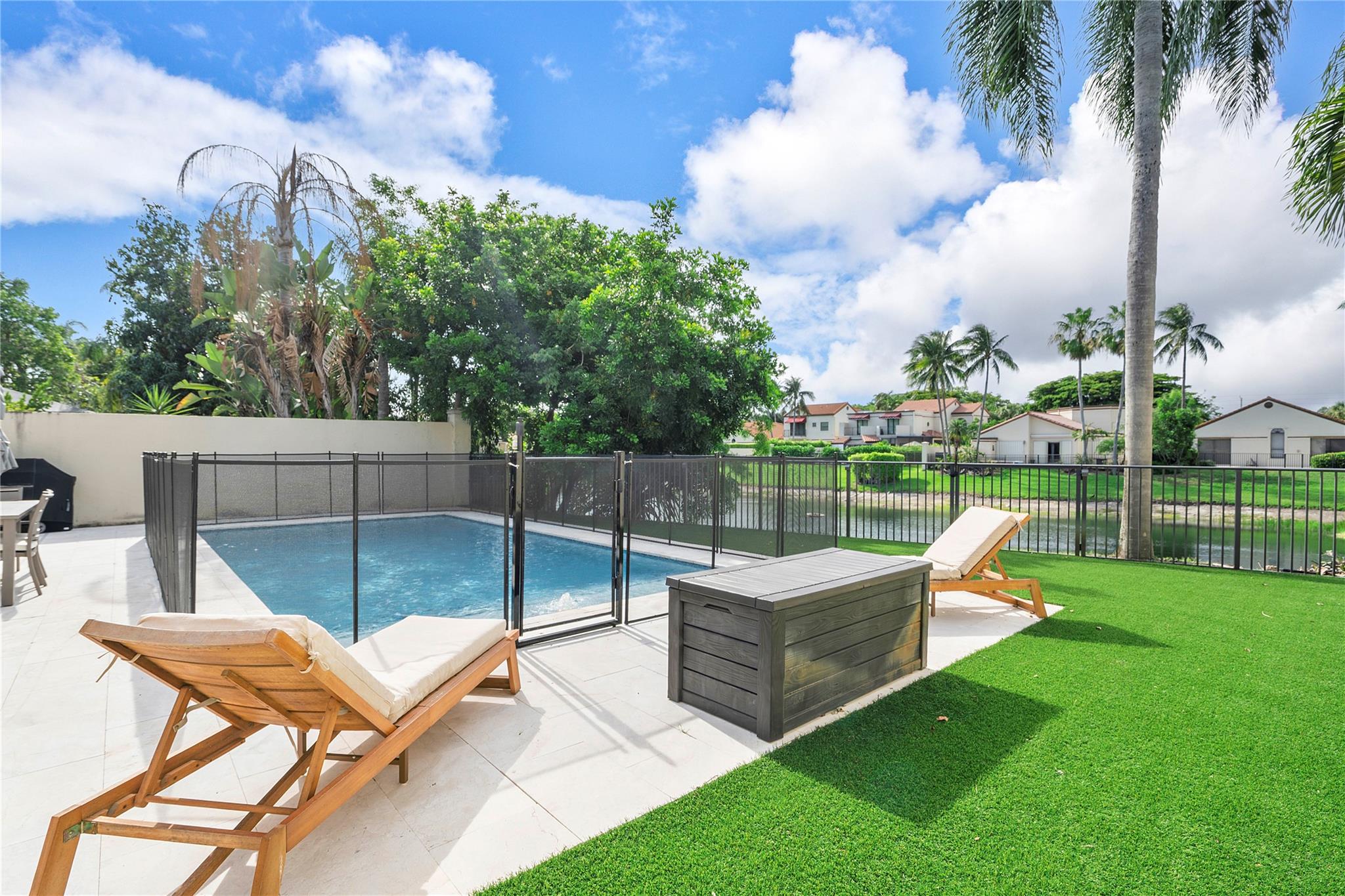This beautifully renovated 3-bedroom, 2-bathroom home is located in the highly sought-after community of Valencia at Boca Pointe. The roof is from 2009, hvac system was replaced in 2022. Interior features an expansive kitchen with white wood cabinetry, sleek white quartz countertops, and premium stainless steel appliances, high-end laminate flooring throughout and upgraded marble bathrooms by Porcelanosa, including a luxurious master bath with a bidet. The home boasts smooth wall and ceiling finishes with crown moldings and wainscot. Impact windows and doors installed in 2020. The private backyard oasis includes a heated, saltwater pool built in 2023 by Van Kirk, with an expansive marble deck, fully fenced yard that features artificial turf throughout the rear outdoor space done in 2023.