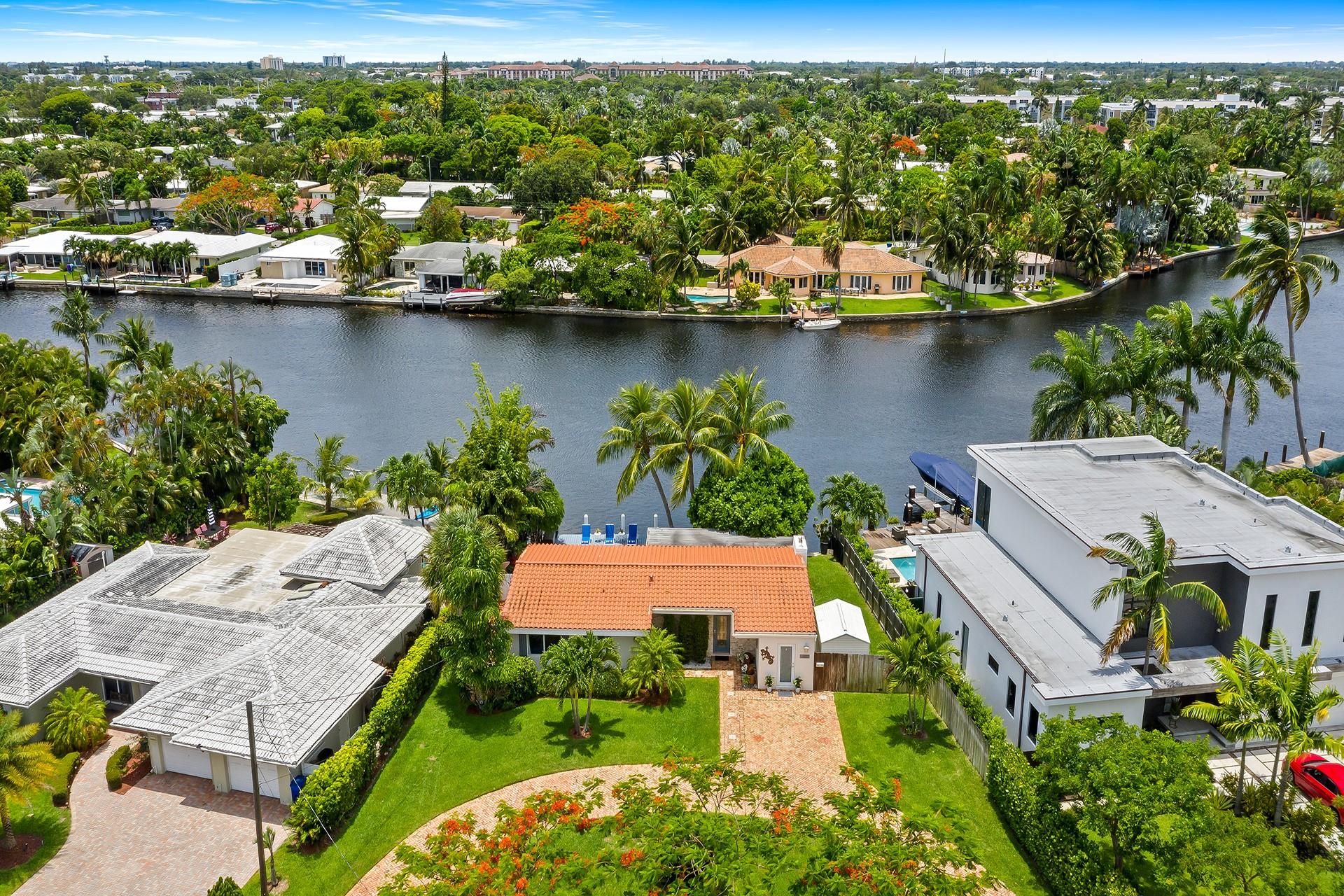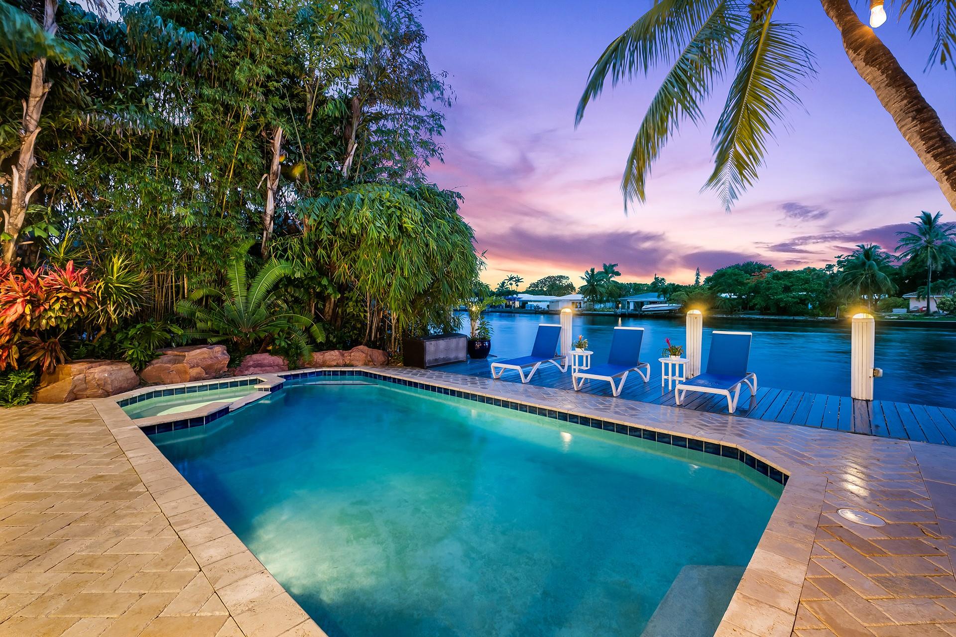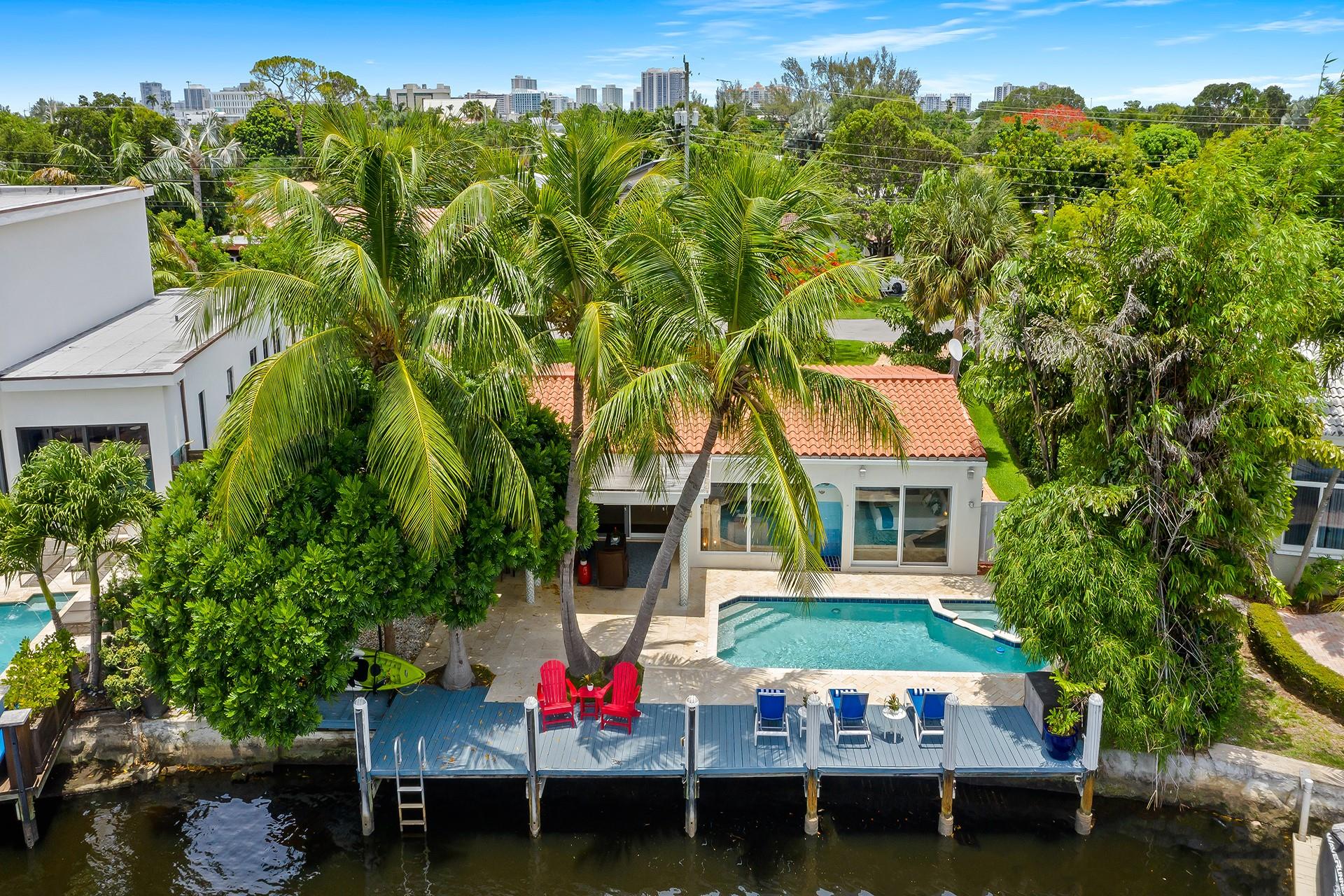 Directly on Middle River in Coral Shores neighborhood. 2-bedroom, 2-bathroom features open-concept with high ceilings, tile flooring, stylish powder blue kitchen and natural light throughout. Covered patio with a built-in grill, private pool, and dock.