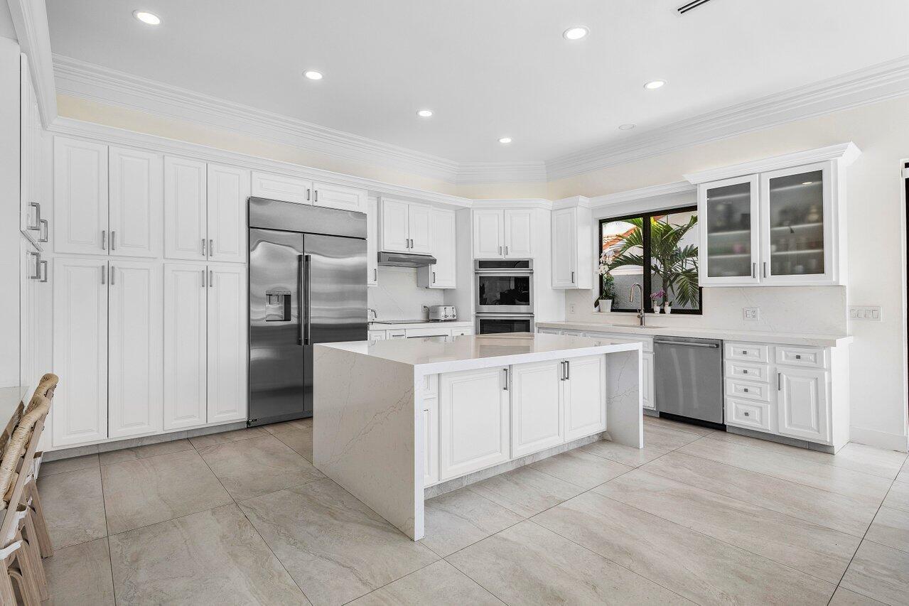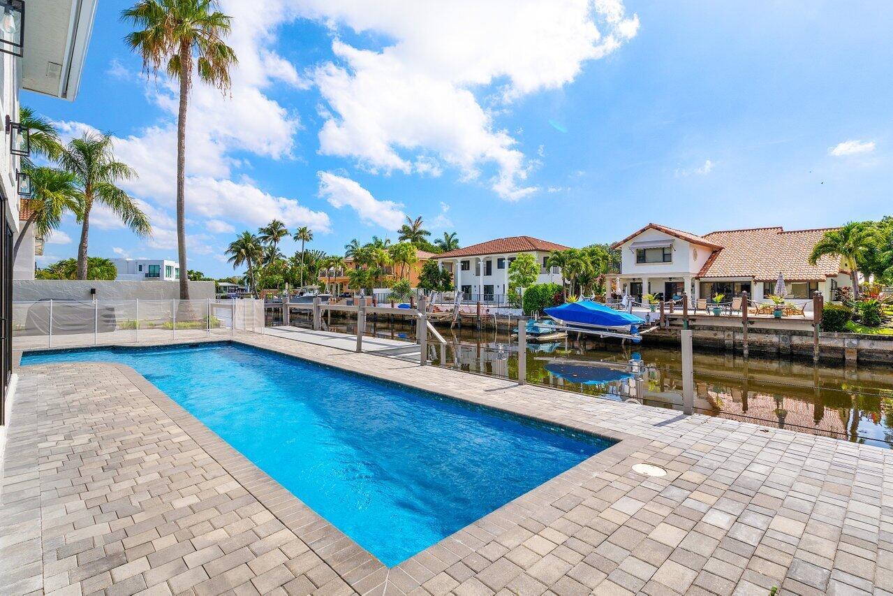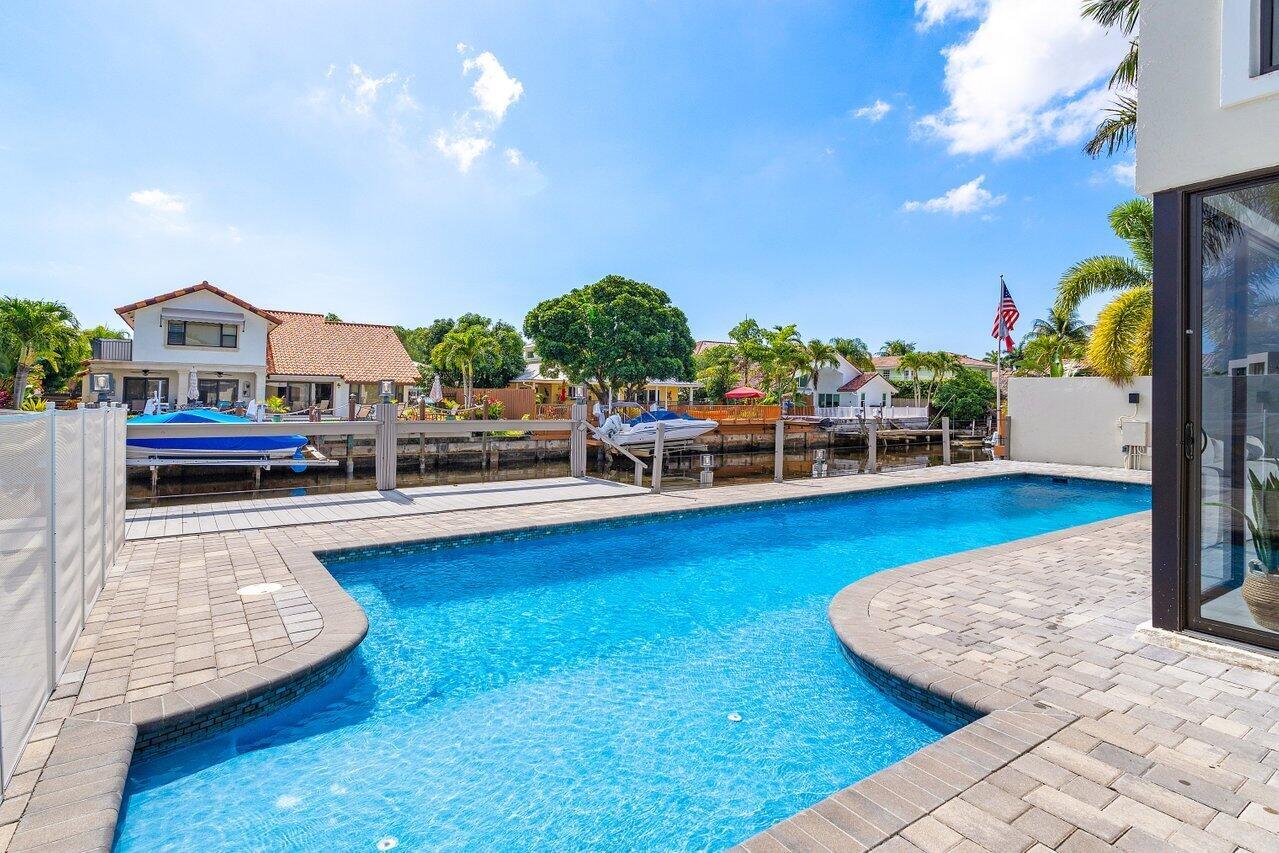 Enjoy Luxury Waterfront living in this Mediterranean Estate home in East Boca Raton. This extraordinary fully renovated 4/4 home features a new roof & impact windows & doors. Walk thru the lushly landscaped private courtyard and as you enter the home you will immediately notice the natural light streaming in, the 2 story living room ceiling & the expansive water views. This home is made for entertaining with a fantastic new wet bar complete w/a built in wine cooler & ice maker & the all white eat in kitchen w/ gorgeous quartz counter tops and bar & new highly upgraded Monogram kitchen appliances. As you step out to the oversized pool & patio you can imagine using your summer kitchen under the pergola & docking your boat at your own private 70 ft. dock.