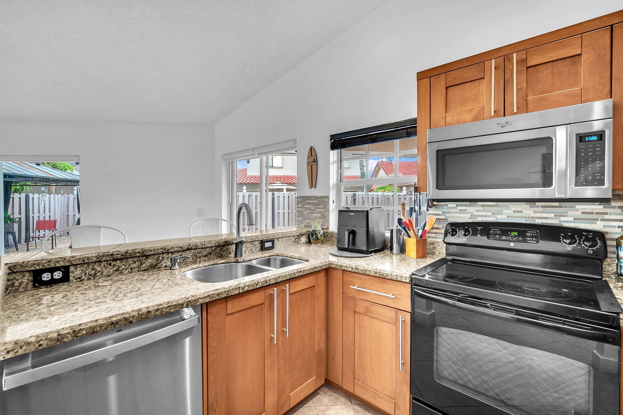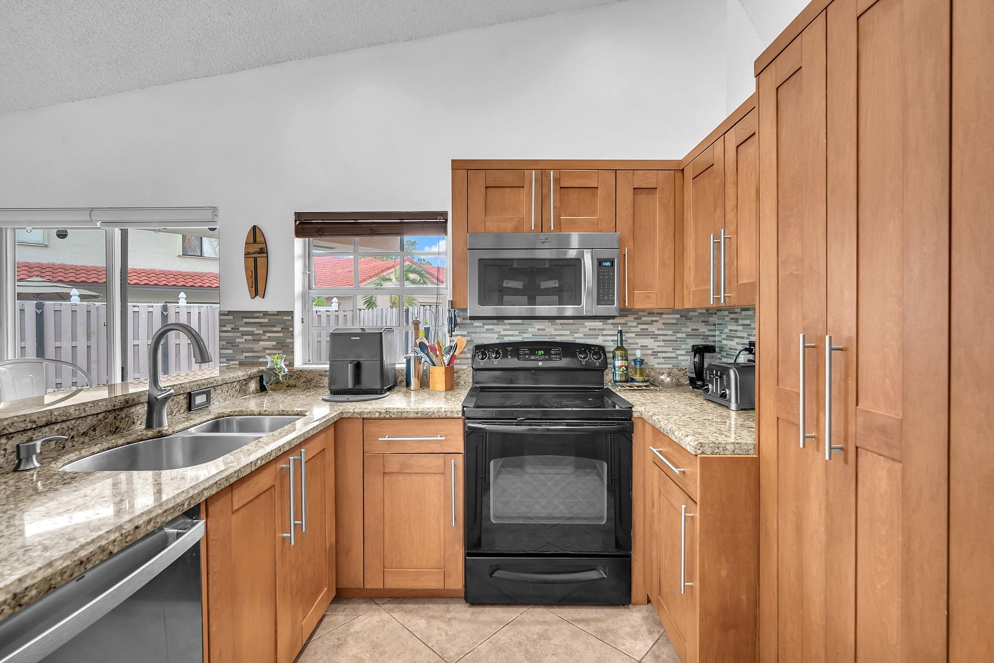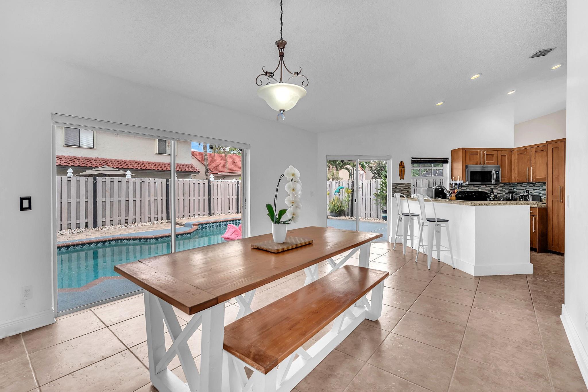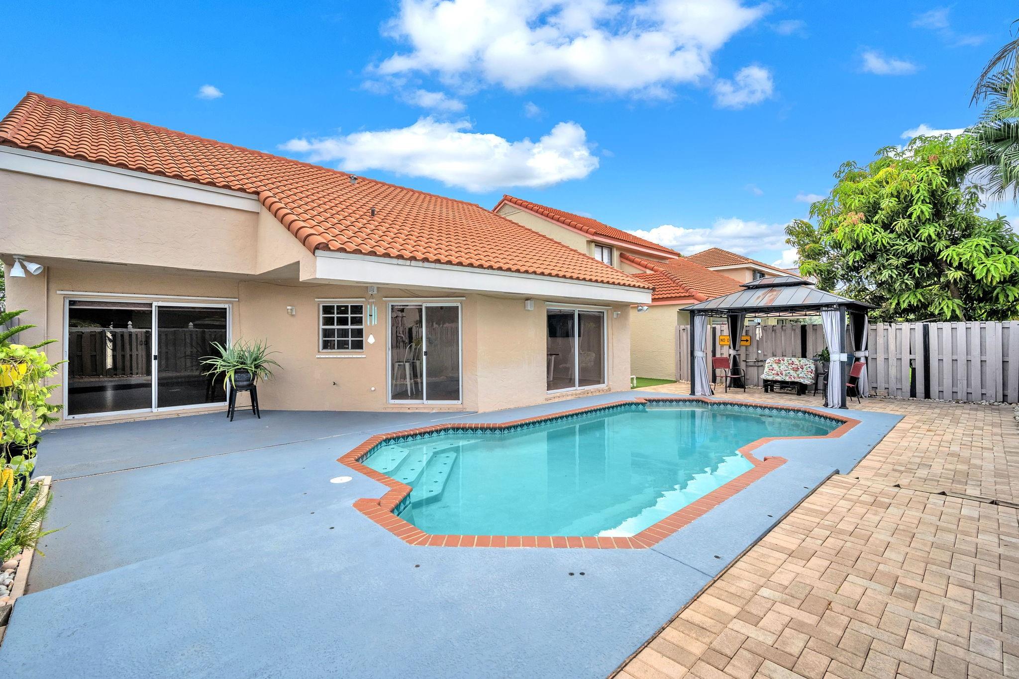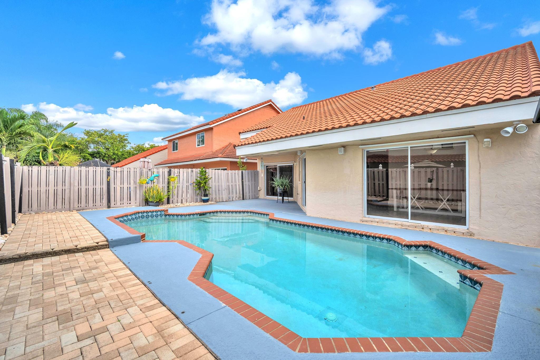 Open concept 3 bed/2 bath w/pool. Step inside to find a naturally light-filled open interior with sliding glass doors opening to a spacious pool deck with a sparkling saltwater pool – perfect for entertaining. The Kitchen has granite counters, updated appliances, recessed lighting and opens into a family/dining room area. The bathrooms feature wood cabinets, granite counters and beautiful tile. A fenced-in yard, astro turf side area, and large pool deck offer ample space to customize and enjoy Florida living. 2012 Roof, Impact front door, Gated community at night. Excellent Location convenient to 595, Sawgrass express & Turnpike.