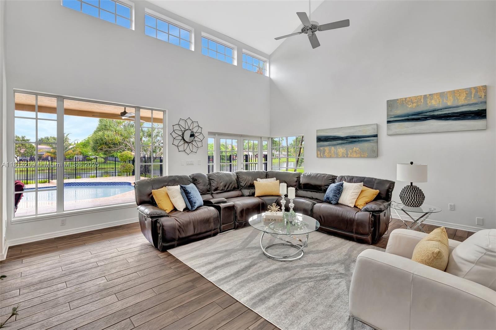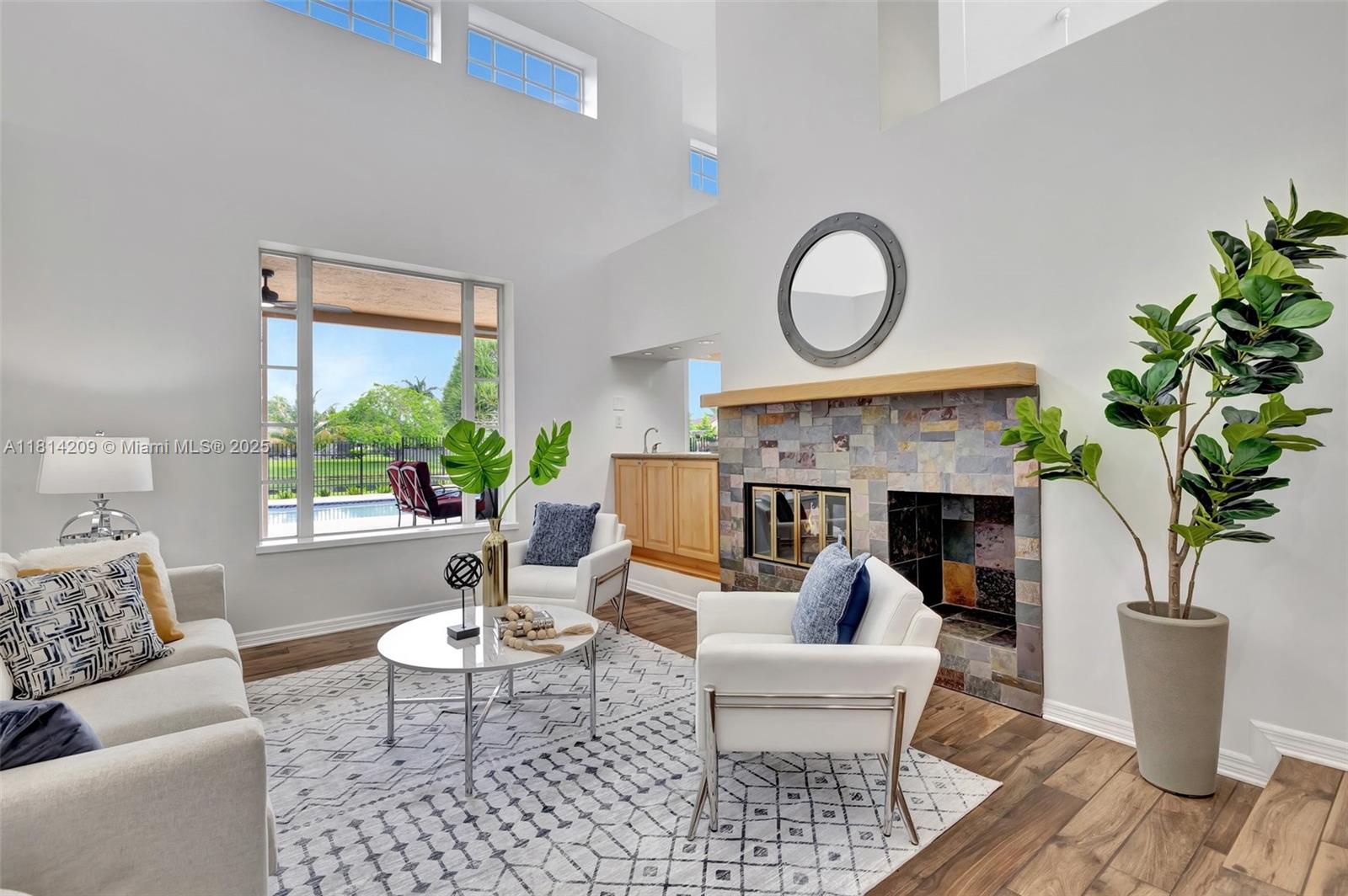 Welcome to your dream home in Whispering Pines! Custom-built trophy property offers exquisite living on 0.8-acre corner lot with saltwater pool & lake views on two sides. Soaring ceilings lead to flowing layout with formal living & dining, fireplace, wet bar, great room & chef's kitchen with gas cooktop, double ovens, granite counters & real wood cabinets. Enjoy saltwater pool with fenced travertine deck & lush landscaping. Impact windows/doors, roof (2021) 2 AC units (2021), modern pavers, substantial updates throughout for comfort and convenience. Primary suite includes French doors, dual walk-ins, and spa-style bath. LED lighting, Ring doorbell, fresh paint, new landscaping, meticulously maintained & located in coveted community with low HOA. Luxury meets charm in the heart of Davie!