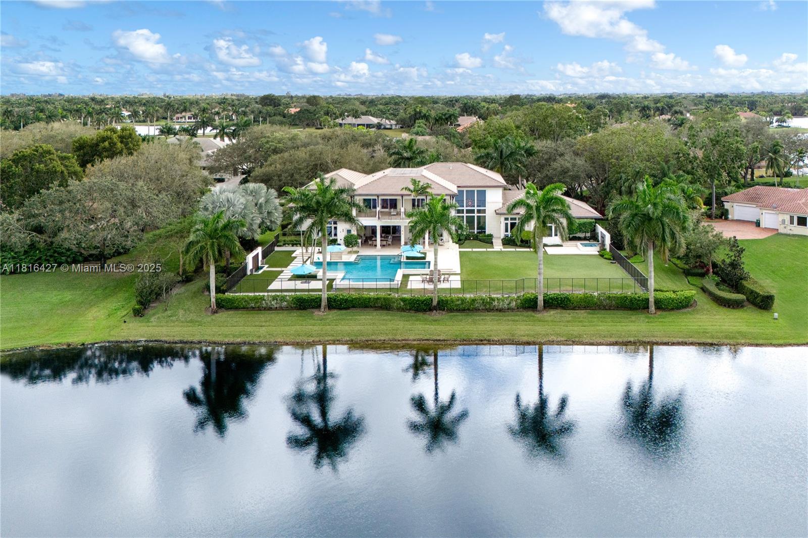 A True Trophy Estate | Designed by acclaimed architect Randall Stofft, nestled within the most exclusive and coveted gated community in Weston, Windmill Ranch Estates. This remarkable 13,876 total SF contemporary masterpiece's great room welcomes you with spectacular views of its expansive yard, resort-sized pool and unparalleled lake panorama. The warm palette of its natural marble flooring throughout, exudes elegance and sophistication. The spectacular Downsview kitchen is equipped with top-of-the-line appliances, with a summer kitchen that provides a seamless indoor-outdoor lifestyle experience. This estate has it all; club room, gym, dual offices, smart home, music room, detached 1,500sf space for custom guest house, and much more. Completed in 2017. 225' water frontage.