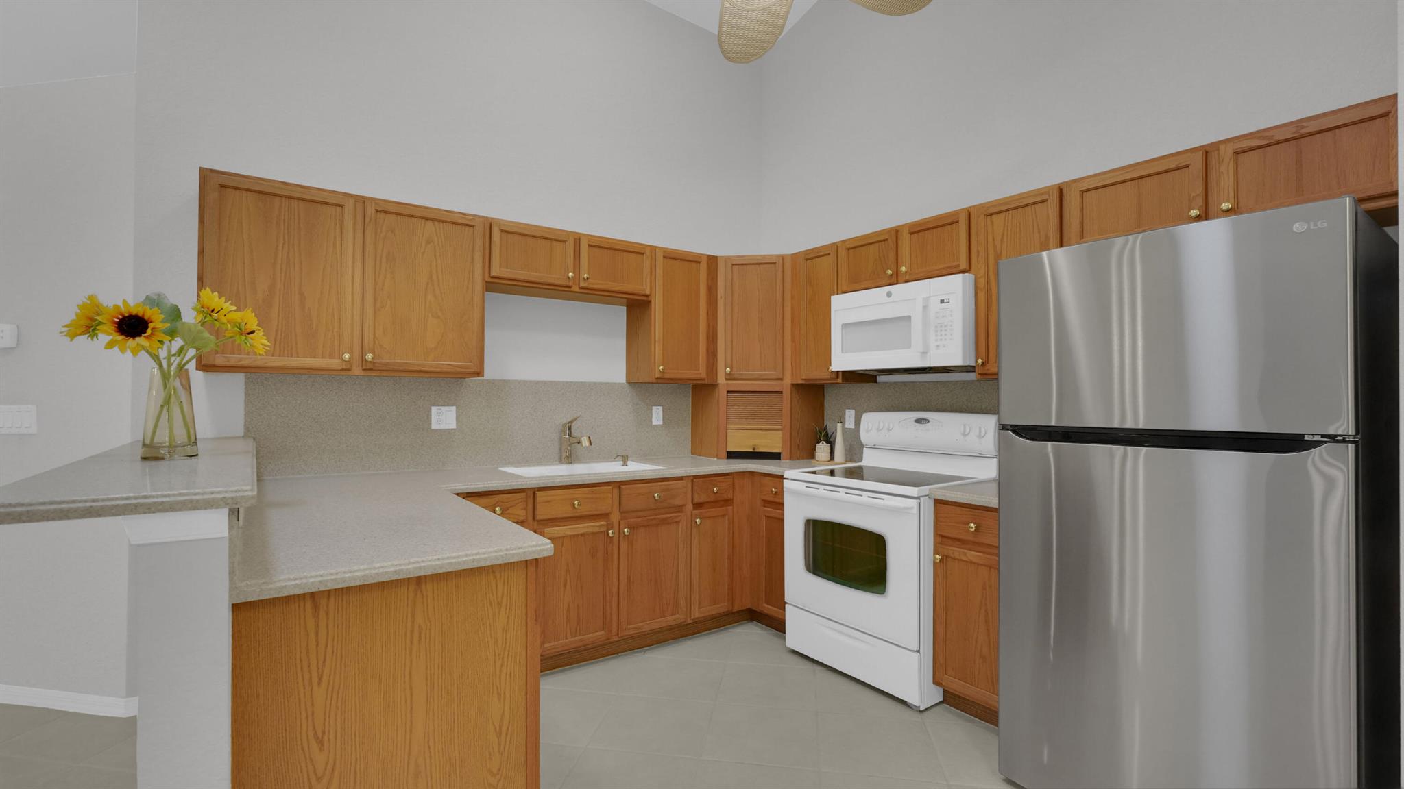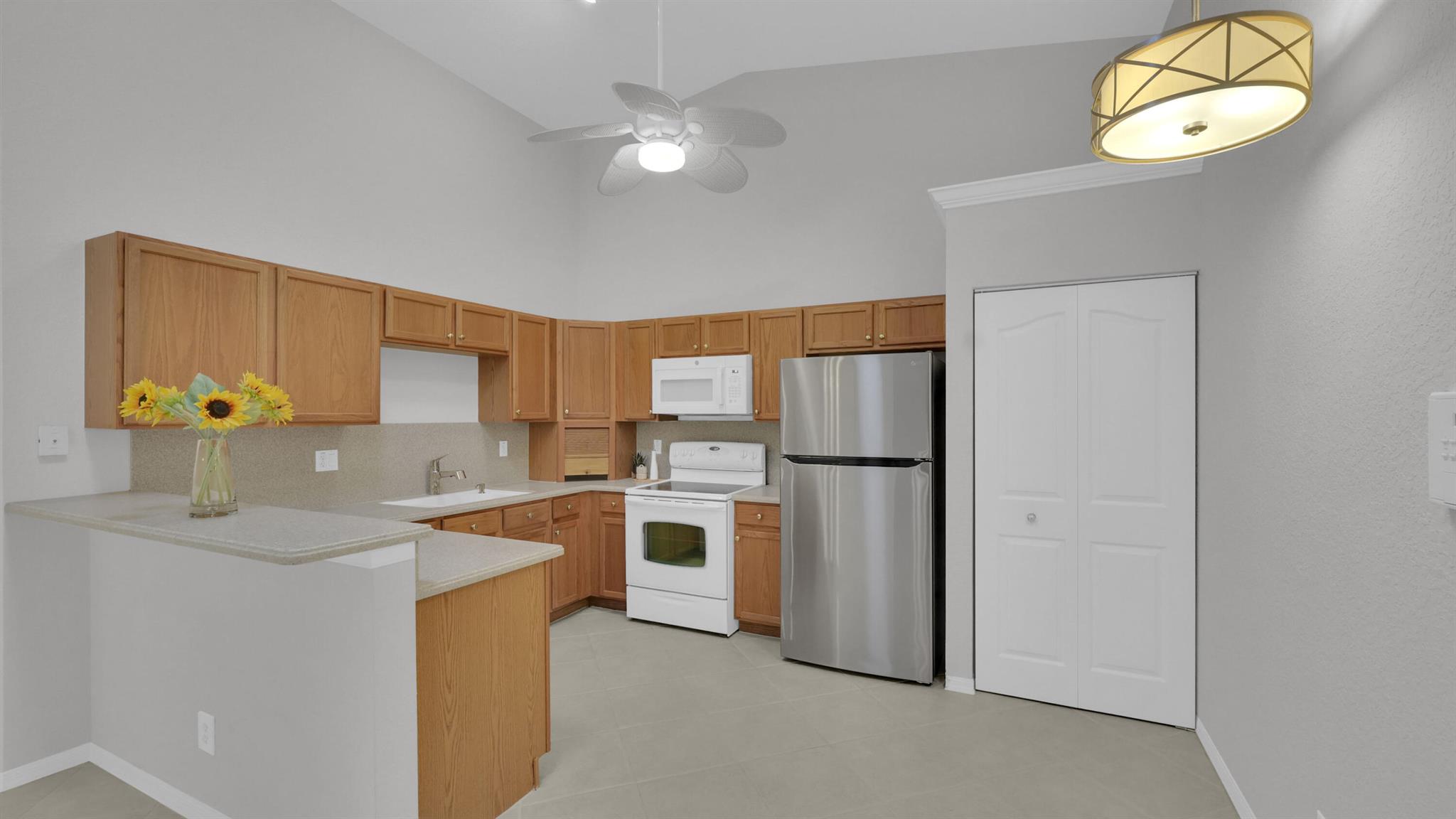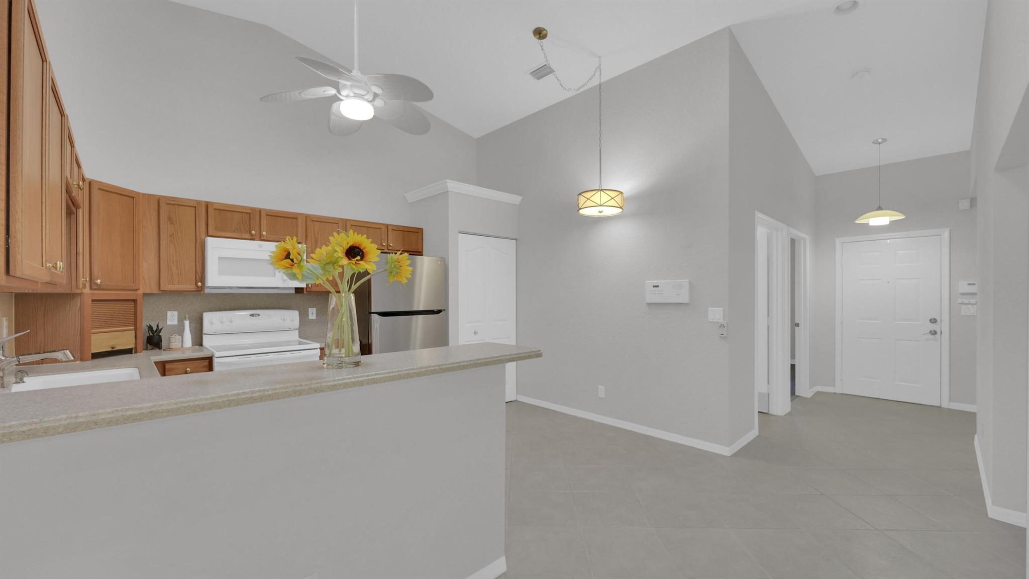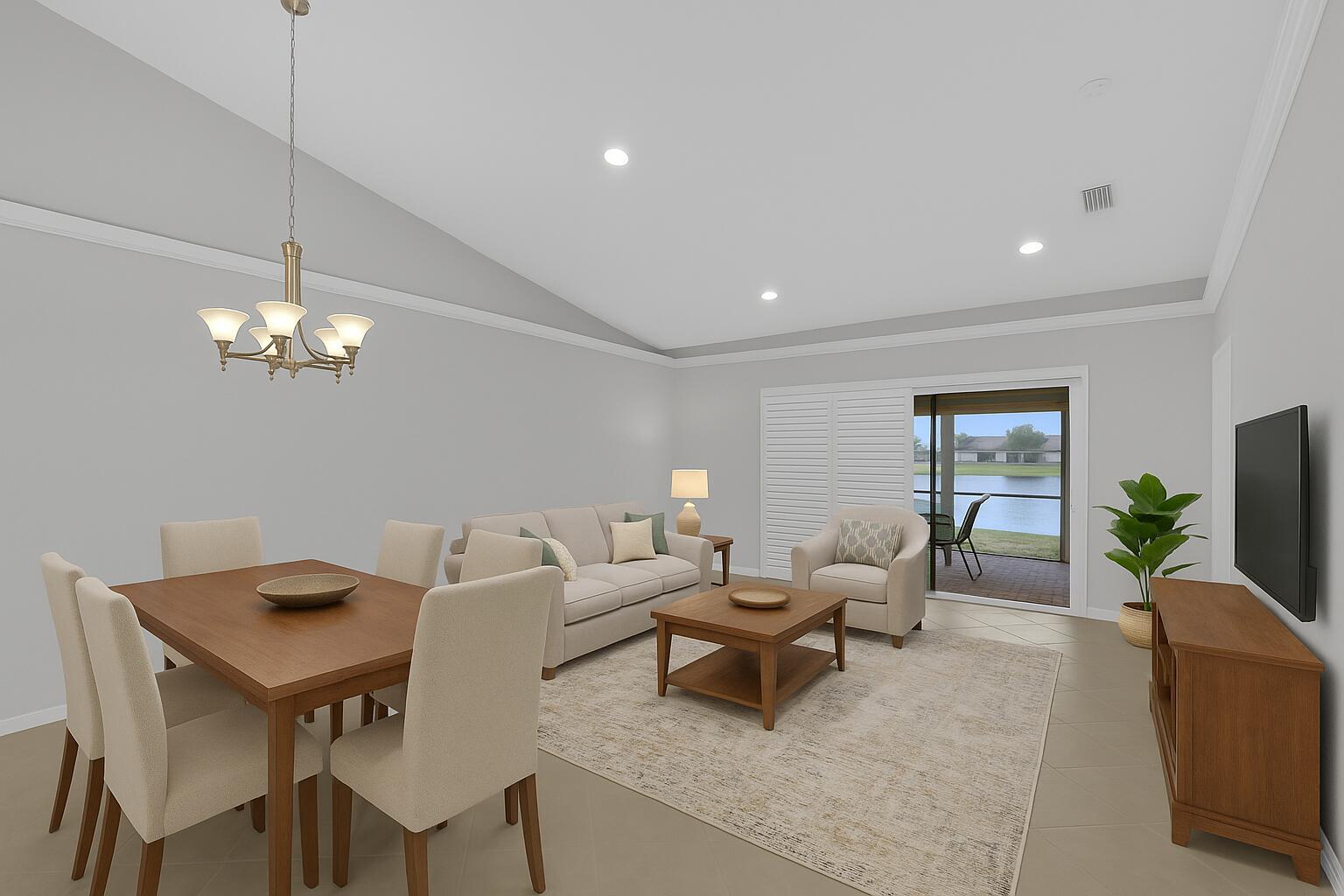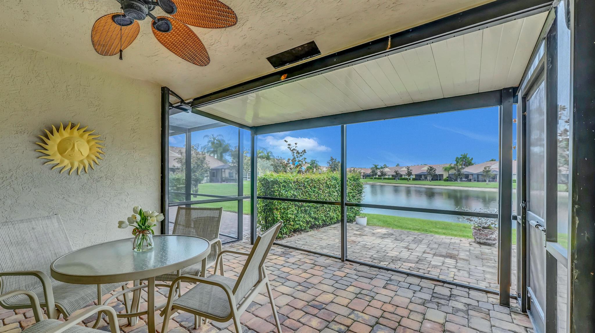 Welcome to Baywinds, a premier 55+ community known for its resort-style amenities. This beautifully maintained 2 bedroom, 2 bathroom + den townhouse with a 1 car garage is ideally located in Bridgeport; directly across the street from the clubhouse. Enjoy peace of mind with a BRAND NEW roof (2024), impact glass throughout, and a tankless water heater. Vaulted ceilings, crown molding, and plantation shutters add timeless character and charm. The light-filled open layout makes the home feel spacious and inviting, perfect for both relaxing and entertaining. Enjoy a screened-in patio overlooking the lake. Baywinds offers a 24 hr manned security gate, three pools, tennis and pickleball courts, fitness center, aerobics, crafts and more! ADT security, internet, cable, phone all included.