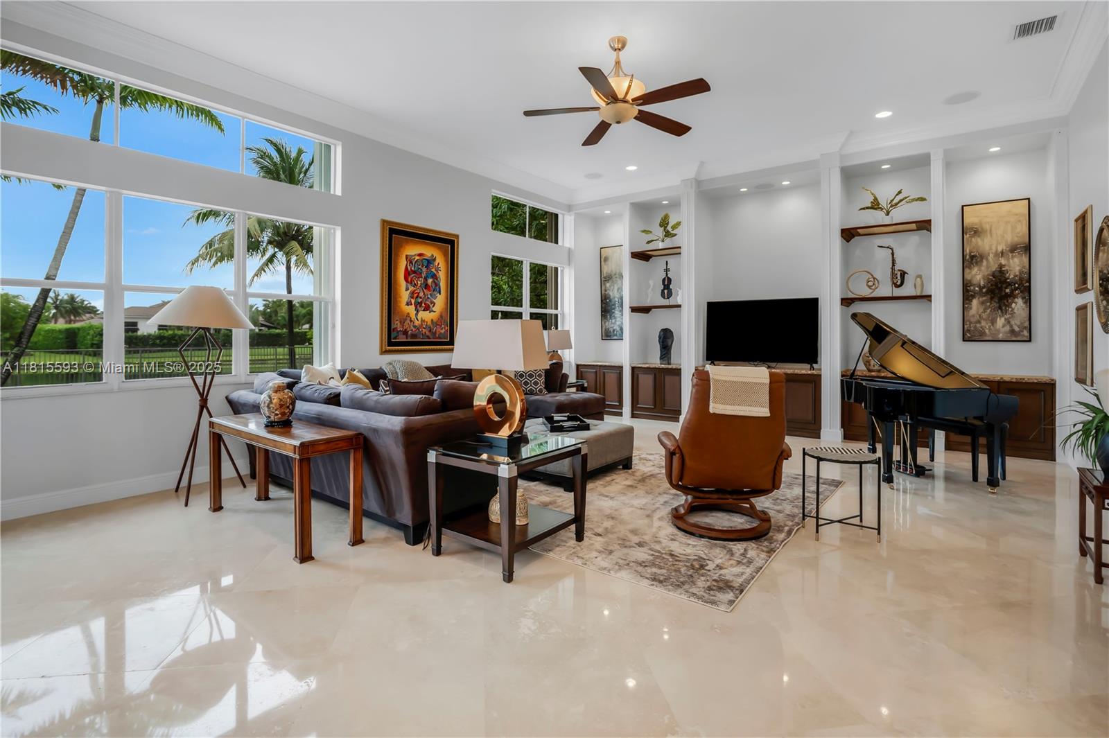 Move-in ready lakefront estate in Davie’s exclusive guard-gated Riverstone. This 5-bed, 4-bath Residence 3 model (4 bedrooms plus office) offers 3,565 sq ft of living space on a builder’s acre, nestled on a quiet cul-de-sac along the big lake. Features include a resort-style pool, tiki hut, family room bar, mature fruit trees, fenced backyard, and new pool & sprinkler pumps. The open layout showcases volume ceilings, marble floors, and a chef’s kitchen with granite countertops, stainless steel appliances, and refinished cabinetry. The spacious primary suite offers dual walk-in closets. Accordion shutters, 3-car garage, new washer/dryer, and fresh interior paint. Riverstone offers 24/7 security, pickleball, and basketball. Zoned for A-rated schools near I-75, dining, and shopping.