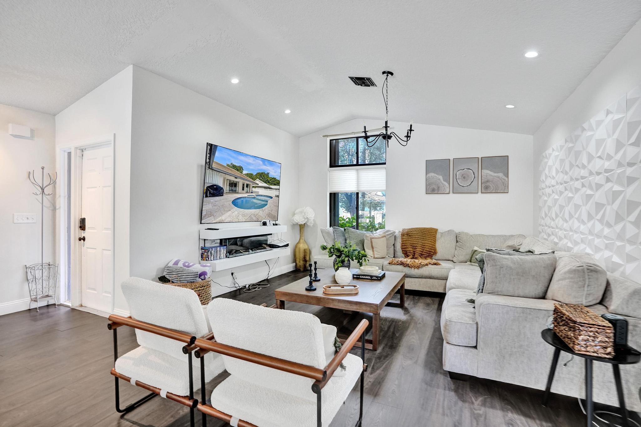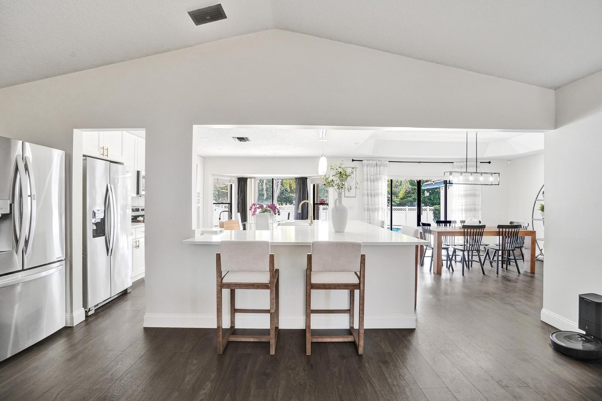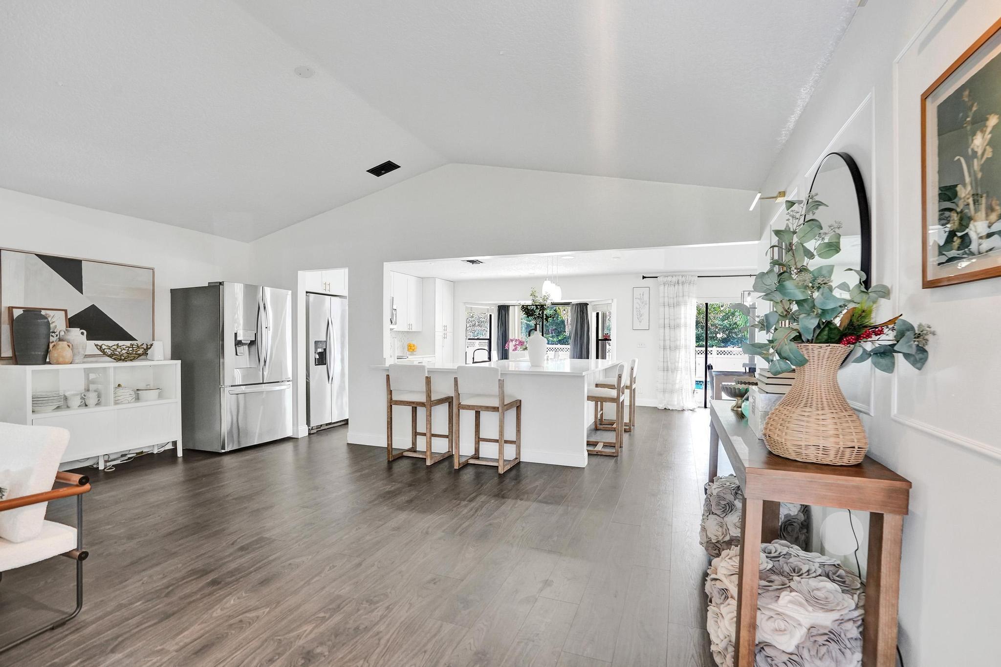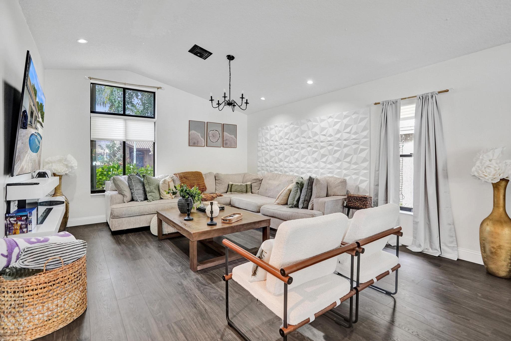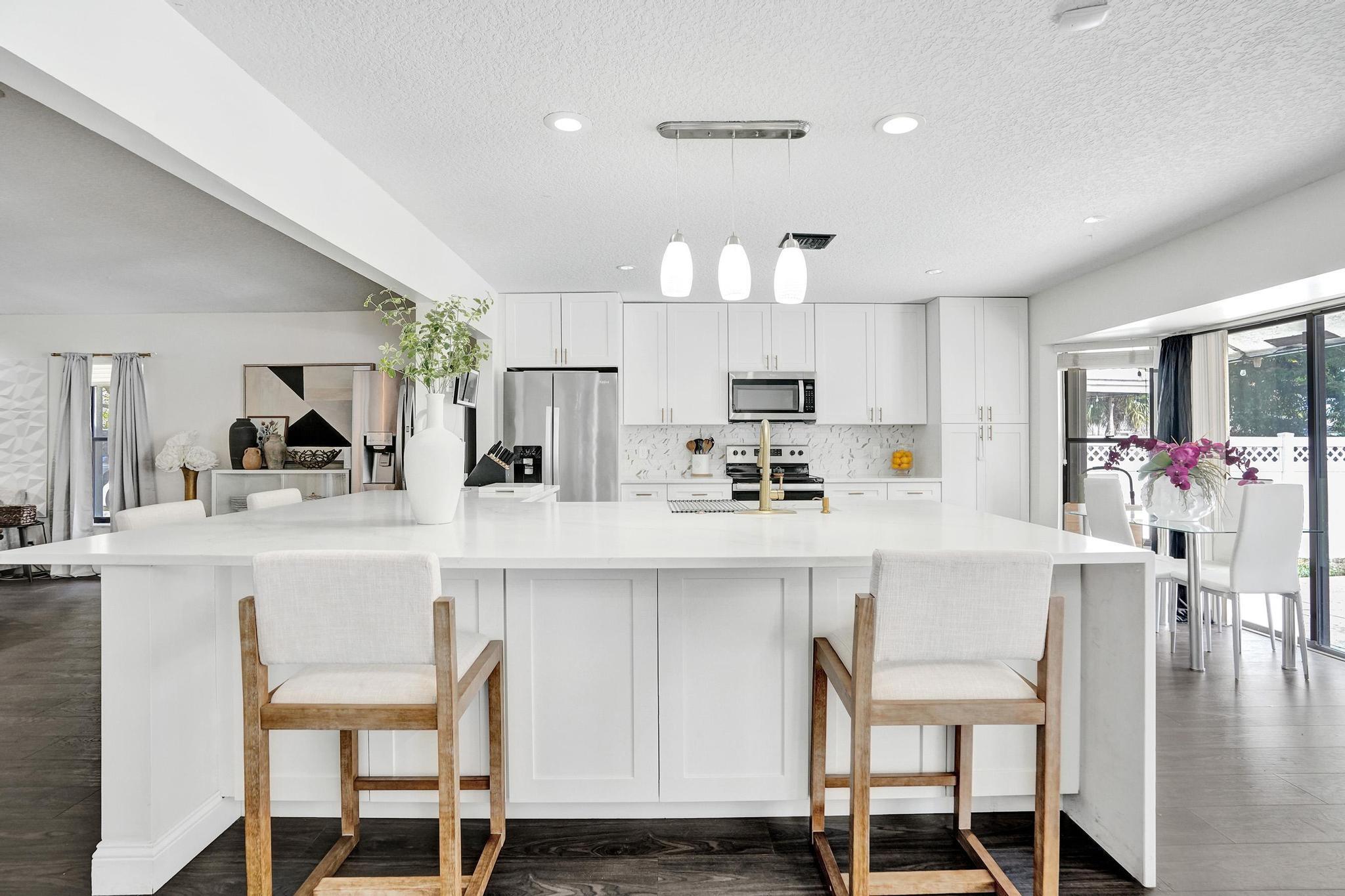 Beautifully renovated 4-bedroom, 2-bathroom home with 2-car garage in the highly desirable Crossings community of Coral Springs. This move-in ready home features a spacious, open layout with vaulted ceilings, large living and dining areas, and a fully remodeled kitchen (2023) with modern cabinetry, plenty of counterspace and stainless-steel appliances. Laminate flooring throughout (2019) except the bathrooms. The oversized master suite includes a generously sized walk-in closet and direct access to the pool area. One of the bathrooms also serves as a cabana bath, offering convenience for outdoor entertaining. Enjoy your private, fenced backyard oasis, refinished pool and spa (2019). Additional updates include accordion shutters, Newer A/C (Aug 2024), and water heater (2019).