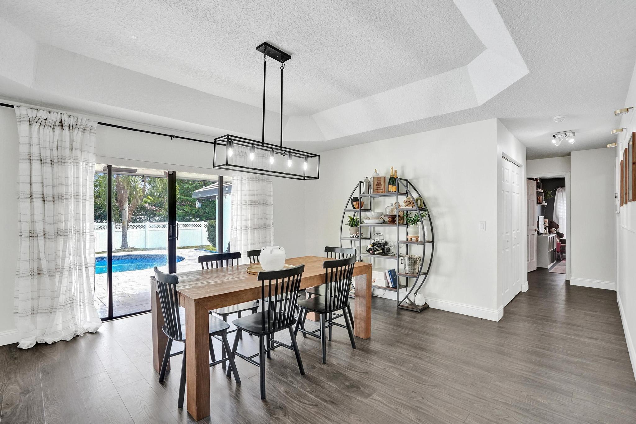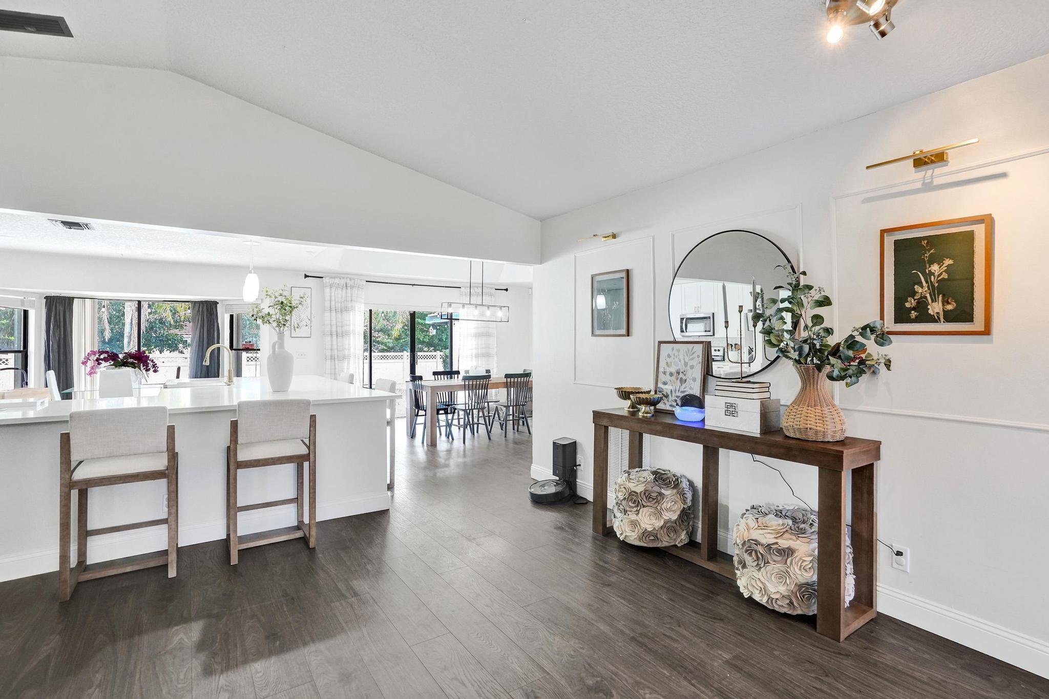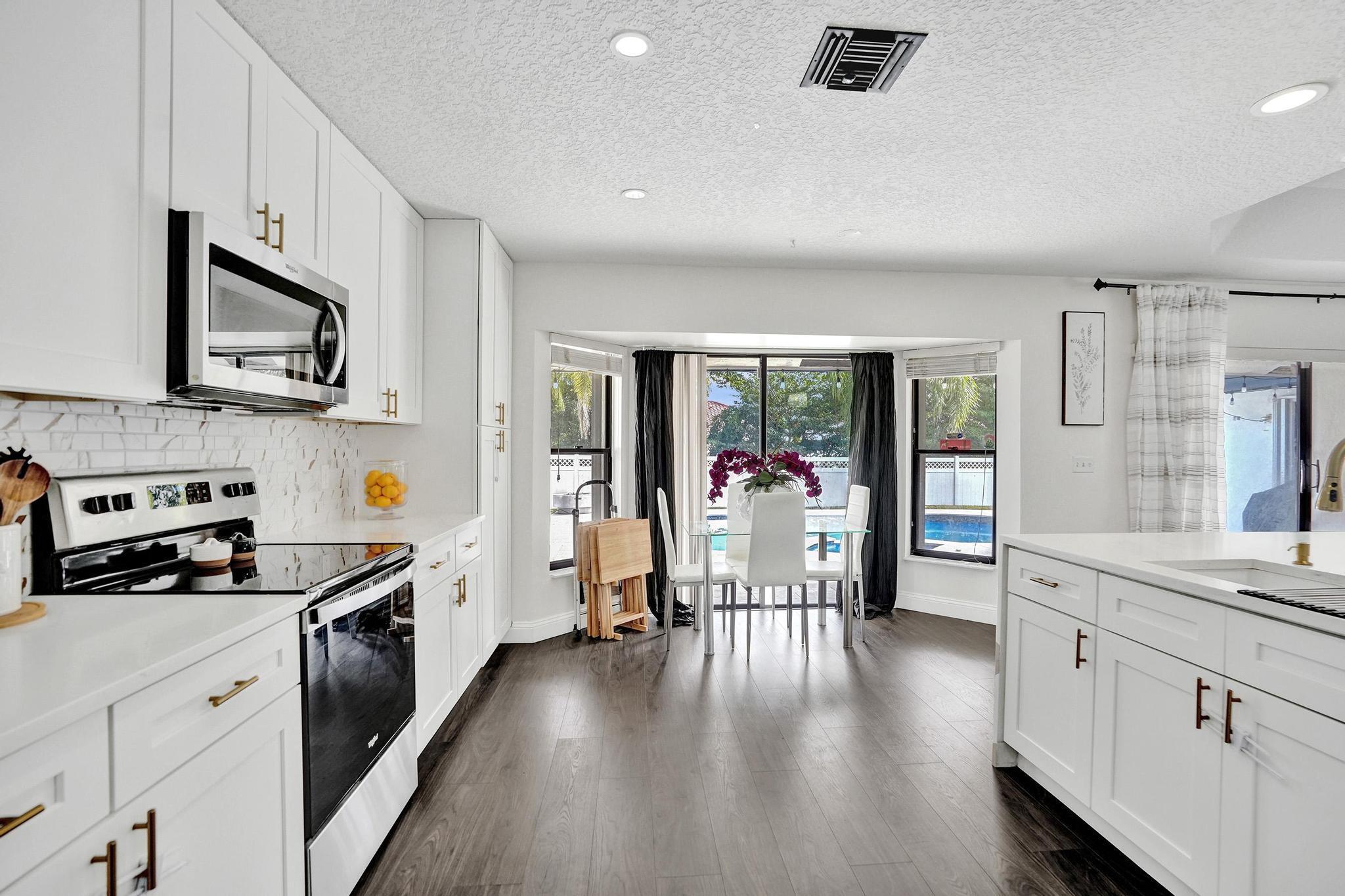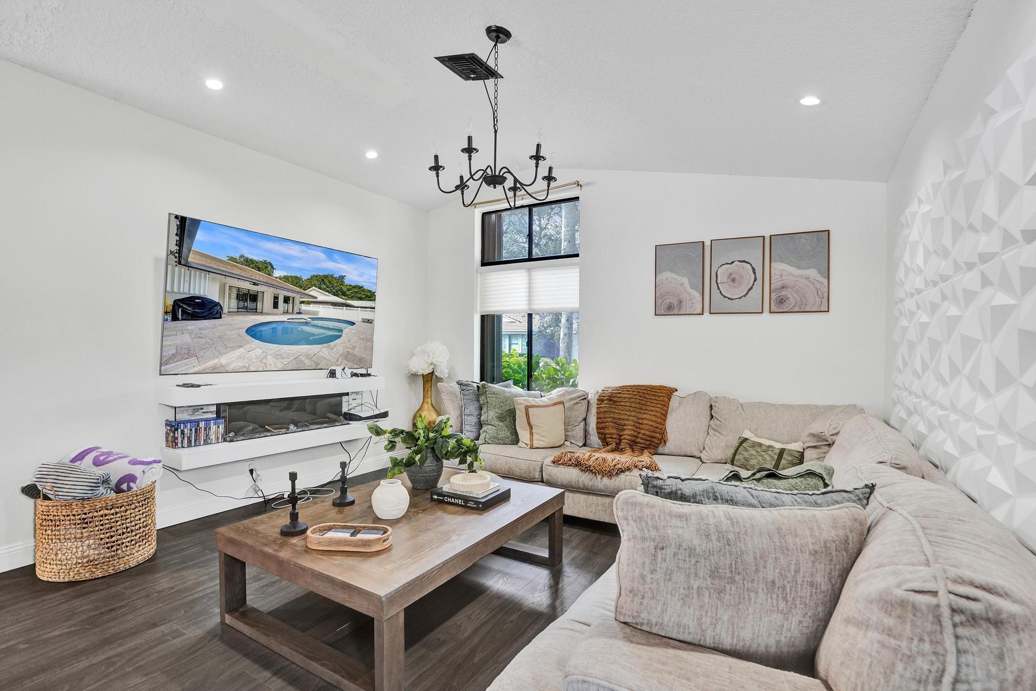 Beautifully renovated 4-bedroom, 2-bathroom home with 2-car garage in the highly desirable Crossings community of Coral Springs. This move-in ready home features a spacious, open layout with vaulted ceilings, large living and dining areas, and a fully remodeled kitchen (2023) with modern cabinetry, plenty of counterspace and stainless-steel appliances. Laminate flooring throughout (2019) except the bathrooms. The oversized master suite includes a generously sized walk-in closet and direct access to the pool area. One of the bathrooms also serves as a cabana bath, offering convenience for outdoor entertaining. Enjoy your private, fenced backyard oasis, refinished pool and spa (2019). Additional updates include accordion shutters, Newer A/C (Aug 2024), and water heater (2019).