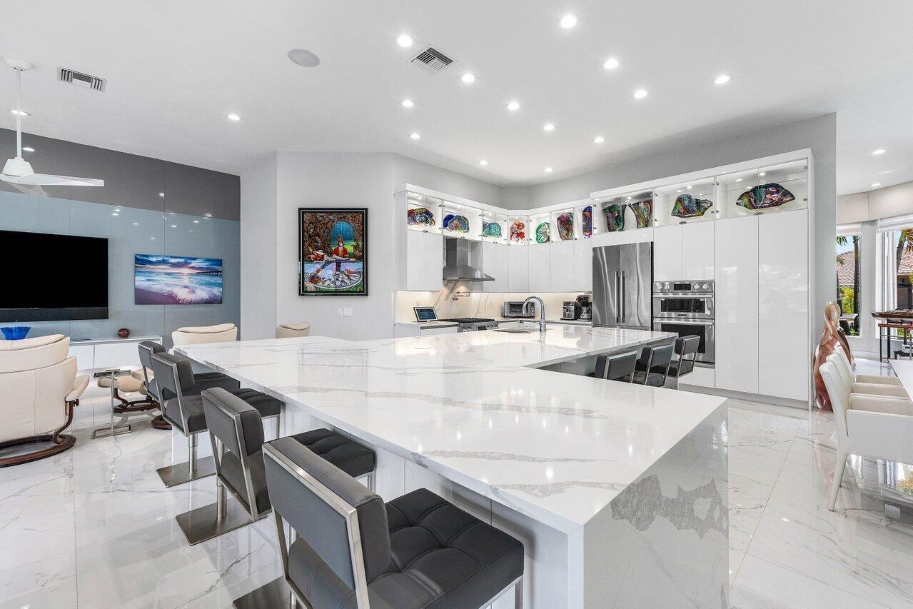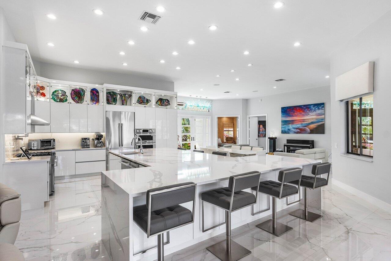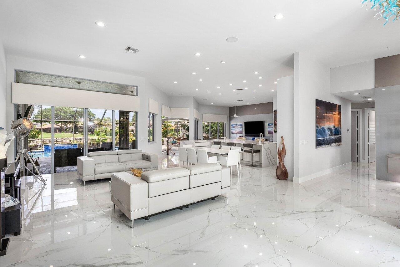 Welcome to this exquisitely renovated four-bedroom three bath luxury residence nestled in the heart of the sought-after Stonebridge Country Club. This is an opportunity to acquire a ''move-in, nothing needed'' home. Meticulously updated inside and out over the past two years ago with no expense spared, this elegant home blends timeless sophistication with modern comforts, offering the finest in South Florida living. From the moment you step inside, you're greeted by expansive living spaces adorned with designer porcelain tile flooring throughout. New custom cabinetry including floating cabinets with under lighting were installed in every room, providing the clean minimalist look awaiting your personal touch for accents.