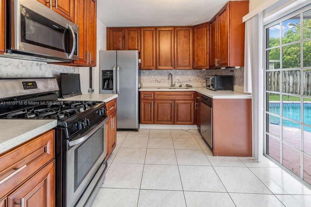 Beautiful 3-bedroom, 2-bathroom home ready for its next owner. Situated on a spacious corner lot, this property offers a private backyard with a pool ideal for relaxing or entertaining. Newer roof (2023). A covered carport and ample driveway space provide convenient parking. Inside, the kitchen features cherry wood cabinetry, quartz countertops, and stainless steel appliances. The home is powered by natural gas and includes a gas stove and water heater. The primary bedroom is notably spacious, with room for a sitting area or home office, and includes an en suite cabana bath with direct access to the pool deck. This home offers a great combination of comfort, space, and outdoor living.