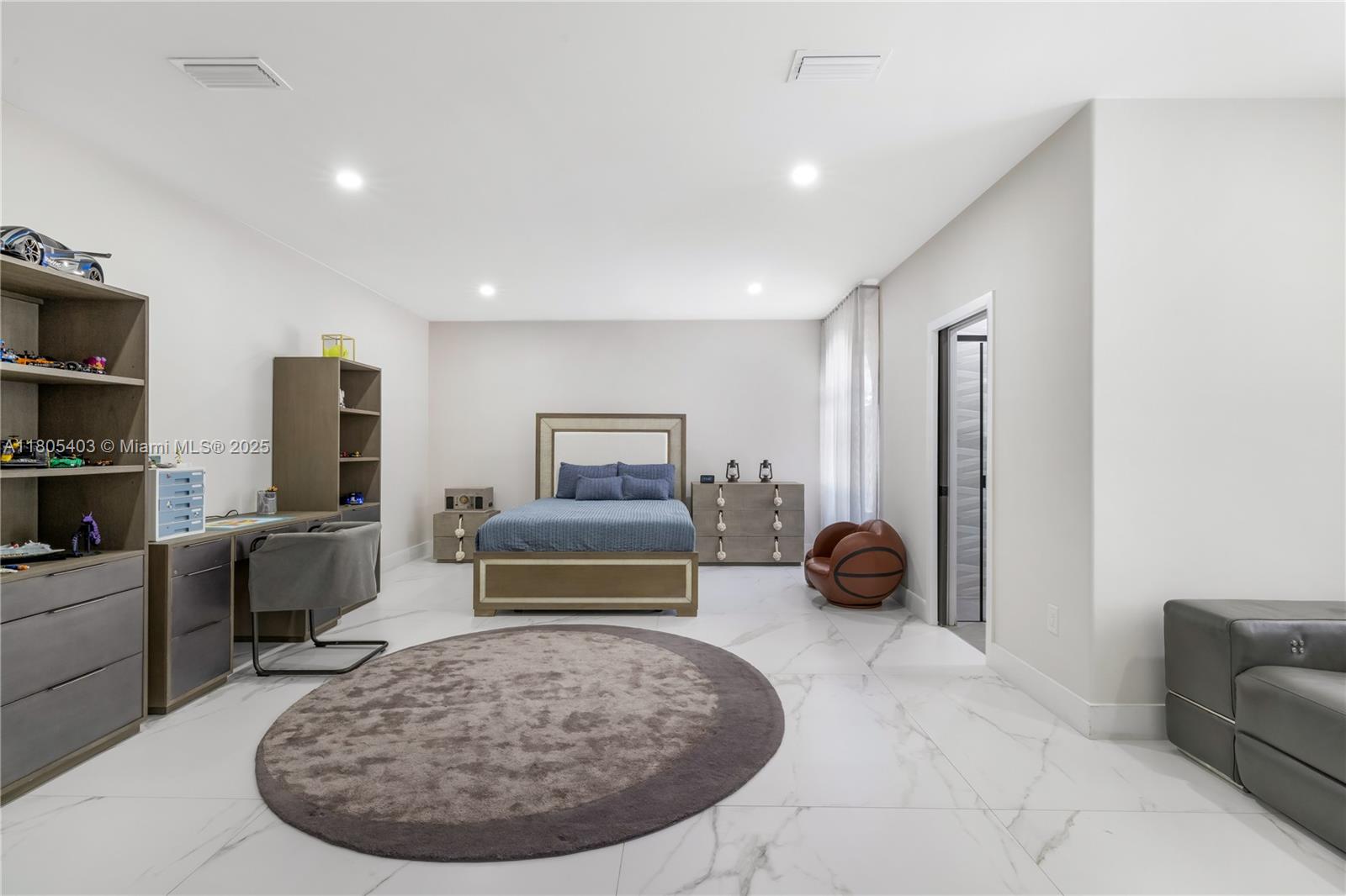 Stunning gated 1-story 8,126 total SF residence on a quiet cul-de-sac in prime North Pinecrest, steps from Gulliver & Beth Am. Set on a lush 1.1 acre with a 2-story, 1,300 SF guesthouse, treehouse, & ample parking. The 6-bed, 5.5-bath main home offers an office, new impact windows/doors, & Firenze Carrara polished marble tile throughout. Gourmet kitchen boasts a leather-textured marble island, Veneta Cucine cabinetry, & Miele appliances. Guest bath features full-height, single-slab Italian tile. Primary suite includes dual walk-in closets & a spa-style bath with Kohler DTV+ faucet less system for steam, audio, chromotherapy, & lighting. Whole-house Brilliant system manages lighting, Zoom intercom, & Sonos audio indoors/out. Outdoor oasis includes a new summer kitchen & resort-style pool.