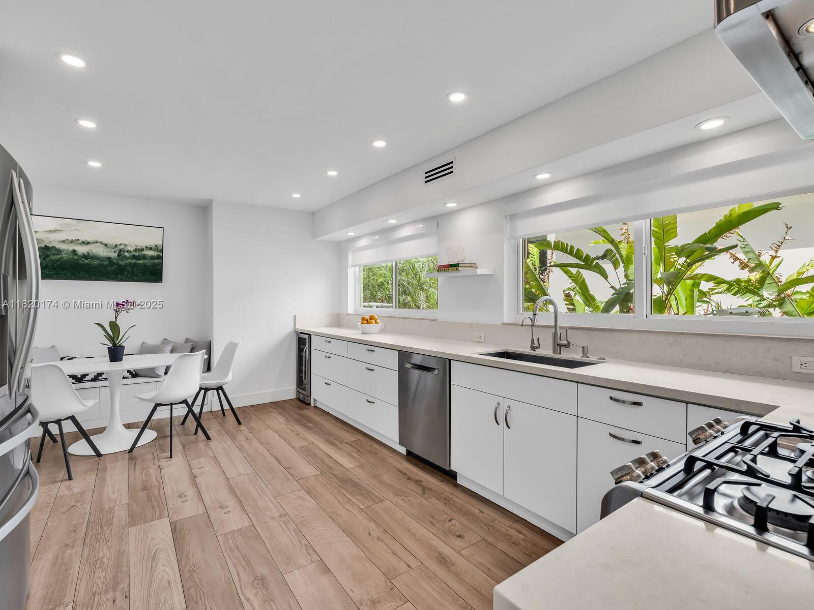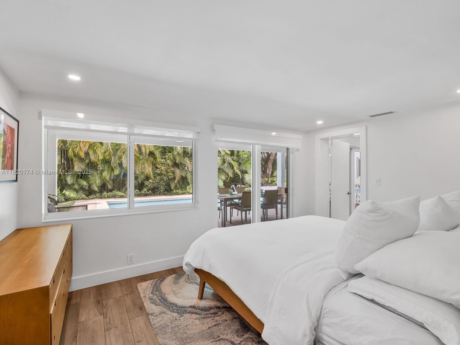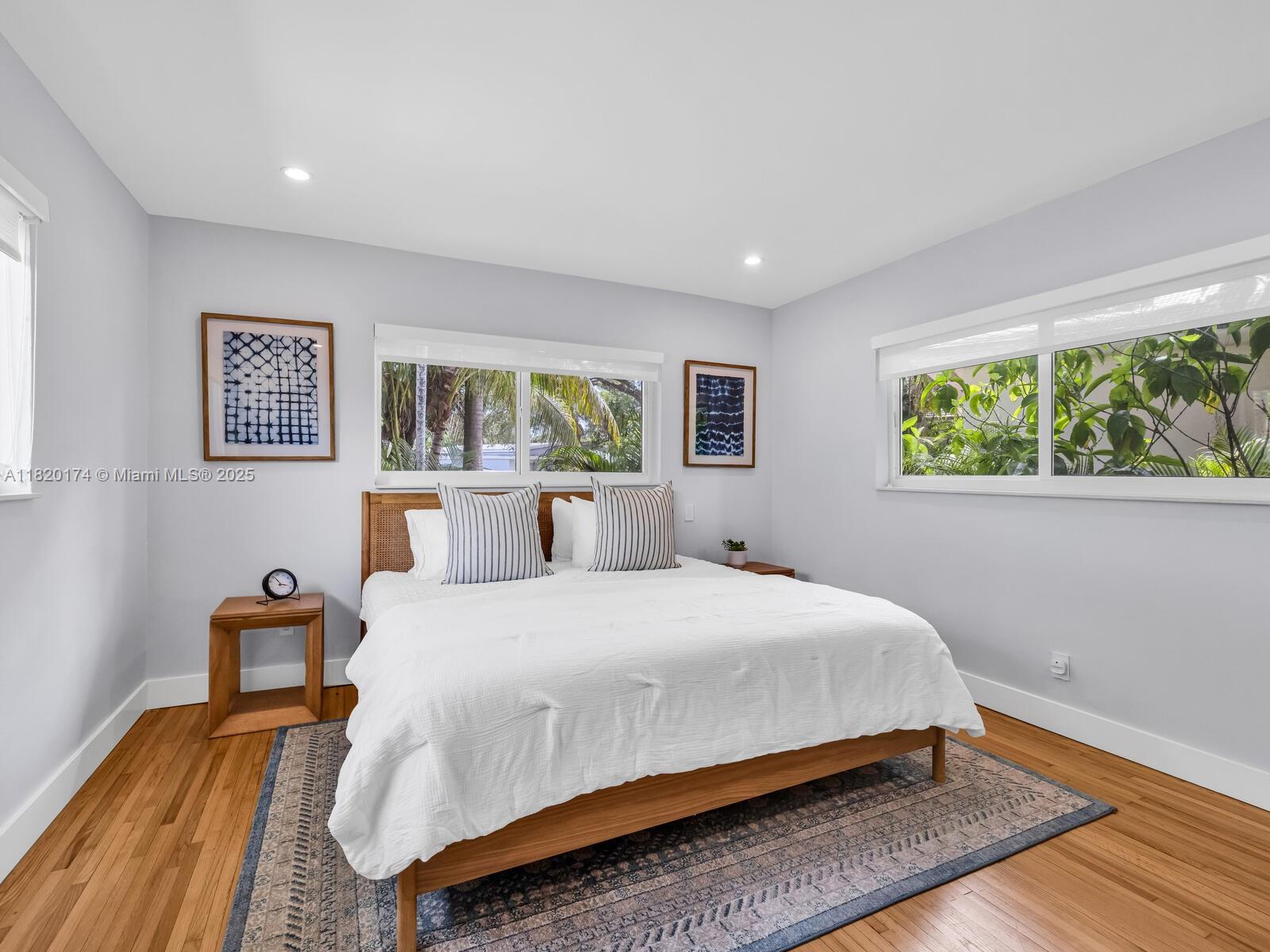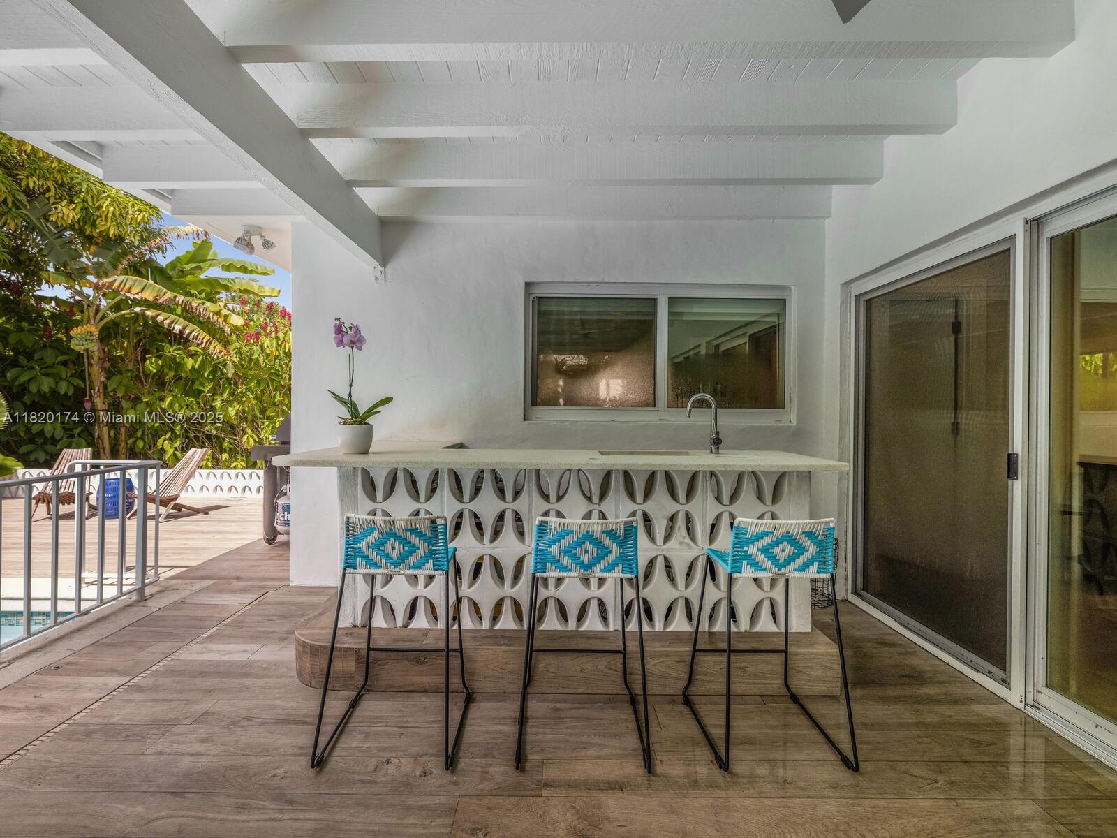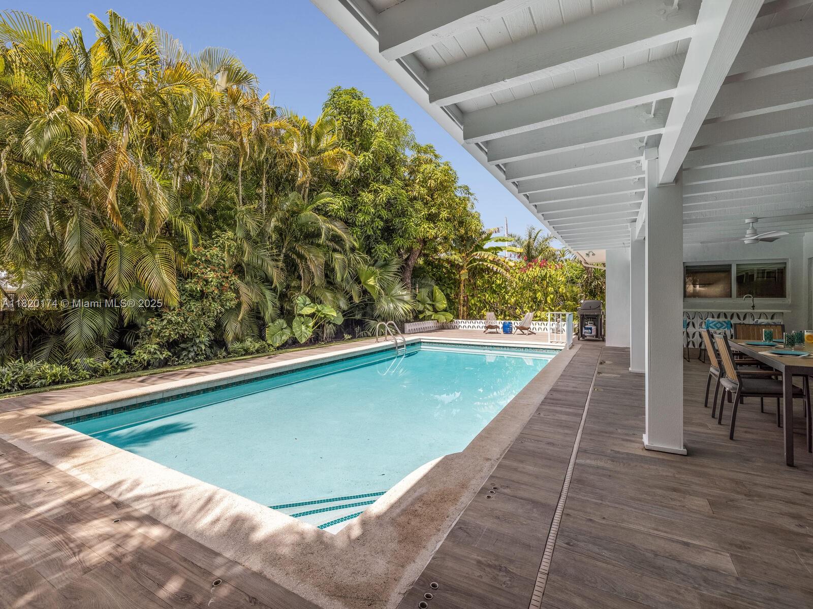 Welcome to The Blue Bay Mid-Century! With ~2,400 SF of interiors, this beautifully updated East Shores, 4-bed, 4-bath tropical modern pool home is an architectural gem with fresh bay breezes, sleek angular lines, and the best of indoor-outdoor living. Enter into bright vaulted living, leading to large dining with wall-to-wall sliding doors that open to lushly landscaped gardens, a sparkling heated pool, outdoor shower, covered veranda, and chic breeze-block wet bar. Inside, enjoy the updated eat-in chef’s kitchen with gas range, quartz countertops, wine cooler, and coffee bar. Experience ultimate privacy with the “quadruple-split” plan- one bedroom in each house corner, including the main suite with pool view, walk-in closet, and spacious double vanity bath with walk-in shower. A must see!