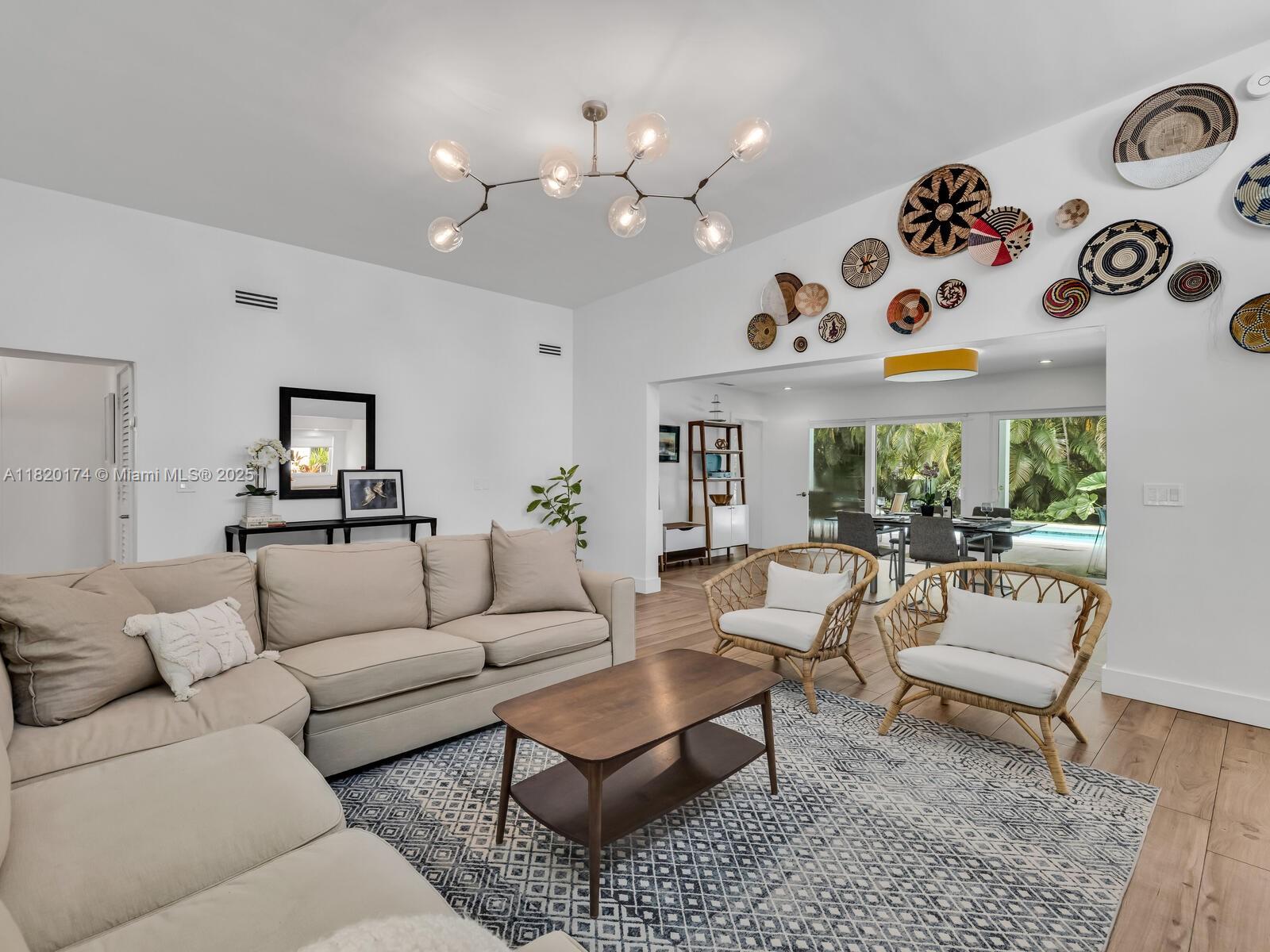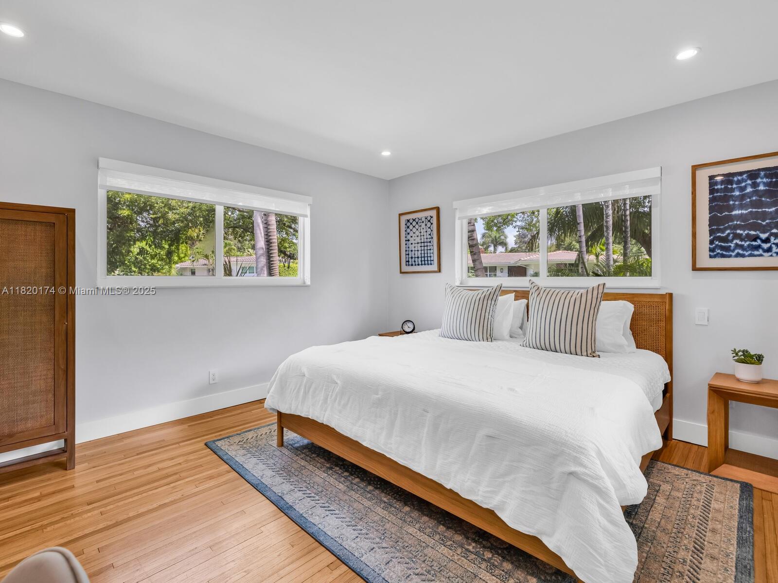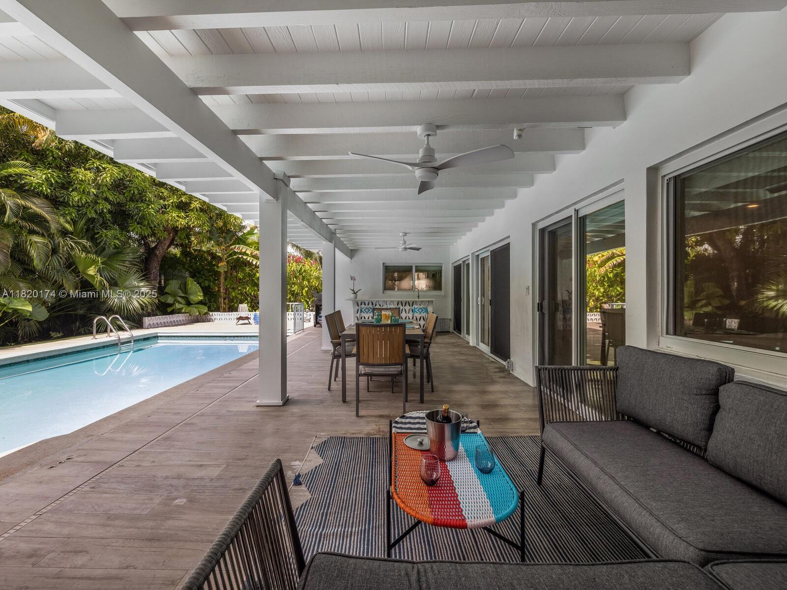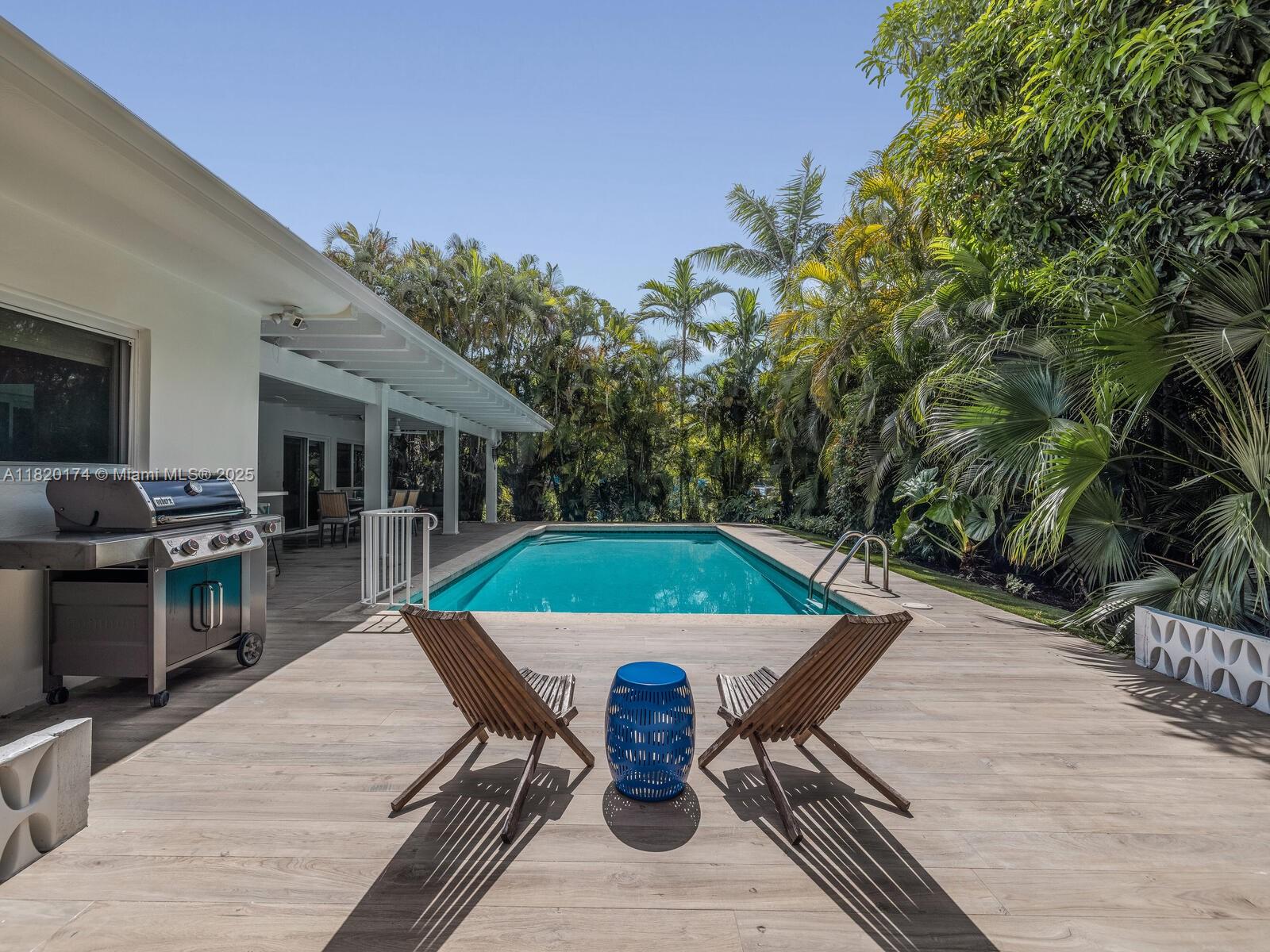 Welcome to The Blue Bay Mid-Century! With ~2,400 SF of interiors, this beautifully updated East Shores, 4-bed, 4-bath tropical modern pool home is an architectural gem with fresh bay breezes, sleek angular lines, and the best of indoor-outdoor living. Enter into bright vaulted living, leading to large dining with wall-to-wall sliding doors that open to lushly landscaped gardens, a sparkling heated pool, outdoor shower, covered veranda, and chic breeze-block wet bar. Inside, enjoy the updated eat-in chef’s kitchen with gas range, quartz countertops, wine cooler, and coffee bar. Experience ultimate privacy with the “quadruple-split” plan- one bedroom in each house corner, including the main suite with pool view, walk-in closet, and spacious double vanity bath with walk-in shower. A must see!