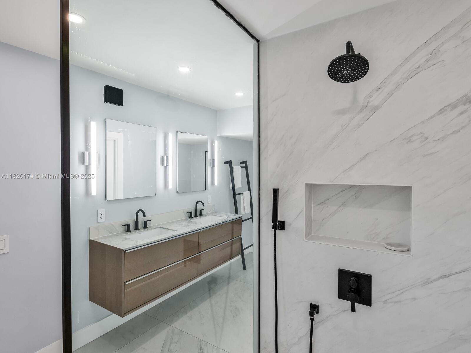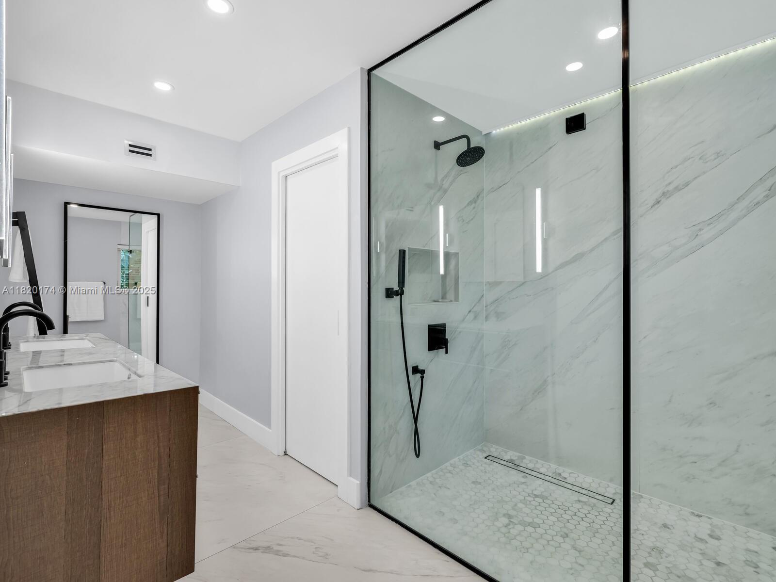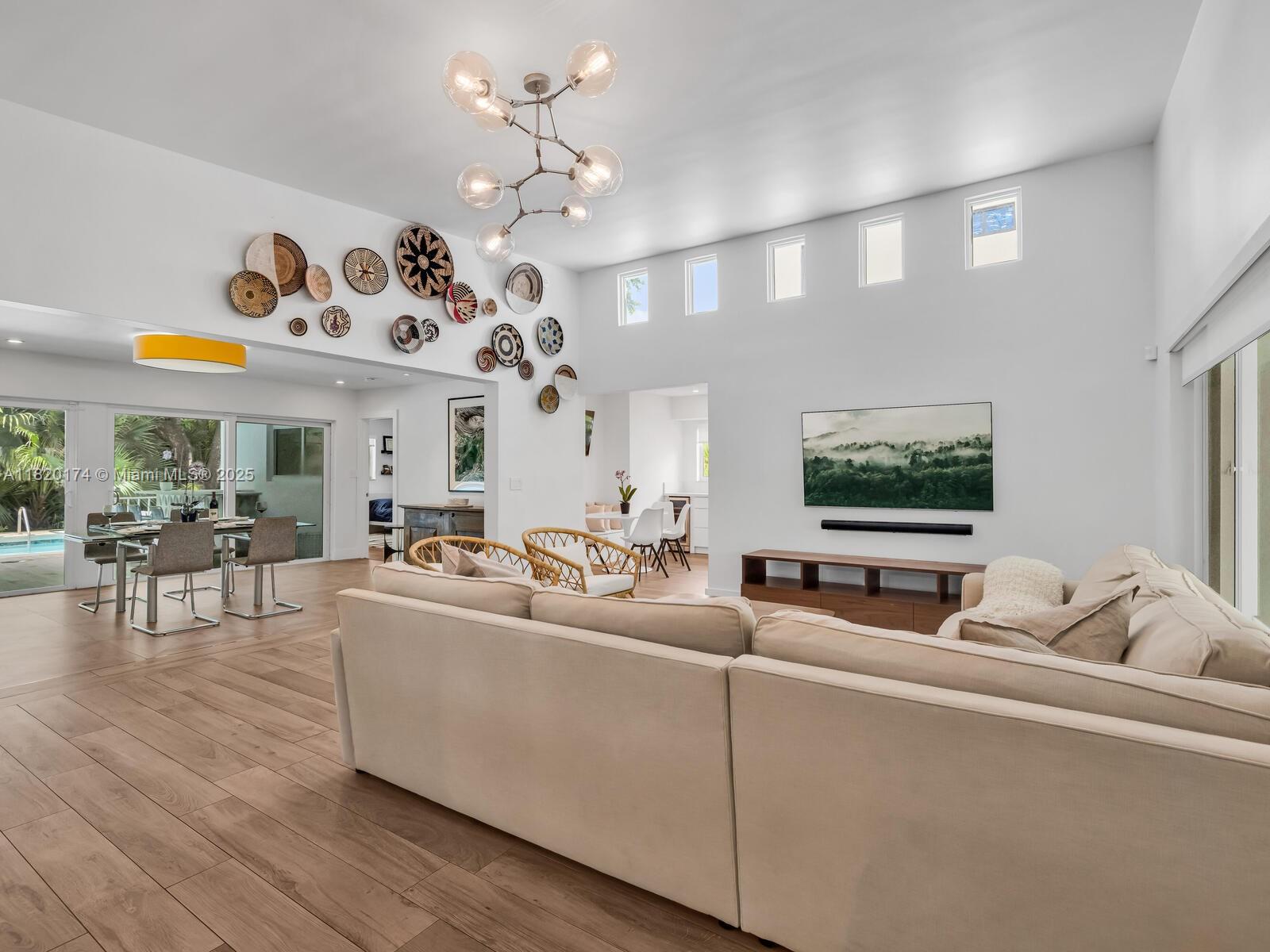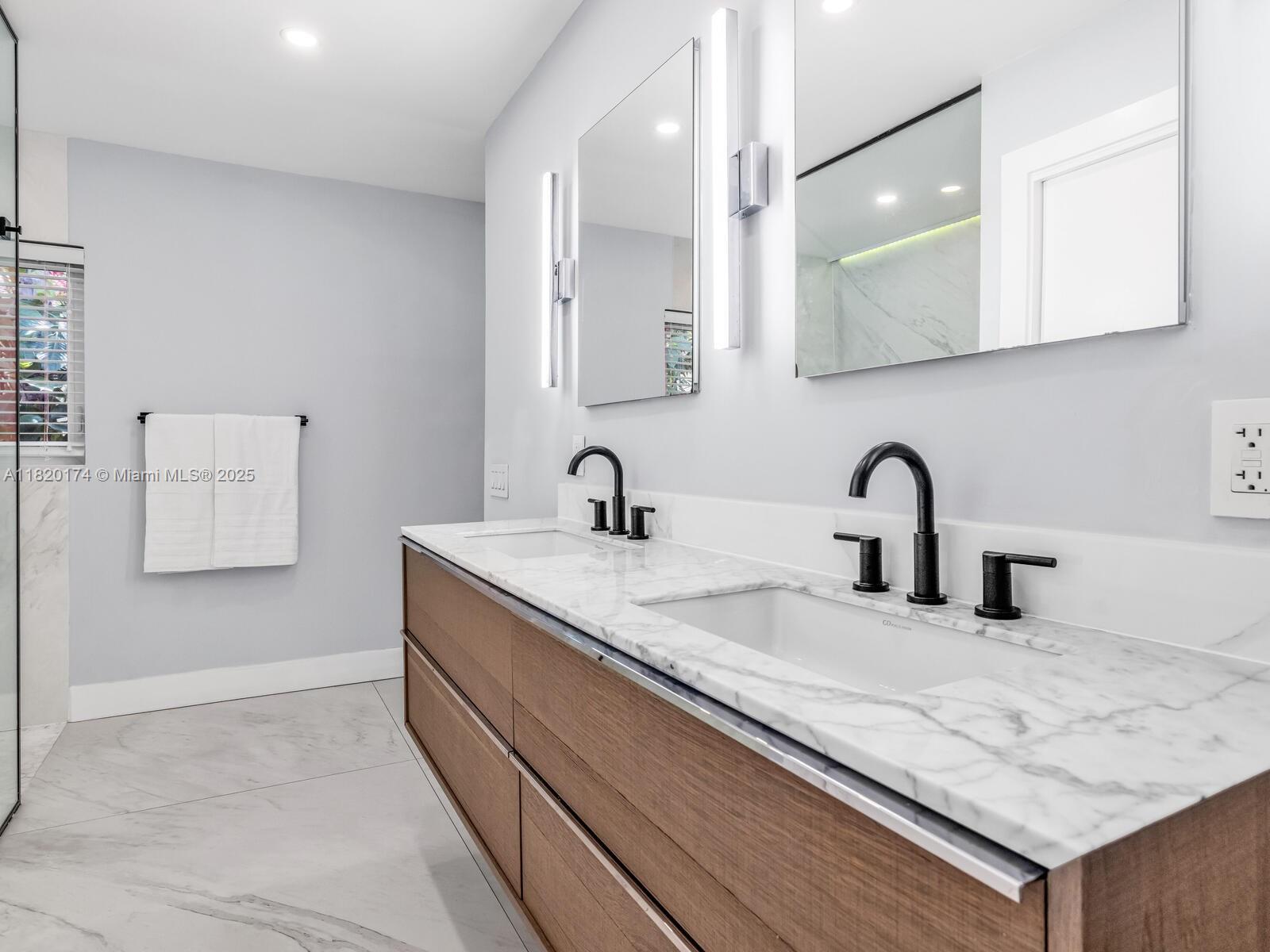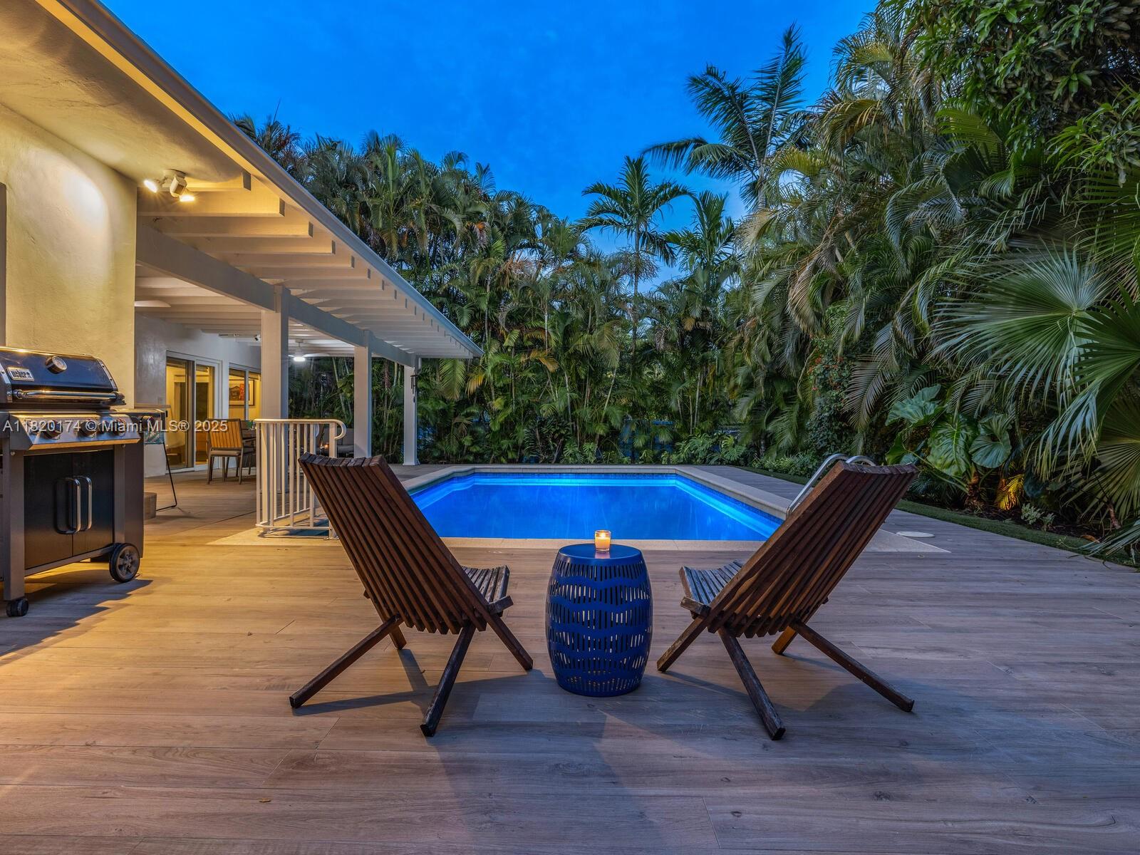 Welcome to The Blue Bay Mid-Century! With ~2,400 SF of interiors, this beautifully updated East Shores, 4-bed, 4-bath tropical modern pool home is an architectural gem with fresh bay breezes, sleek angular lines, and the best of indoor-outdoor living. Enter into bright vaulted living, leading to large dining with wall-to-wall sliding doors that open to lushly landscaped gardens, a sparkling heated pool, outdoor shower, covered veranda, and chic breeze-block wet bar. Inside, enjoy the updated eat-in chef’s kitchen with gas range, quartz countertops, wine cooler, and coffee bar. Experience ultimate privacy with the “quadruple-split” plan- one bedroom in each house corner, including the main suite with pool view, walk-in closet, and spacious double vanity bath with walk-in shower. A must see!