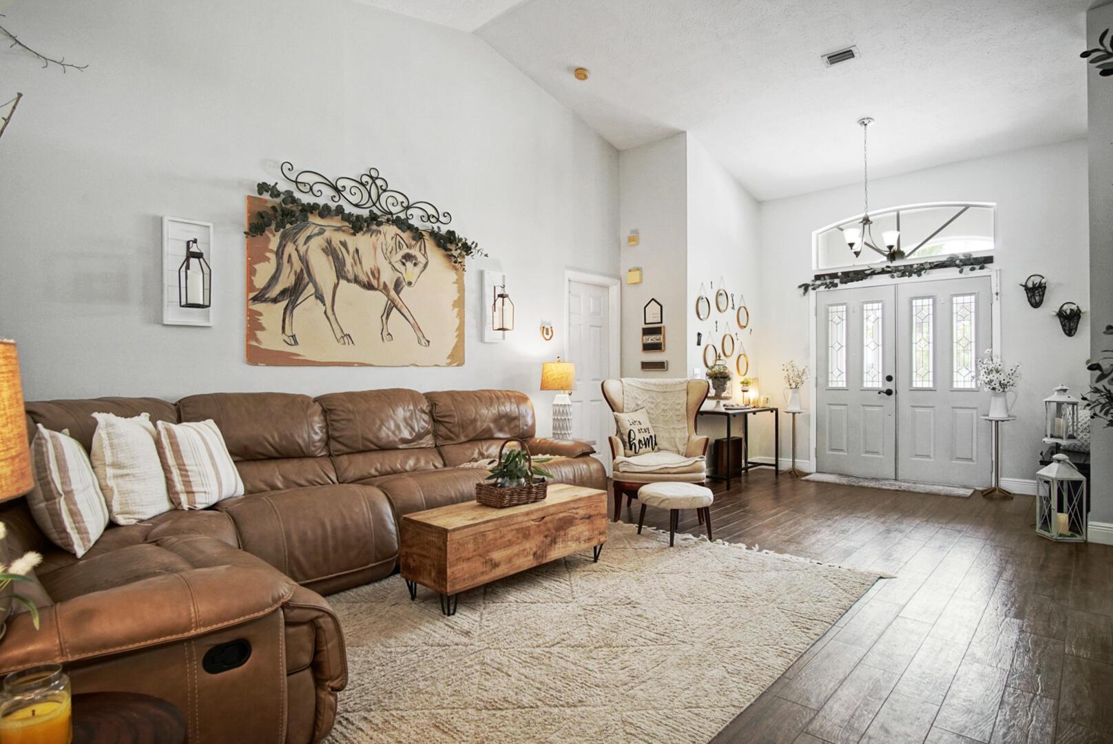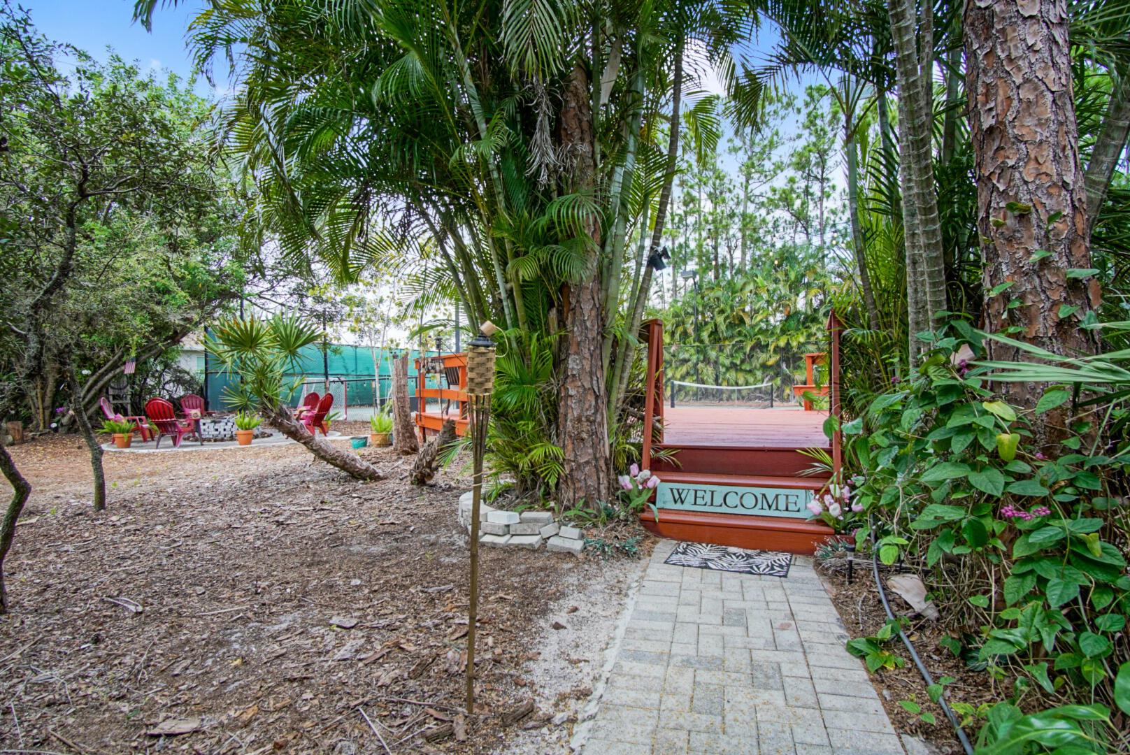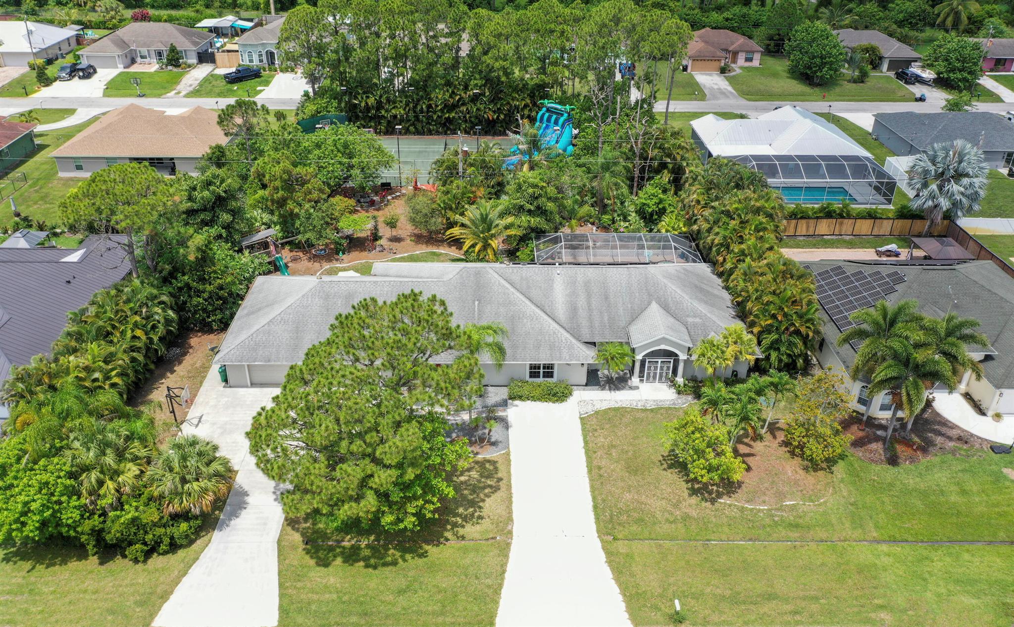 Welcome to your Oasis in Paradise! On almost one full acre sits this expansive 3700 sqft 4CG pool home ! This includes the master bedroom and updated bathroom, 1 ensuite, 3 LARGE bedrooms, and an indoor gym(6th bedroom). This home also features a formal dining, living, family, and sitting rooms. Indoor laundry with ample storage closets throughout. SS appliances, breakfast bar and pantry are great features of the kitchen. Screen enclosure covers the pool and deck with an additional patio behind the garage. Let's not forget the FULL SIZE tennis court, fully fenced and lighted. Friends and family can enjoy watching from the large viewing deck. The backyard also has a brick paver fire pit, multiple garden areas, a play-house and rose garden. Also has owned solar panels!Come see your new home