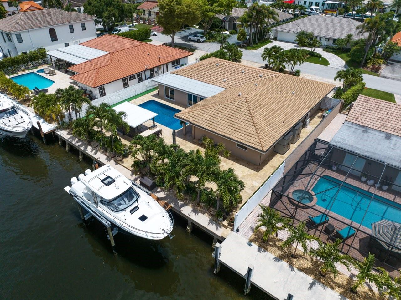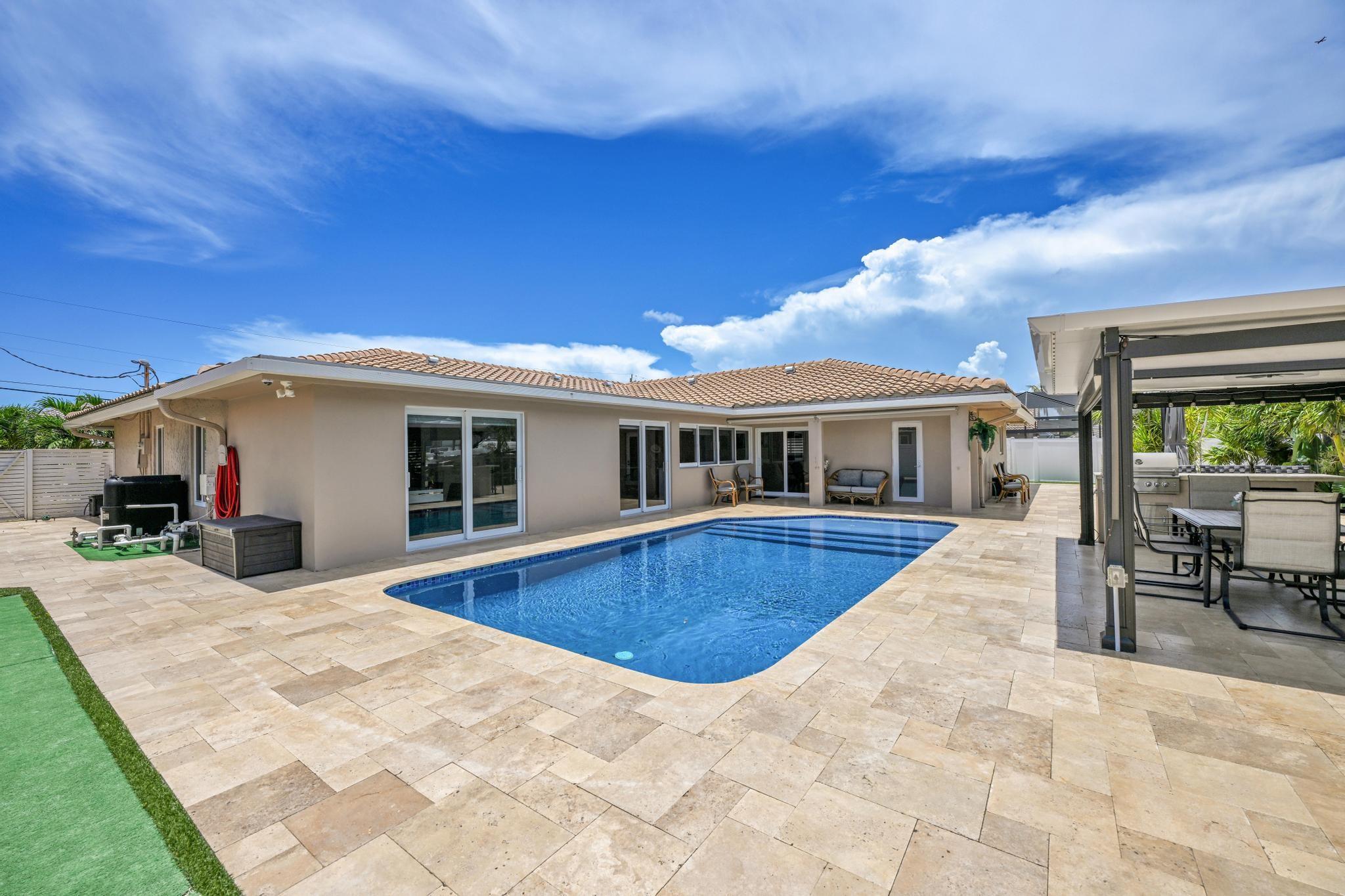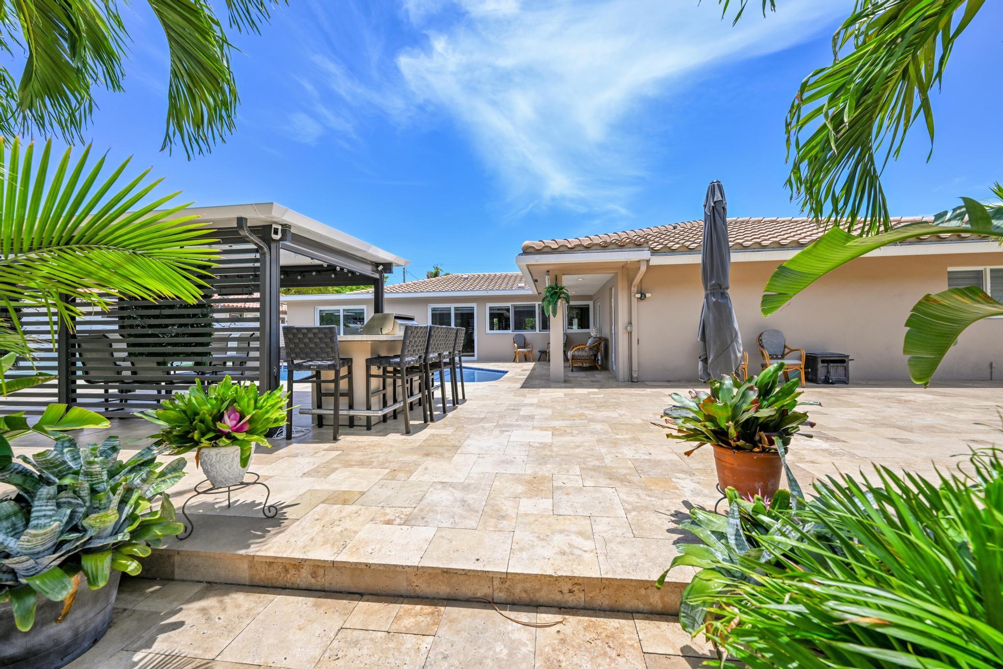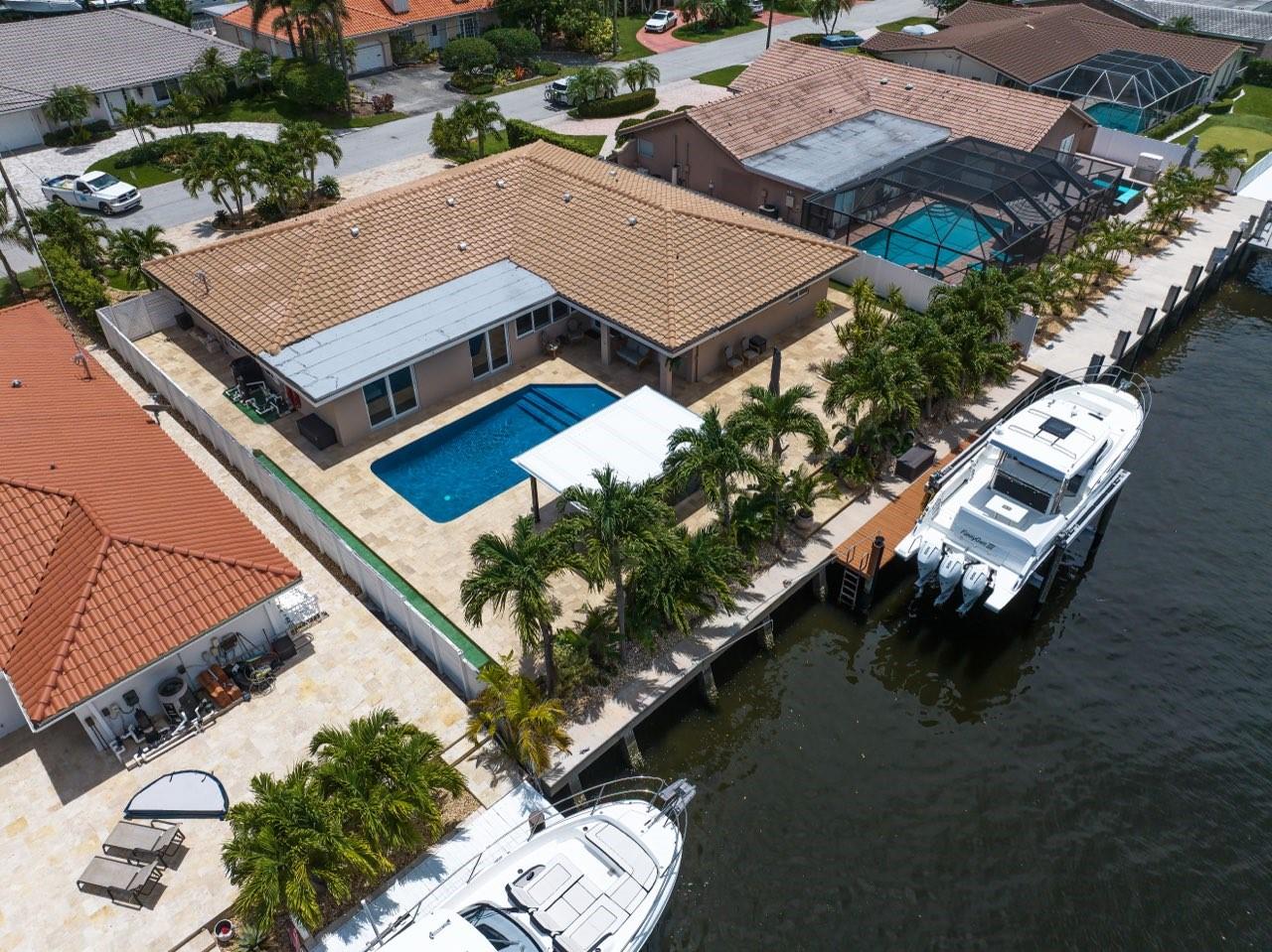 Beautifully updated 3-bedroom, 3-bath waterfront home in prestigious Coral Ridge Country Club. Just five houses from the Intracoastal, midway between two inlets, this 85’ ocean-access property with no fixed bridges is a boater’s dream. Features include private dock, newer seawall, new 24,000 lb boat lift, saltwater heated pool with Diamond Brite, hurricane-rated gazebo with electric shade, outdoor kitchen, and new pavers front & back. Inside is a bright open layout with split floor plan and marble floors. Chef’s kitchen with Quartz counters, European cabinets, stainless appliances, breakfast bar, and wine fridge. Impact windows/doors bring in natural light. New barrel tile roof (2022), AC (2024), & gutters. RELINED PIPES. 5 minutes to beach, dining, & shopping, luxury, location, lifestyle.