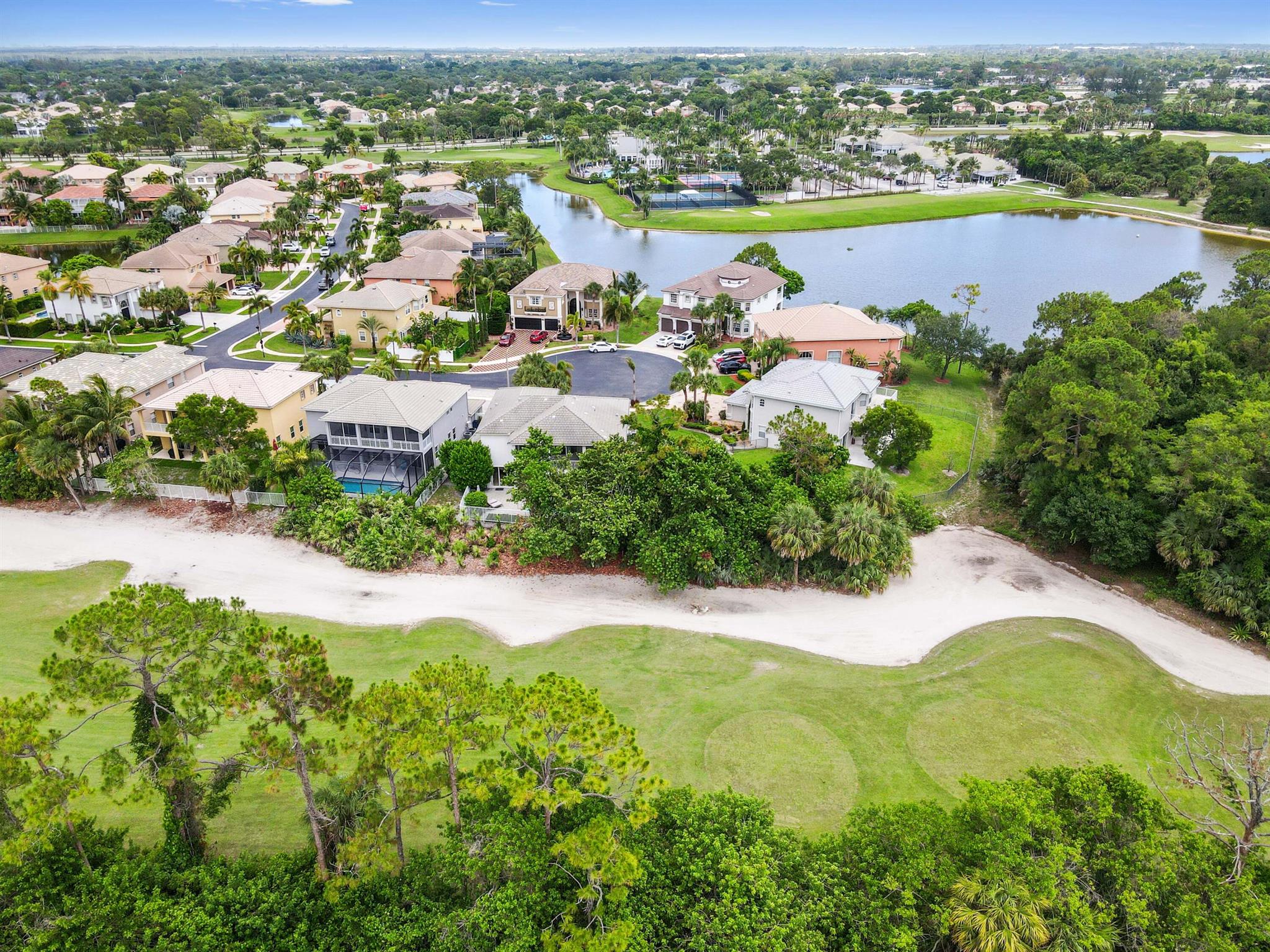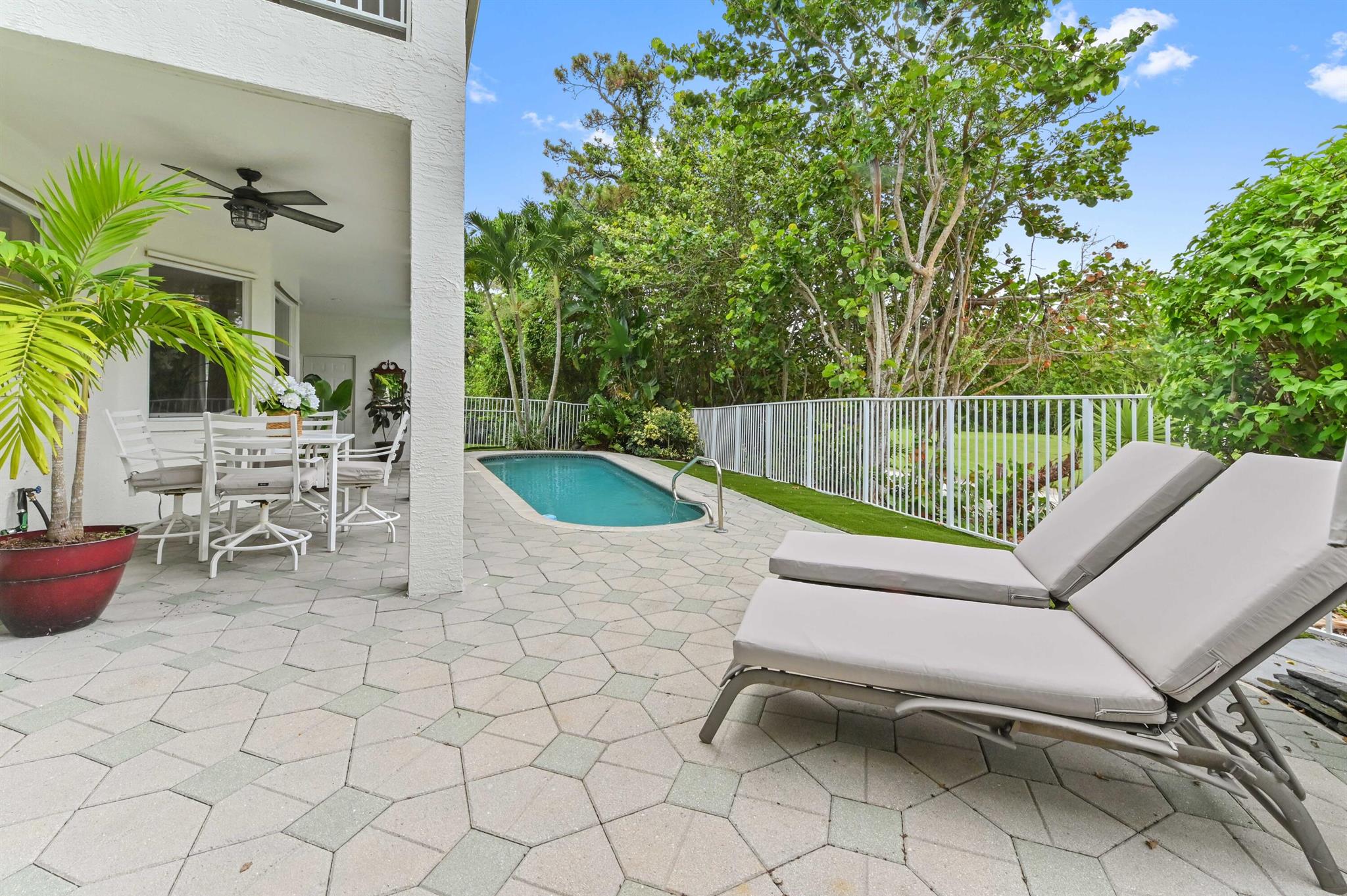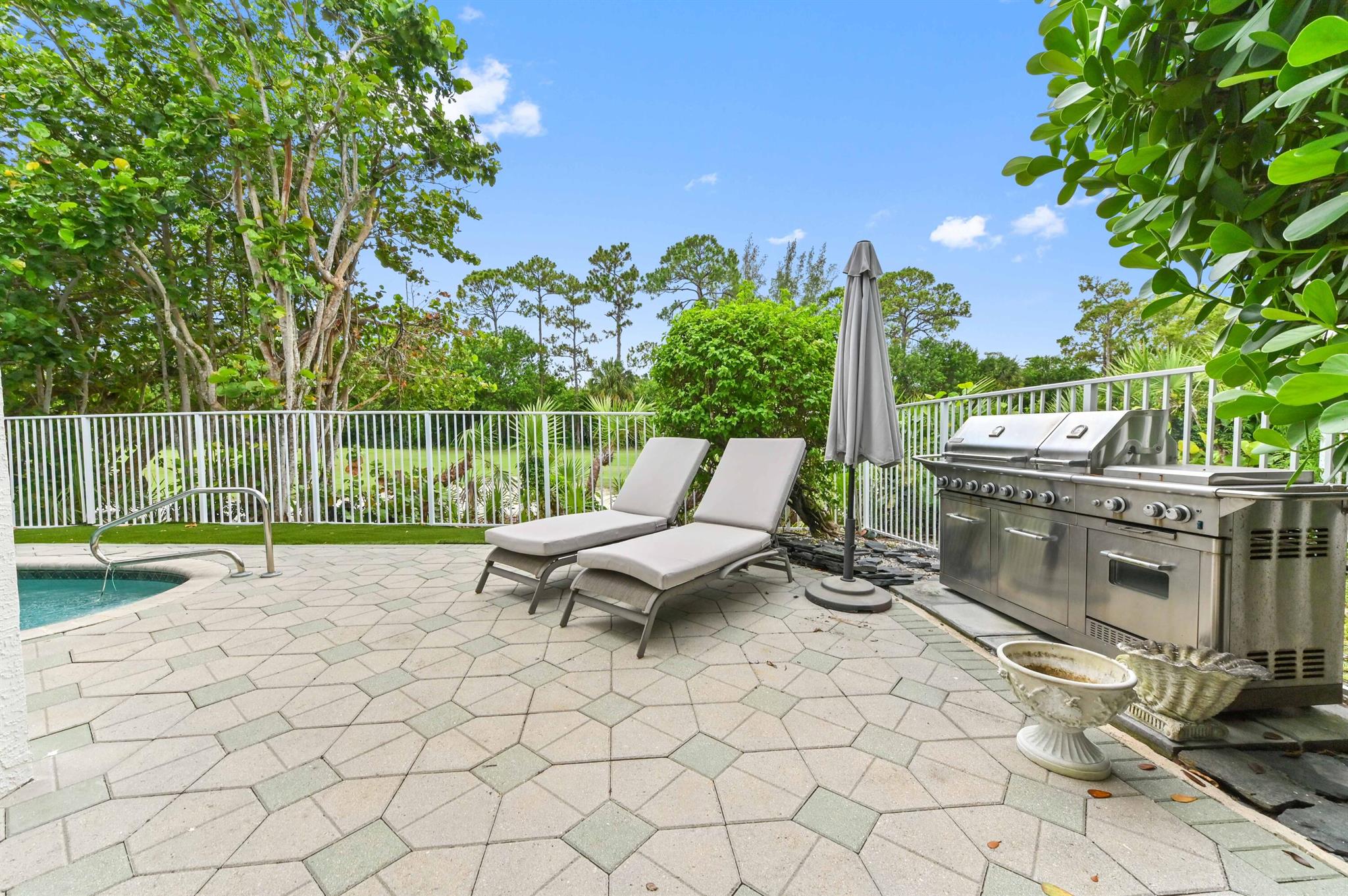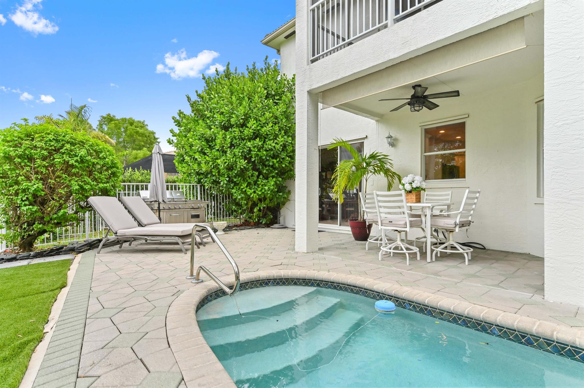 Welcome to your dream pool home in the prestigious Madison Green community! Nestled in a gated cul-de-sac, this stunning 2-story residence offers comfort, elegance, and resort-style living right on the golf course.Step through elegant French double doors into a spacious entry-level living room, where tile flooring flows seamlessly into a chef-inspired kitchen featuring a large island with sink and bar seating, walk-in pantry, cooktop, and 42'' cabinetry for ample storage. The dedicated laundry room includes a utility tub, washer, and dryer for convenience.Enjoy outdoor living at its finest with a private pool, adult swim area, and a cabana perfect for relaxing or entertaining. The covered and open patio extends into a fenced yard, providing privacy and space.