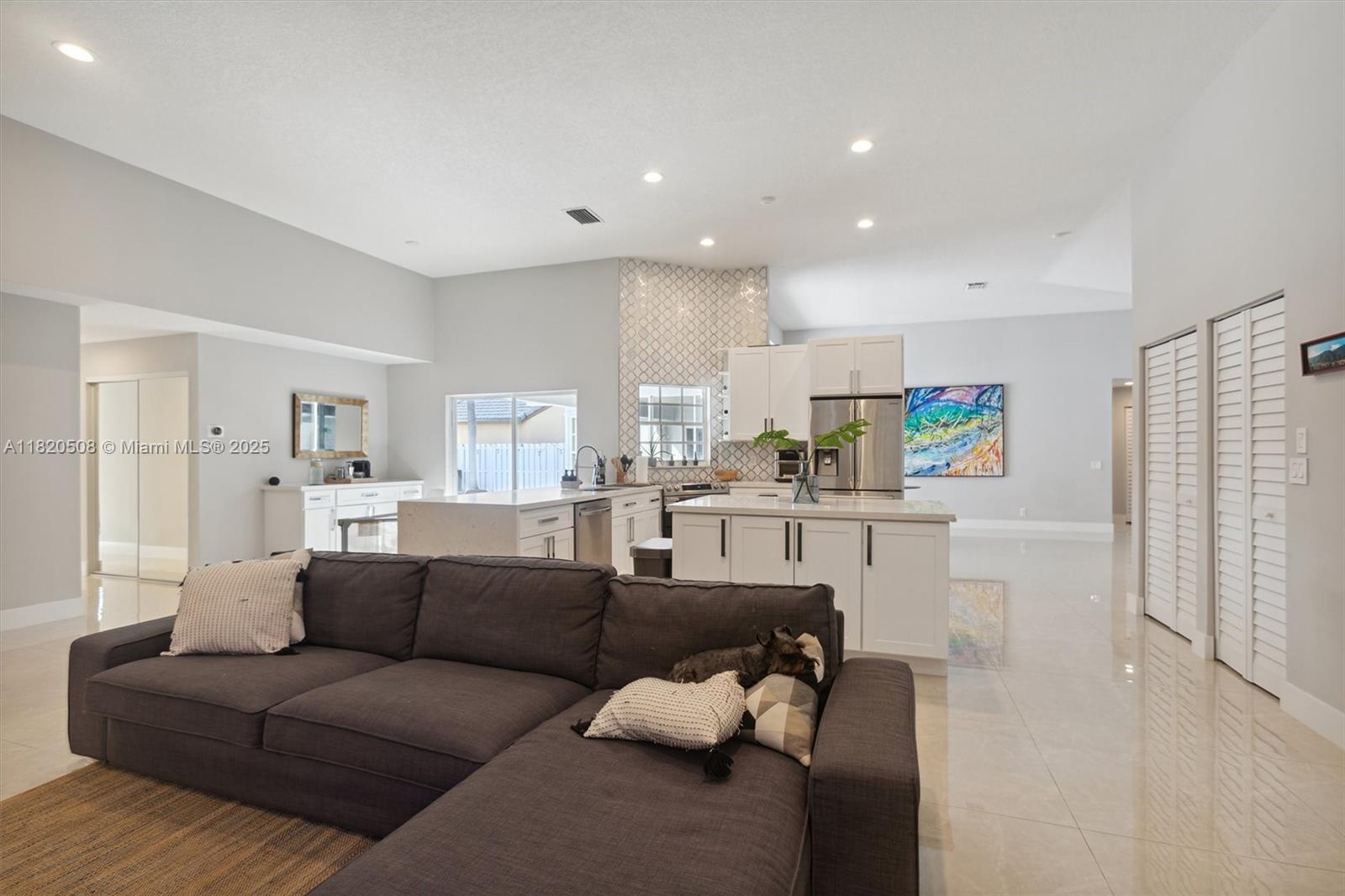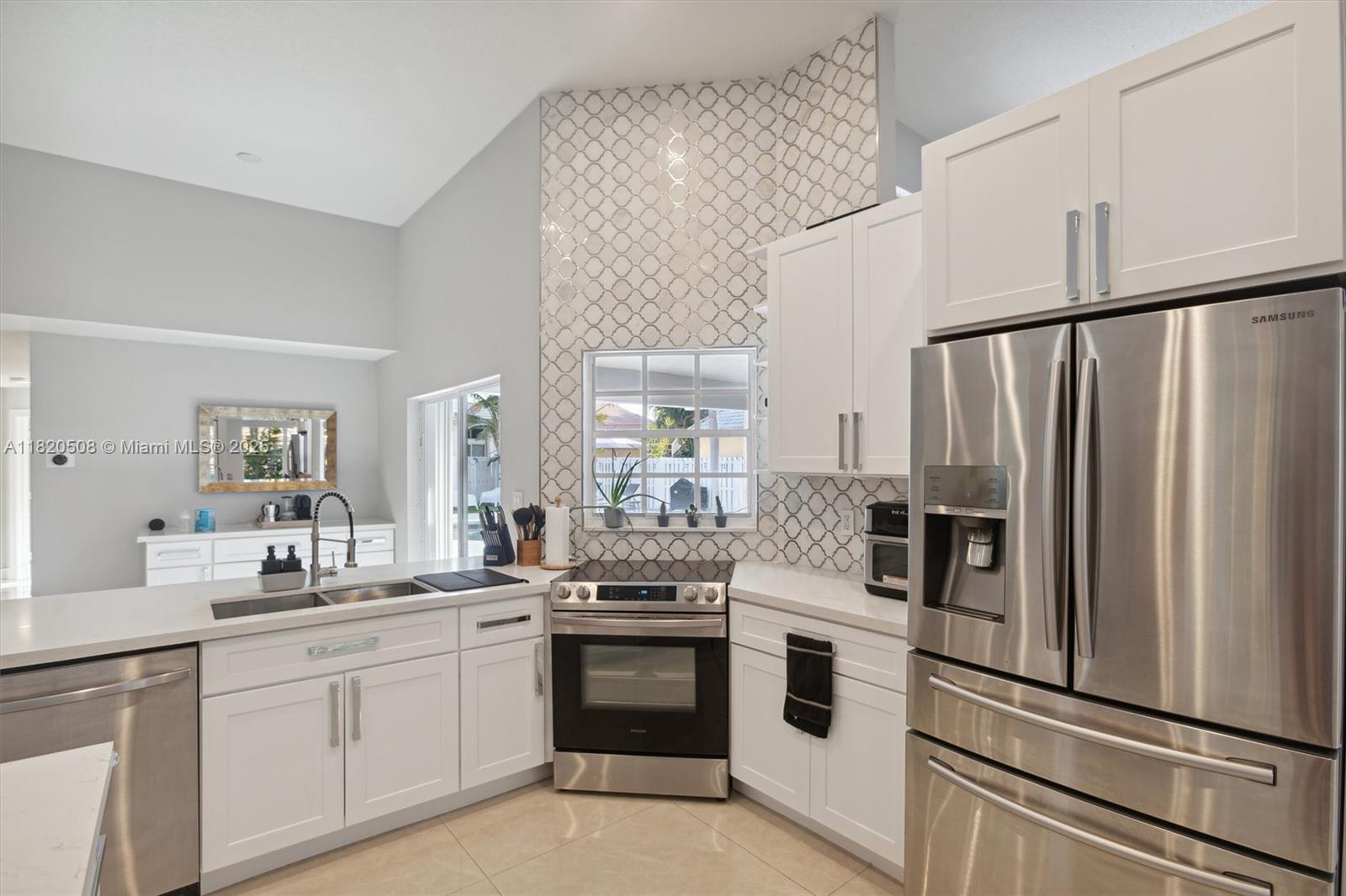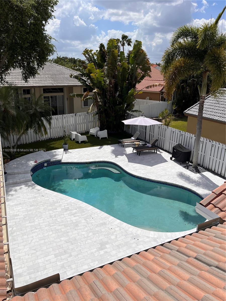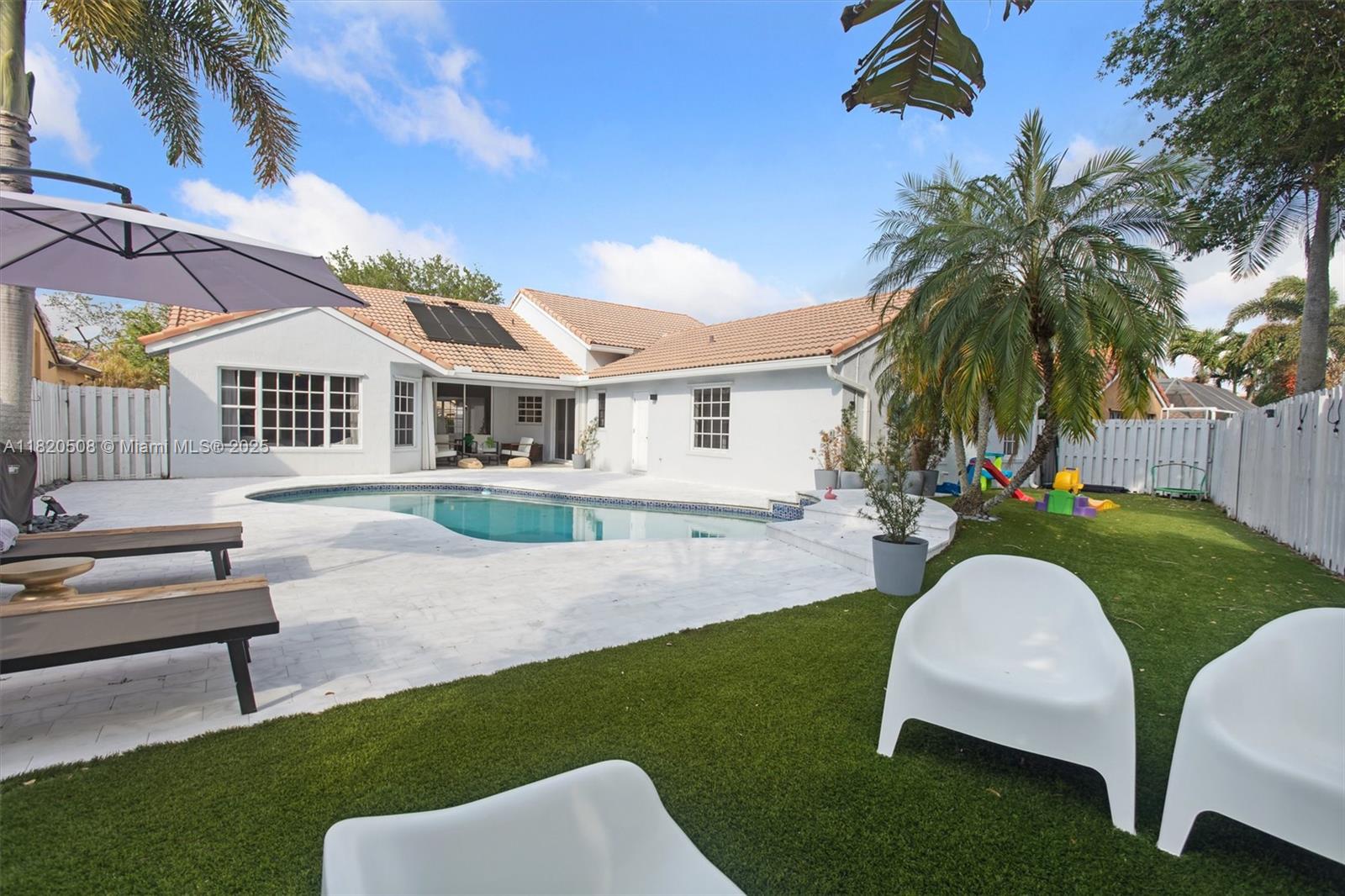 Experience living in this exquisite renovated ONE-STORY home featuring 5 beds, 3.5 baths & open living areas with HIGH ceilings in Weston’s prestigious North Lake Community. The expansive open floor plan features modern tile floors, family room, living & dining rooms offering plenty of space for entertainment. Boasting stunning eat-in kitchen w/ S.S appliances & granite countertops. Step in the master suite accompanied by a full en-suite bath & walk-in closets w/ tub/shower. Across, 2 beds await w/ 2 1/2 bath & the 5th beds is perfect as an office. Step outside to your cozy fenced, partially roofed patio, tiled w/ artificial grass, POOL, Cabana BATH & RENOVATED DECK ideal for outdoor relaxation. Pool-fenced. Steps away from the CUL-DE-SAC.