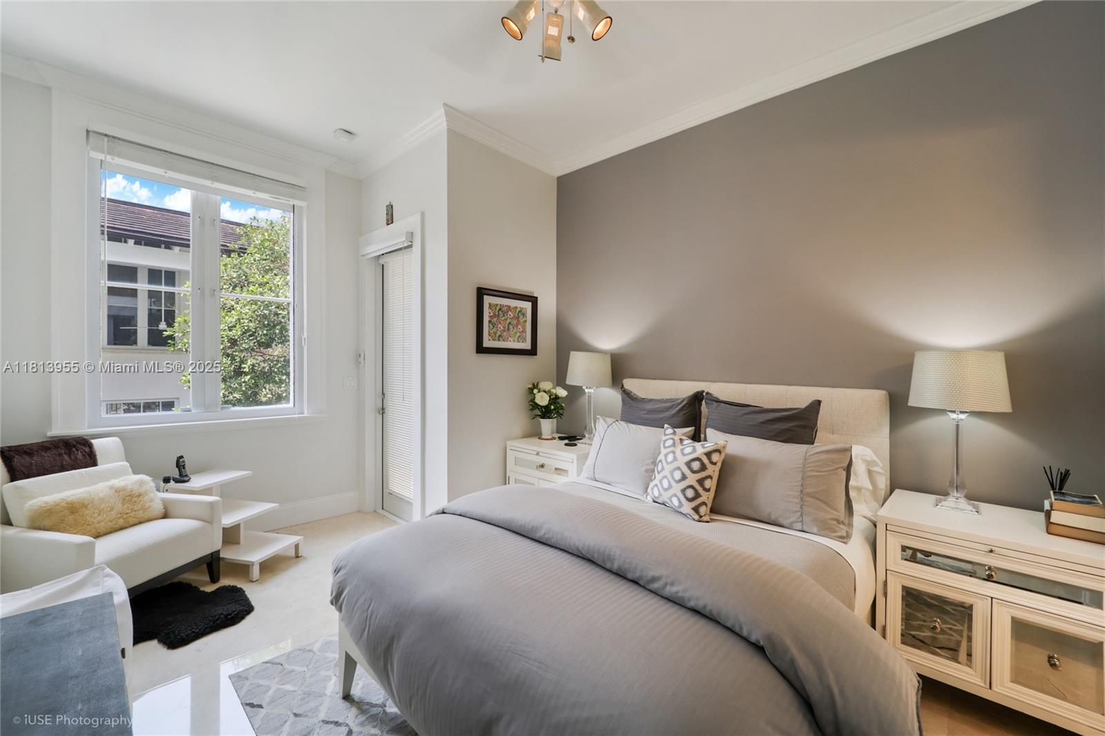 Meticulously redone in 2019, indulge in luxury at the architecturally awarded Almeria ROW ONE, designed by renowned Maria de la Guardia, distinguished by the Row House stone-clad exterior and sky-lit curving staircase, built by Venny Torre, known for excellence. 2019 curated finishes, renovated kitchen w/Sub Zero/Viking appliances, electric blinds, new AV, elevator, and solar panels. Natural light floods the upstairs landing, opening to the primary and Jr. suites, renovated bathrooms, walk-ins. Double doors and a wall of floor to ceiling windows off the kitchen and family room open to the private courtyard retreat with a European pool. Two en-suites, above the detached oversized garage, add to the flexible floor plan. Impeccable, sophisticated, this residence defines upscale urban living.