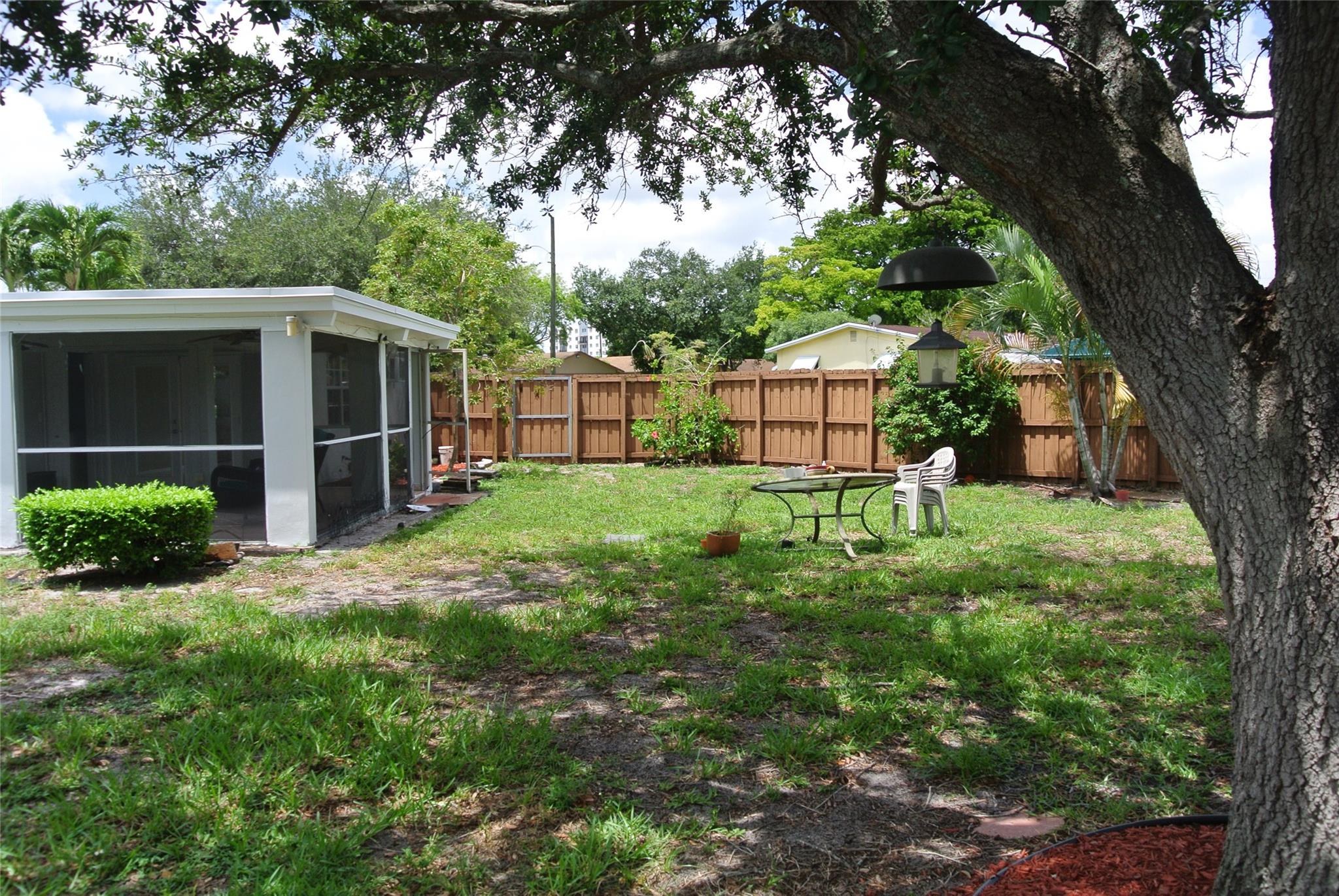 Unlimited possibilities in this charming and cozy single family home on corner lot with large circular driveway. Quiet and quaint neighborhood. Clean and freshly painted with detail trim around doors. Includes washer, dryer, whirlpool refrigerator and nice wood cabinets with tiled backsplash. Beautiful double glass doors lead to generous patio which is tiled and has screen enclosure for pets and children to enjoy. Huge backyard with banana tree, shed and completely fenced in. Room for an expansive pool and more! Roof is 2021. NO HOA. Centrally located. Minutes to the The Hard Rock Casino, amazing restaurants, great shopping and entertainment. Great Opportunity !