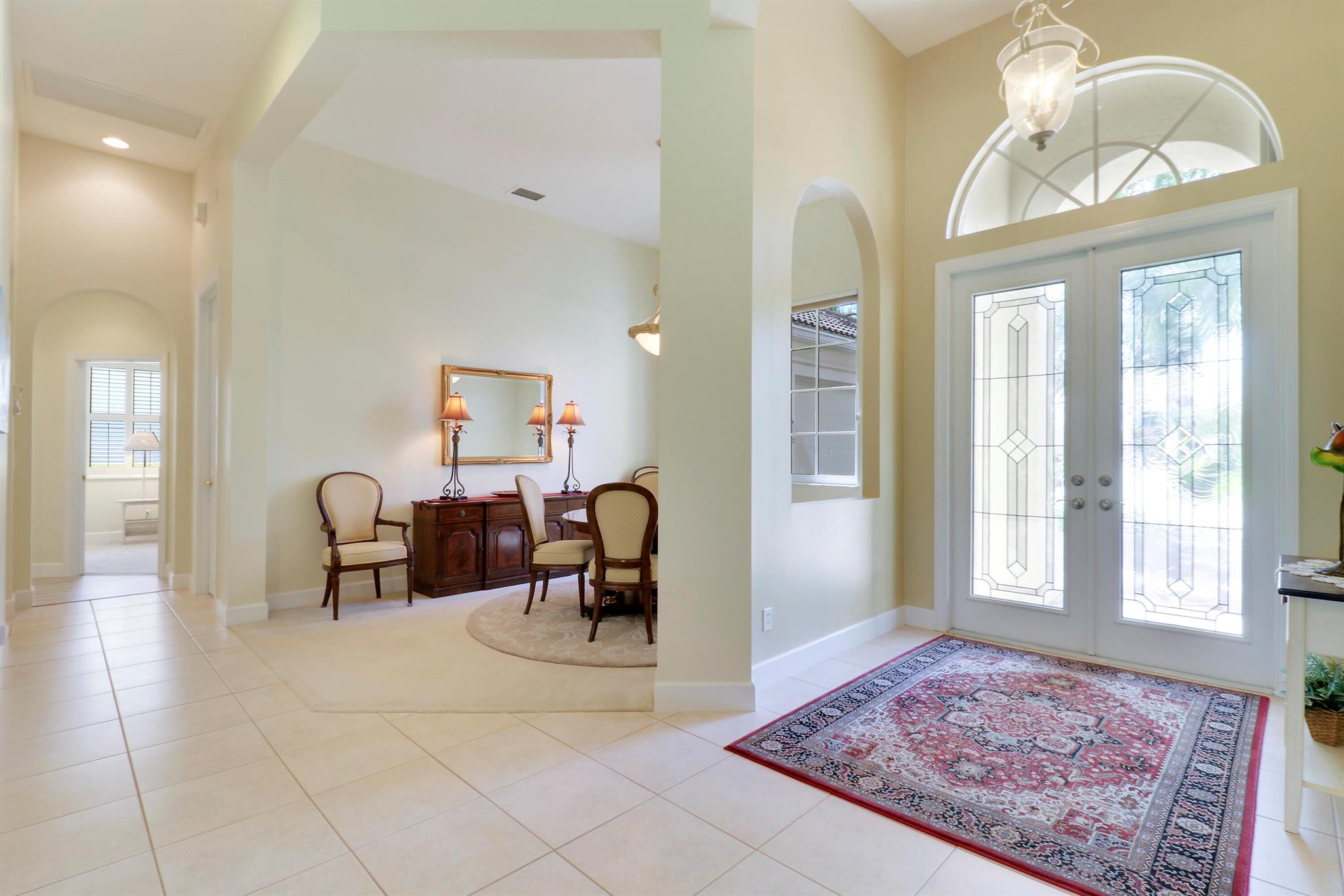 FANTASTIC VALUE IN PGA VILLAGE! Nestled on the 17th tee of the Ryder Course with a park-like setting and golf views! This 3BR+Den/2BA/2.5CG home has been lovingly enjoyed and has many charming features including built in shelving, a breakfast room, tall ceilings, dual glass entry front doors, a split bedroom plan, multiple doors leading out to the lanai, oversized garage w/ room for a golf cart and newer AC (2021). The spacious living area is brimming with light and overlooks the back yard. Kitchen opens to the breakfast room, has newer SS appliances, solid surface counters and a breakfast bar. The master suite has a large walk-in closet, access to the patio as well as an ensuite with dual vanities, walk-in shower and soaking tub. Two additional bedrooms share a hall bath.