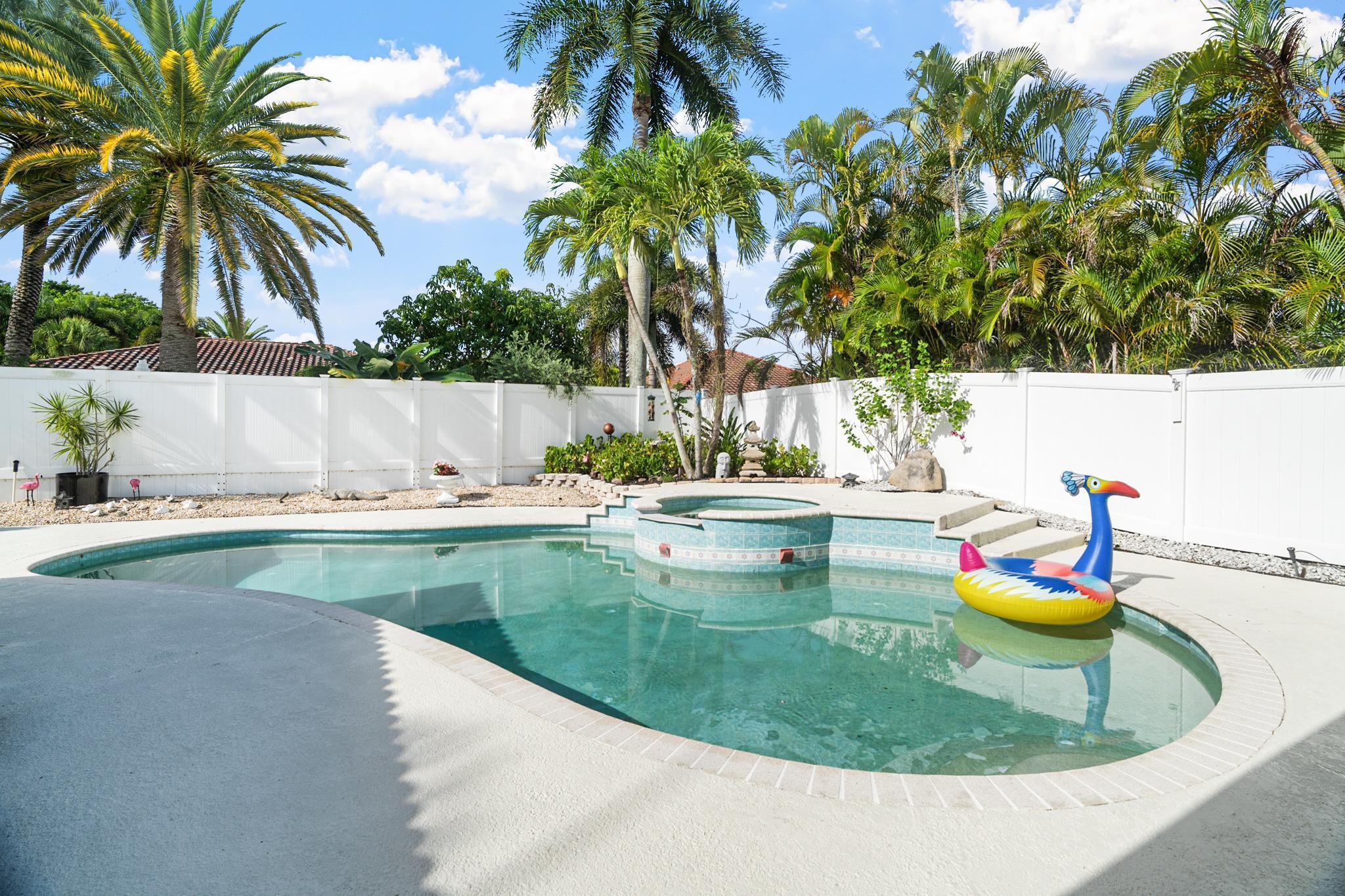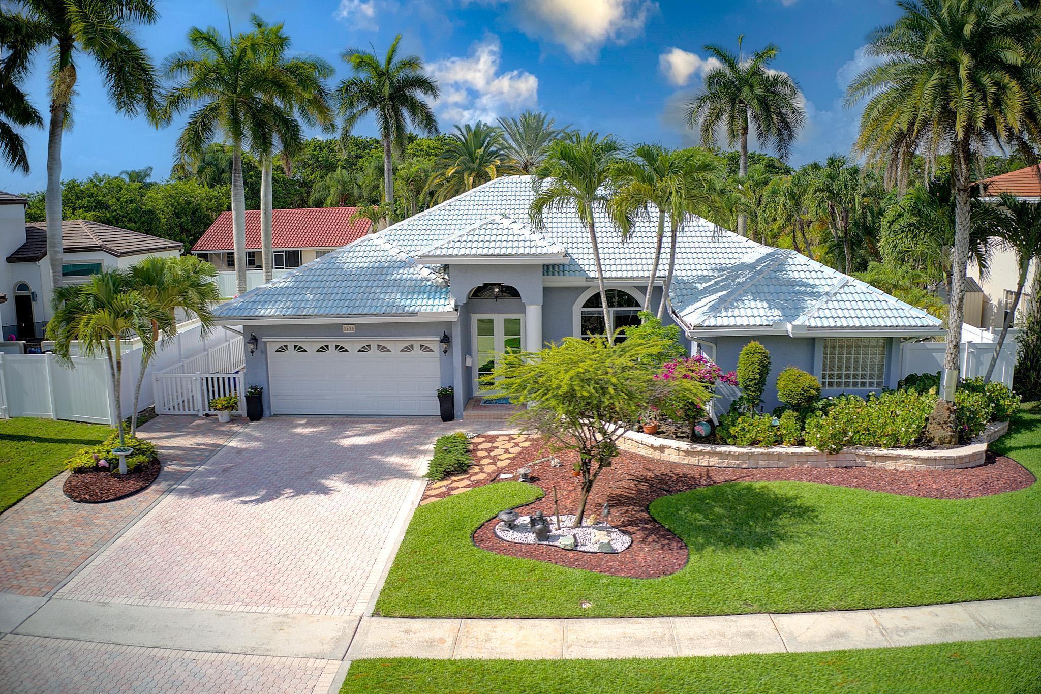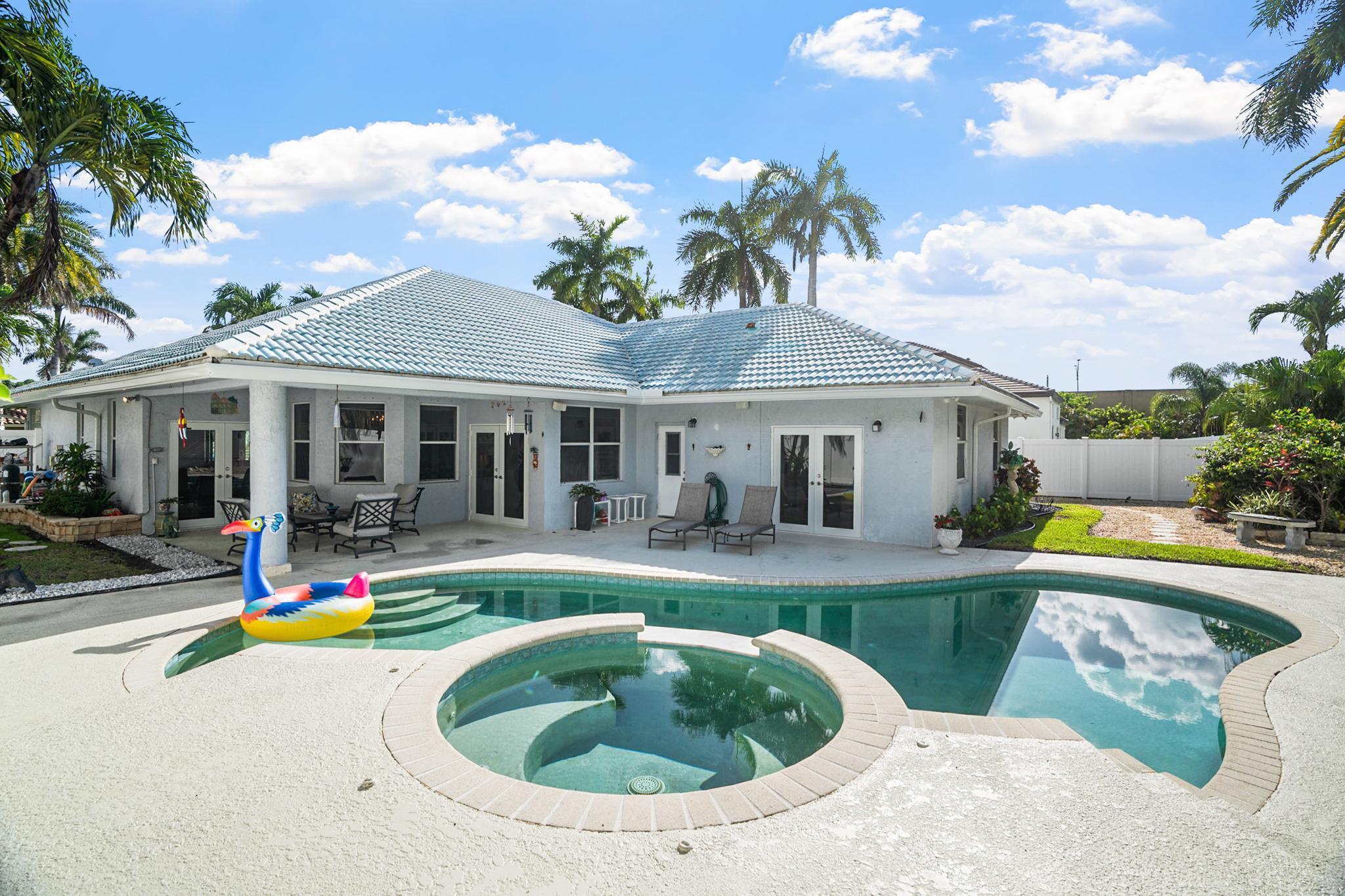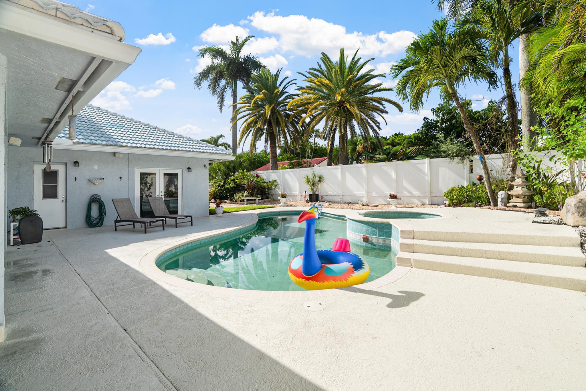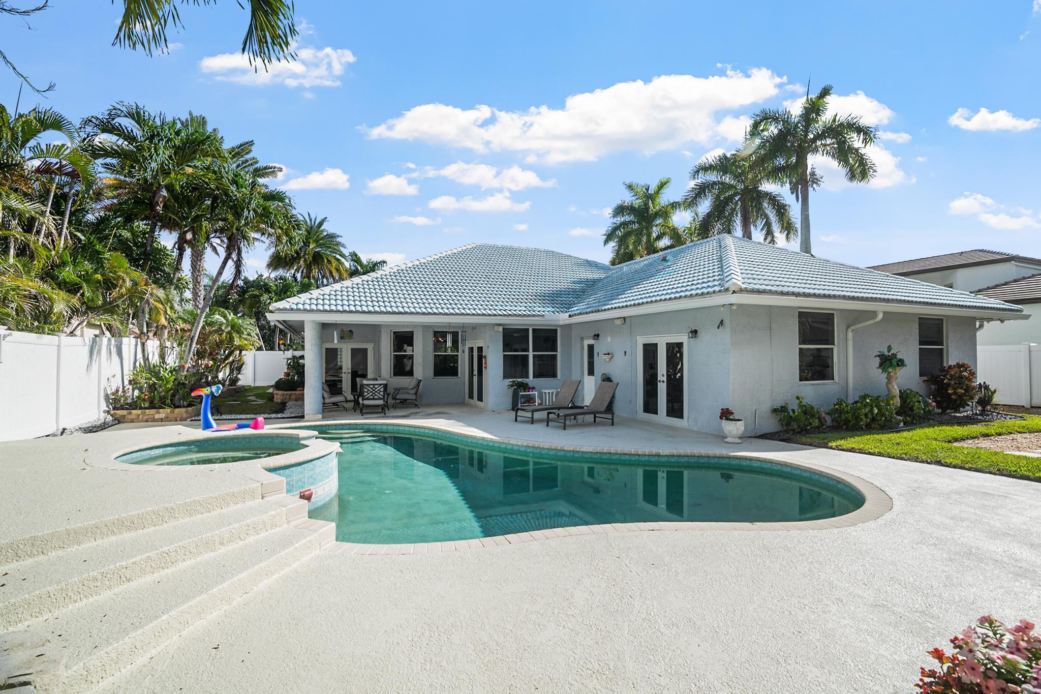 Nestled in a quiet enclave in desirable East Boca Raton, this Mizner Forest home was built in 1998 and offers a thoughtfully designed layout with stylish upgrades throughout. Featuring soaring high ceilings and a renovated white kitchen, the home has modern flooring throughout the main living areas and one guest bedroom & family room. The split bedroom floor plan offers privacy, and the spacious primary suite includes direct access to the covered patio and pool area. Primary bath features a separate soaking tub and shower. Additional highlights include a 3-year-old A/C system, a tankless water heater, and an extra water heater dedicated to the primary suite. Impact doors. Fully fenced backyard is an entertainer's dream, showcasing a stunning pool &expansive patio