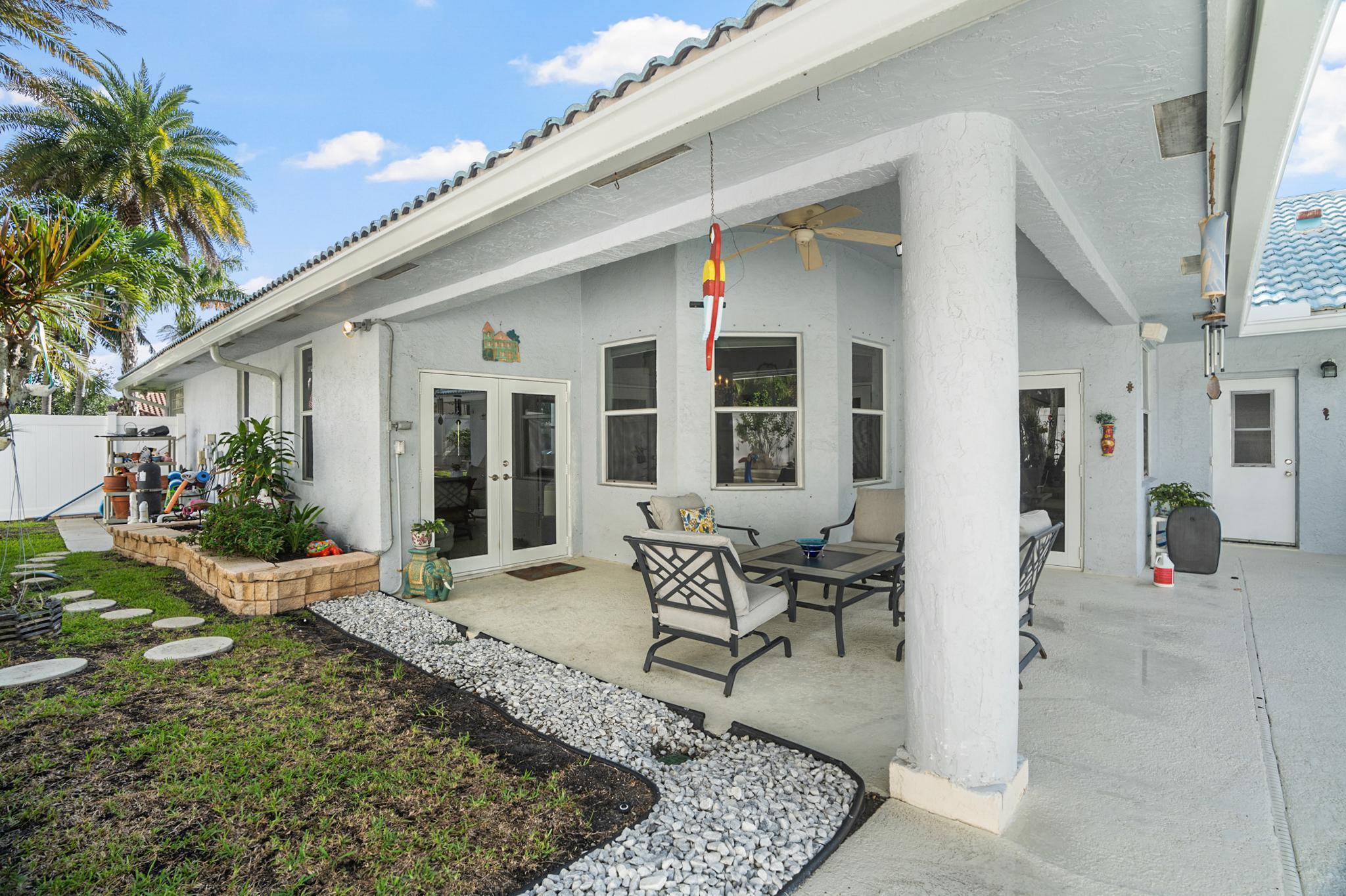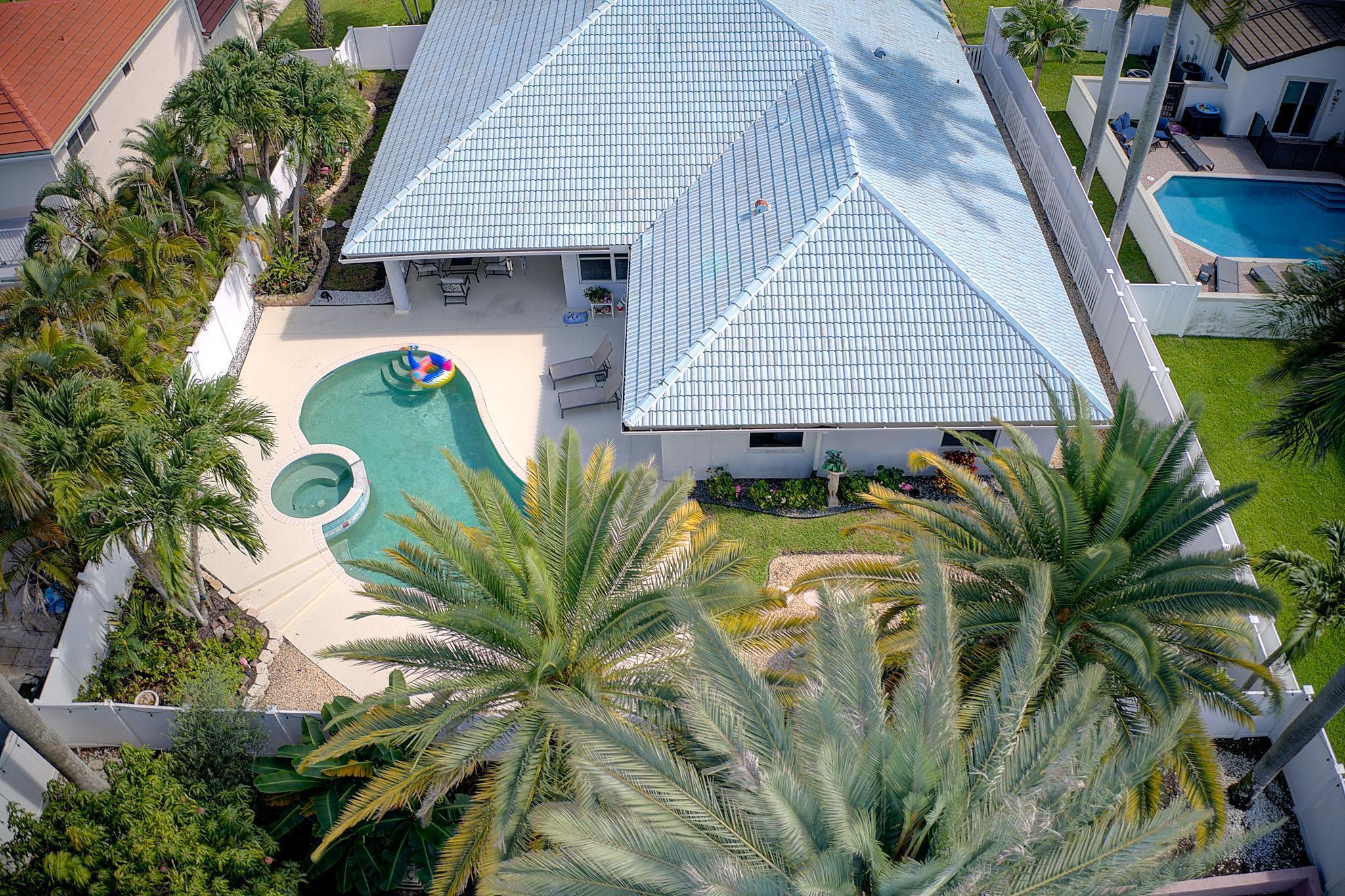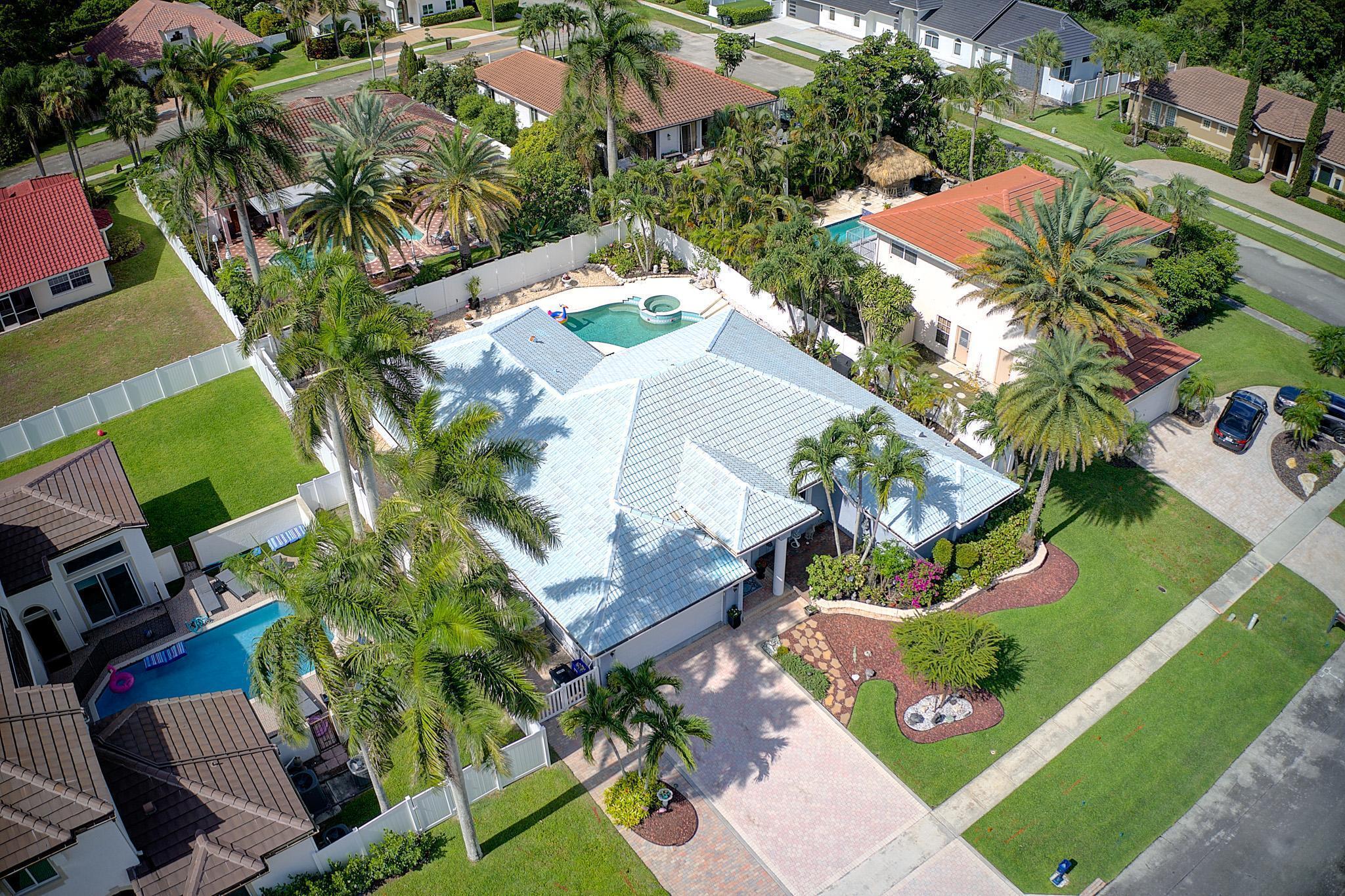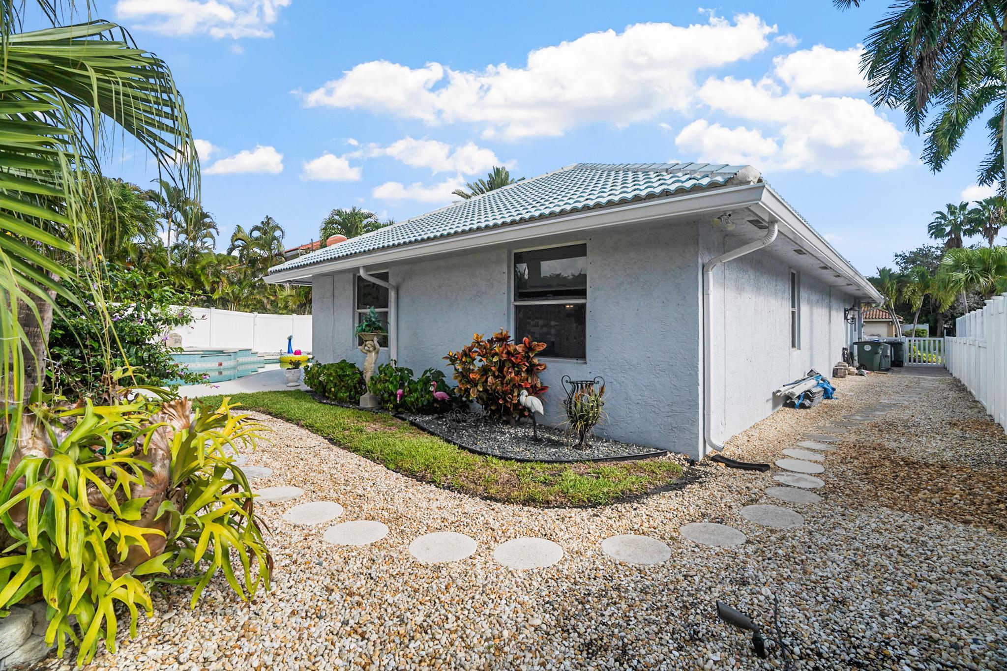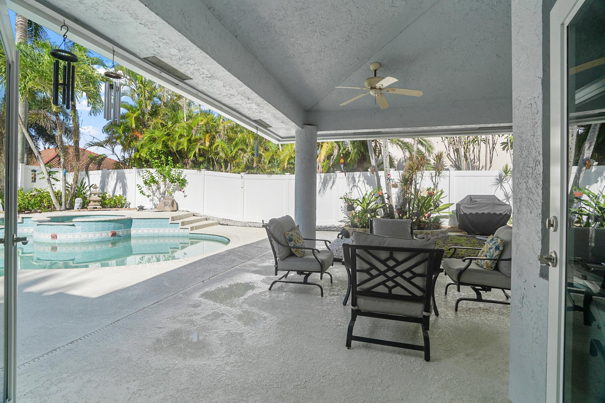 Nestled in a quiet enclave in desirable East Boca Raton, this Mizner Forest home was built in 1998 and offers a thoughtfully designed layout with stylish upgrades throughout. Featuring soaring high ceilings and a renovated white kitchen, the home has modern flooring throughout the main living areas and one guest bedroom & family room. The split bedroom floor plan offers privacy, and the spacious primary suite includes direct access to the covered patio and pool area. Primary bath features a separate soaking tub and shower. Additional highlights include a 3-year-old A/C system, a tankless water heater, and an extra water heater dedicated to the primary suite. Impact doors. Fully fenced backyard is an entertainer's dream, showcasing a stunning pool &expansive patio
