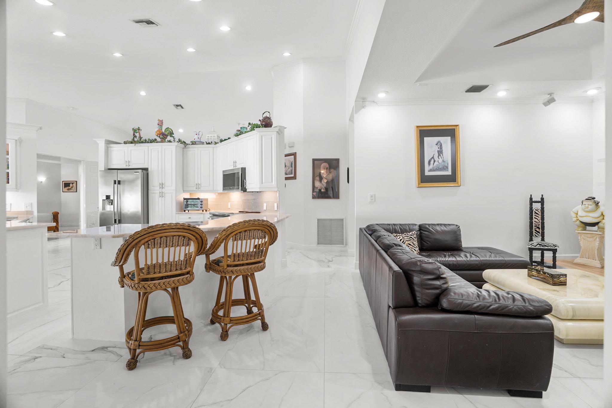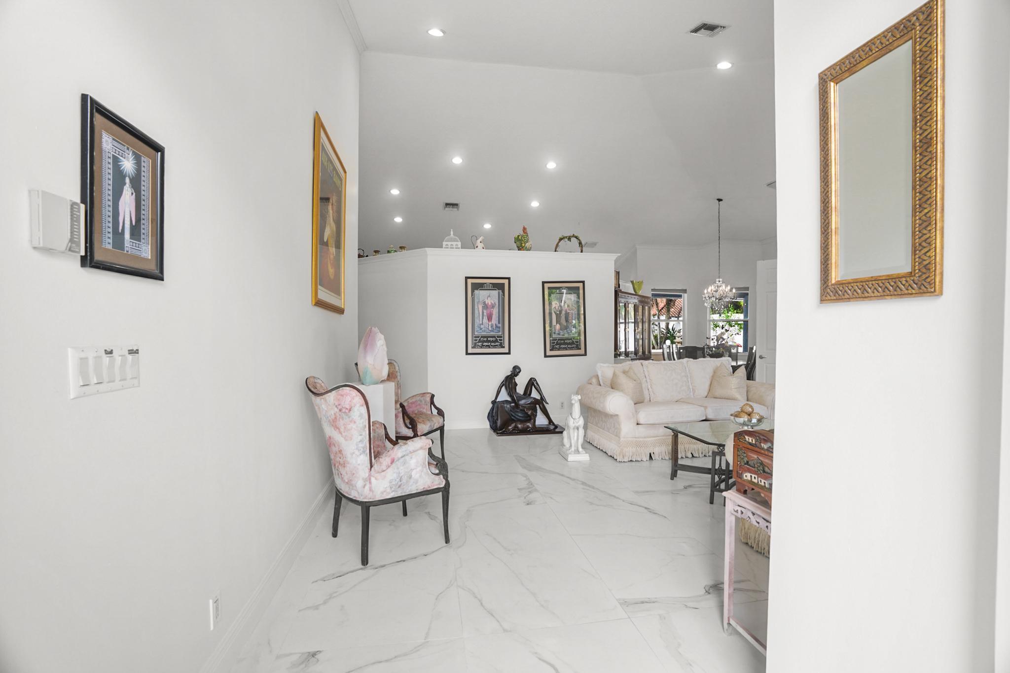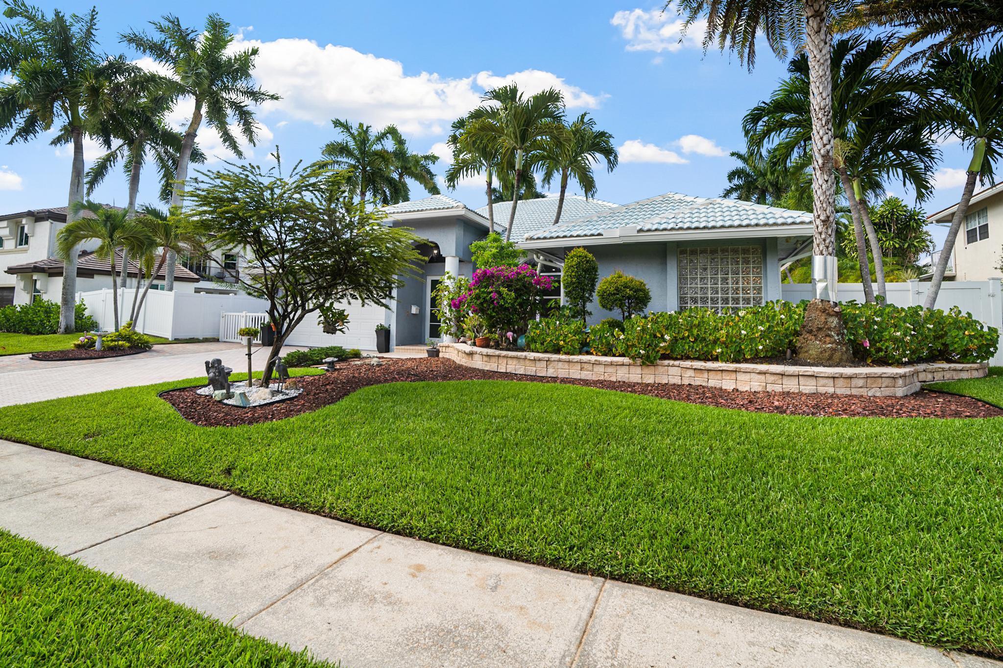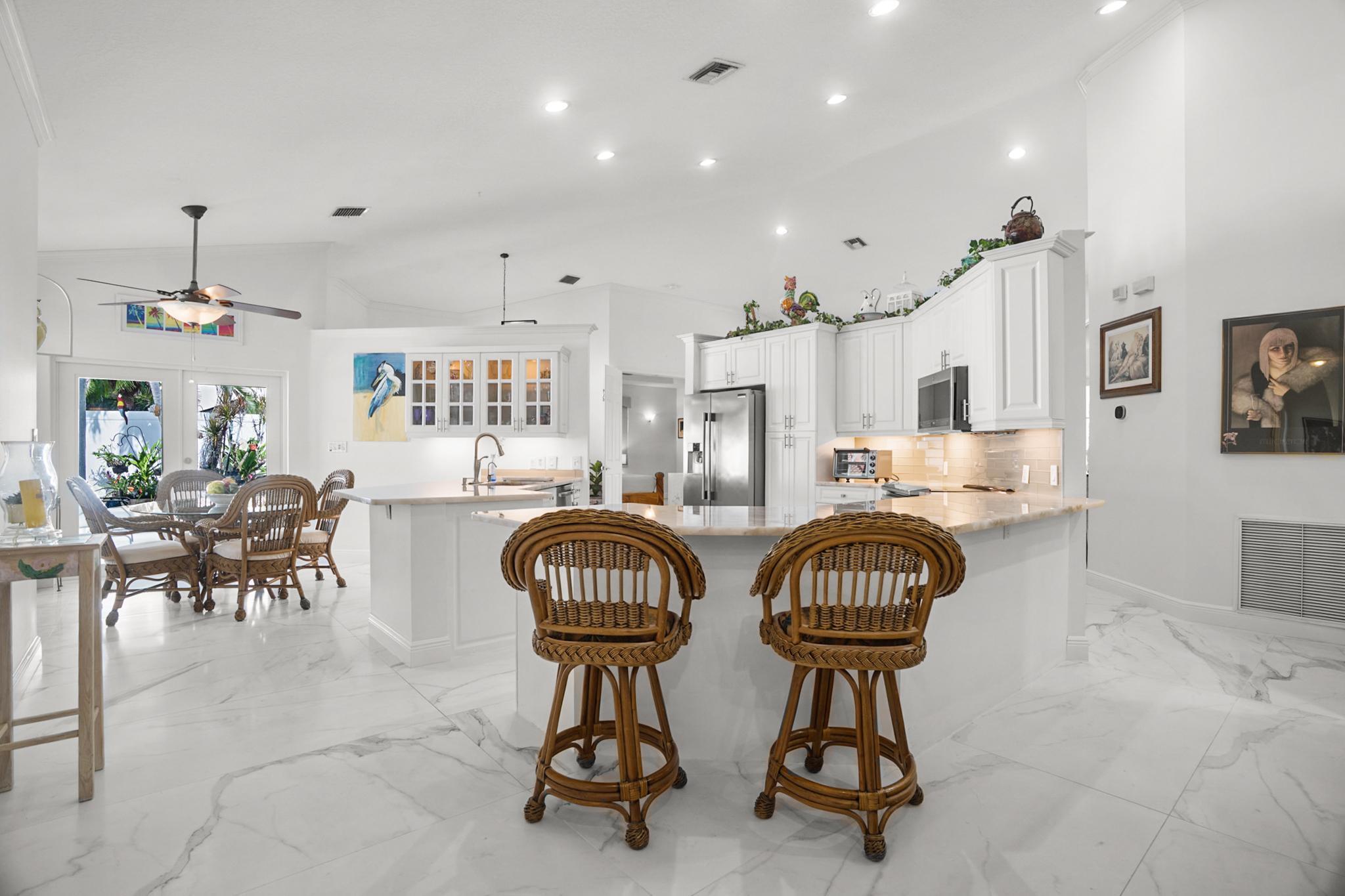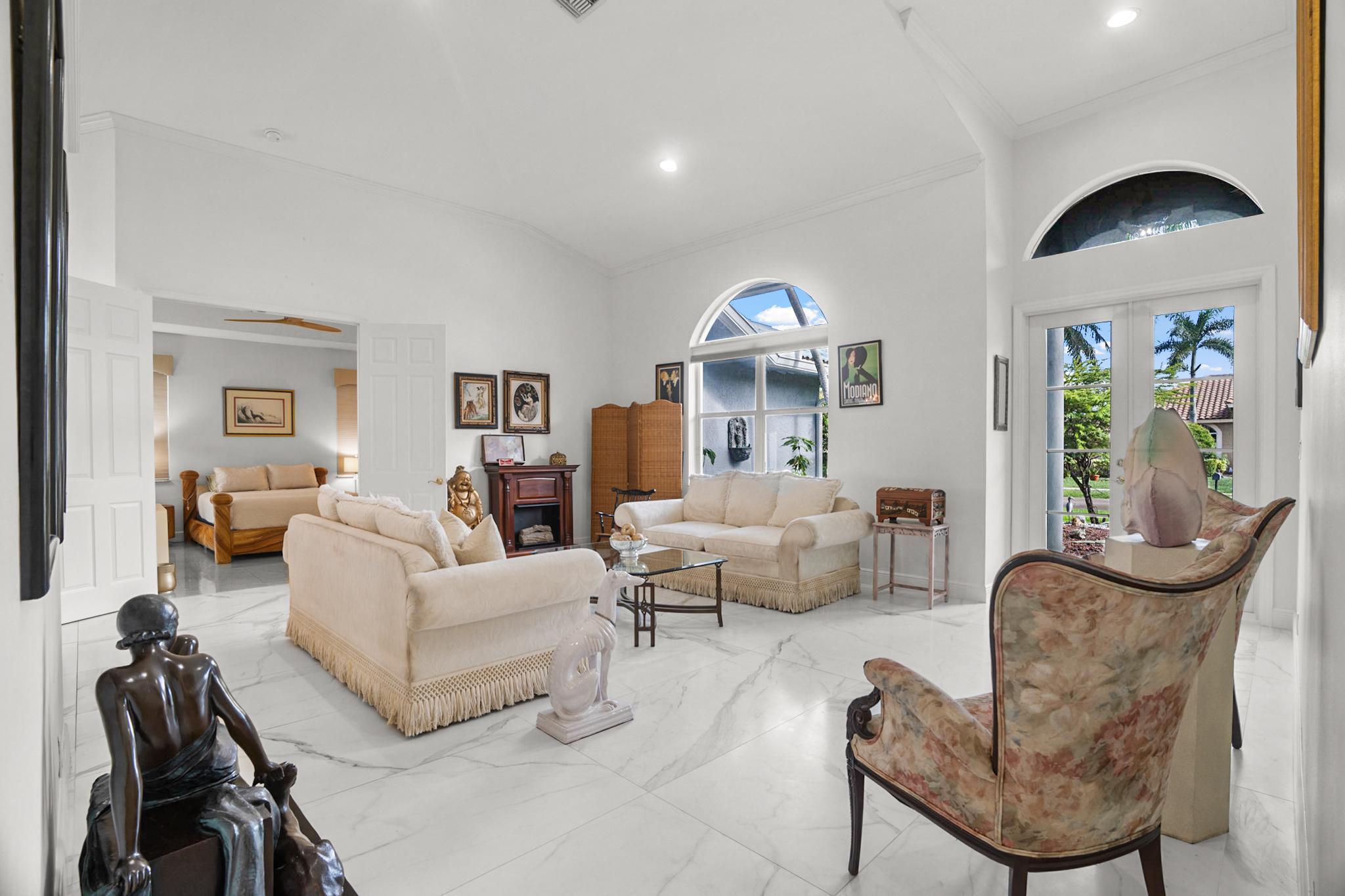 Nestled in a quiet enclave in desirable East Boca Raton, this Mizner Forest home was built in 1998 and offers a thoughtfully designed layout with stylish upgrades throughout. Featuring soaring high ceilings and a renovated white kitchen, the home has modern flooring throughout the main living areas and one guest bedroom & family room. The split bedroom floor plan offers privacy, and the spacious primary suite includes direct access to the covered patio and pool area. Primary bath features a separate soaking tub and shower. Additional highlights include a 3-year-old A/C system, a tankless water heater, and an extra water heater dedicated to the primary suite. Impact doors. Fully fenced backyard is an entertainer's dream, showcasing a stunning pool &expansive patio