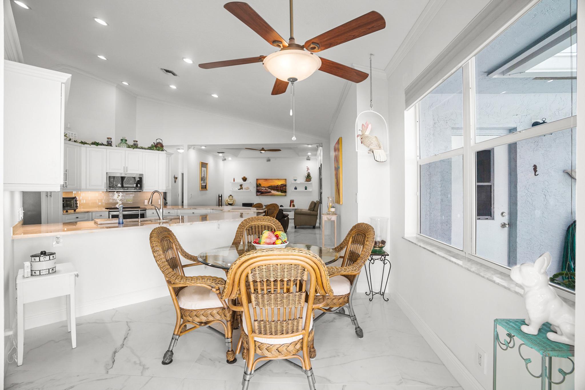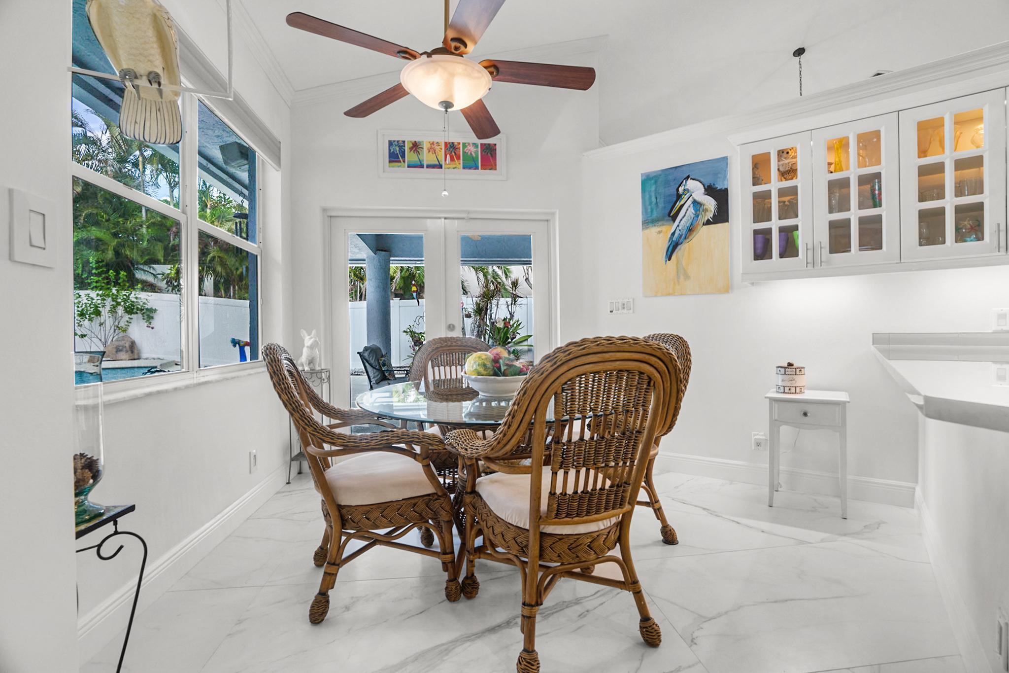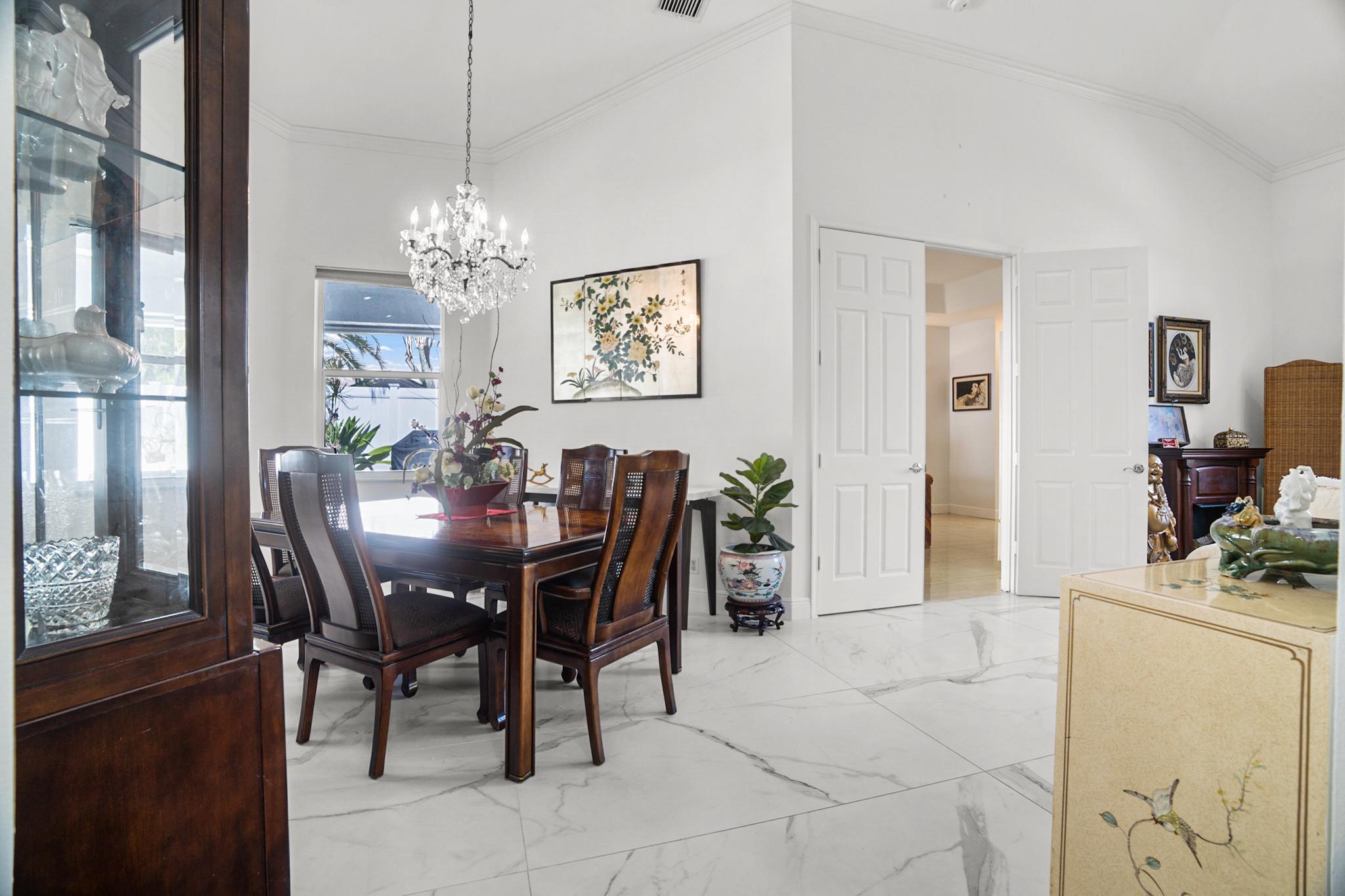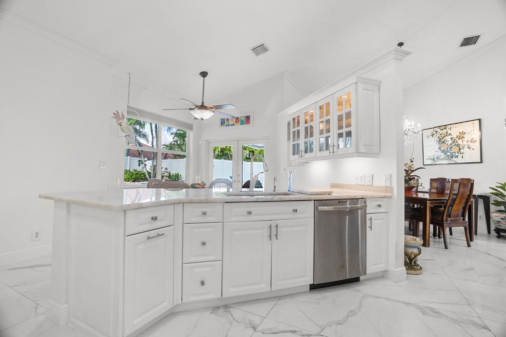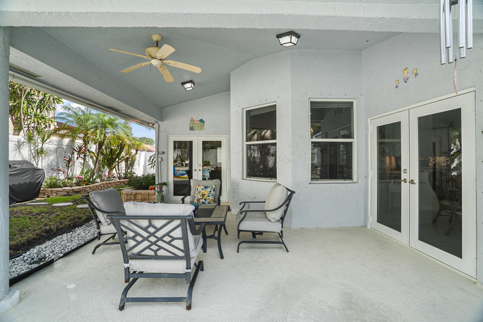 Nestled in a quiet enclave in desirable East Boca Raton, this Mizner Forest home was built in 1998 and offers a thoughtfully designed layout with stylish upgrades throughout. Featuring soaring high ceilings and a renovated white kitchen, the home has modern flooring throughout the main living areas and one guest bedroom & family room. The split bedroom floor plan offers privacy, and the spacious primary suite includes direct access to the covered patio and pool area. Primary bath features a separate soaking tub and shower. Additional highlights include a 3-year-old A/C system, a tankless water heater, and an extra water heater dedicated to the primary suite. Impact doors. Fully fenced backyard is an entertainer's dream, showcasing a stunning pool &expansive patio