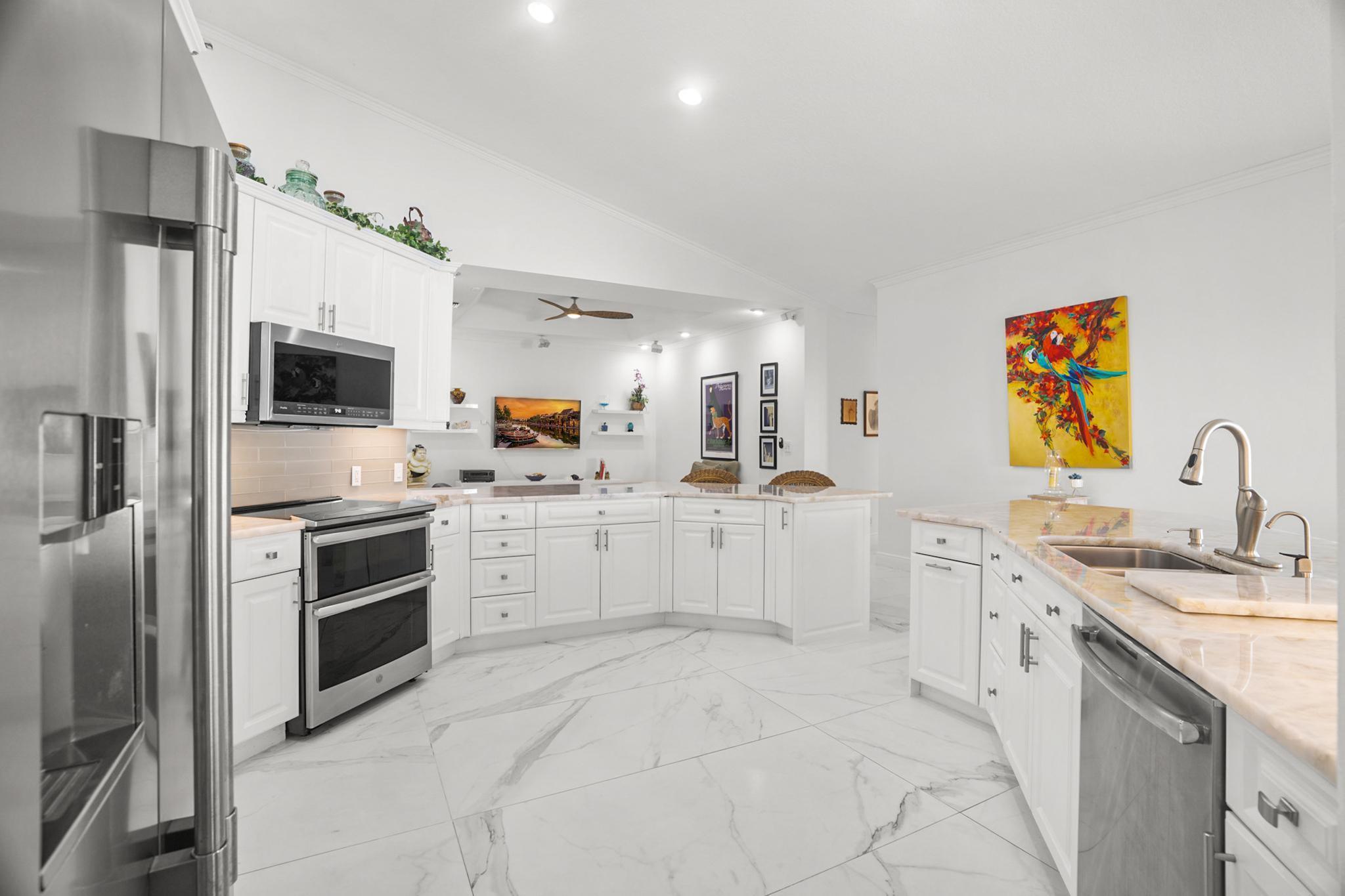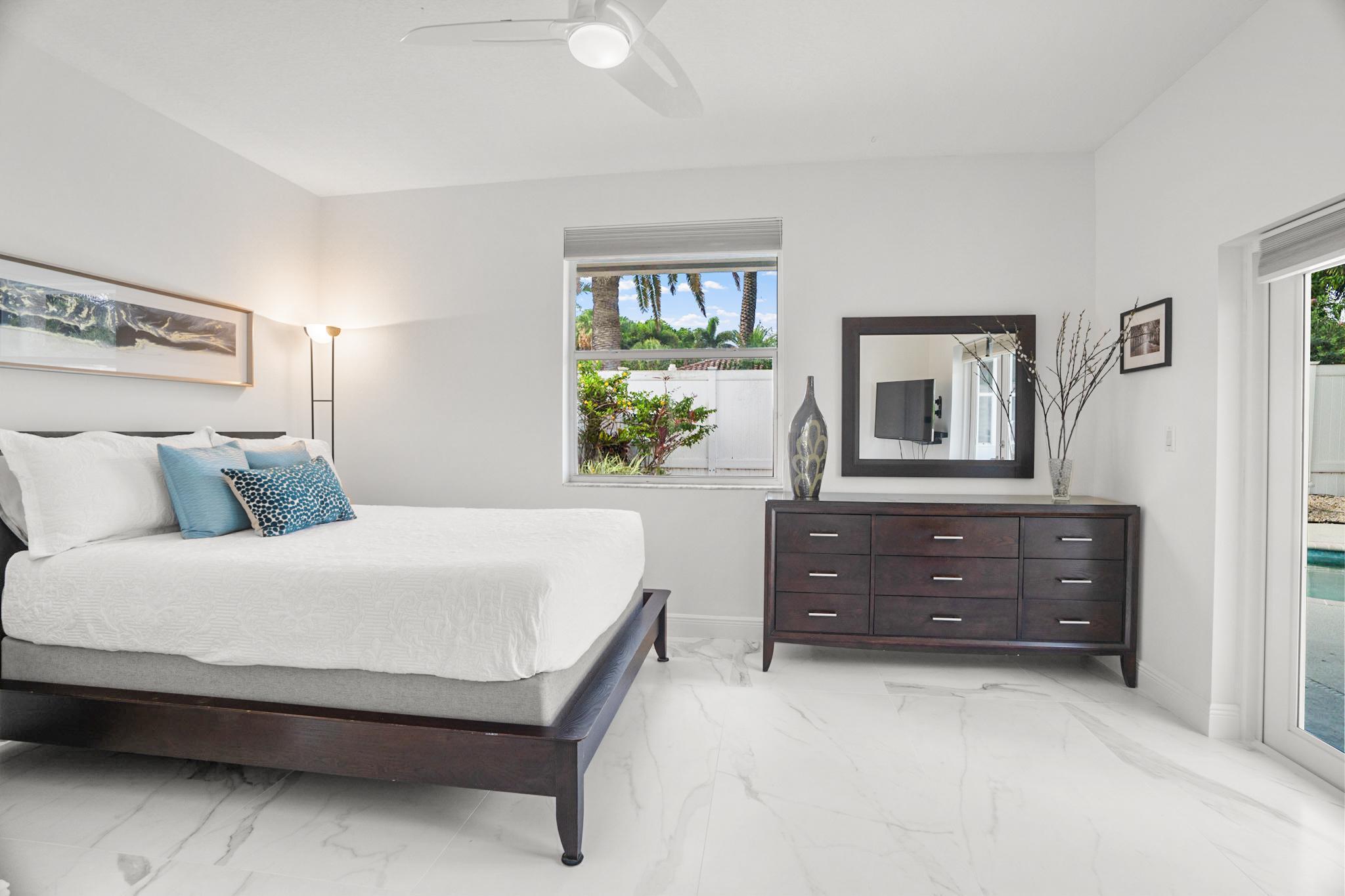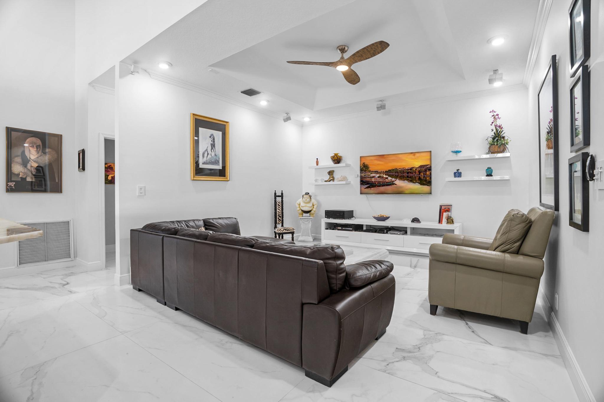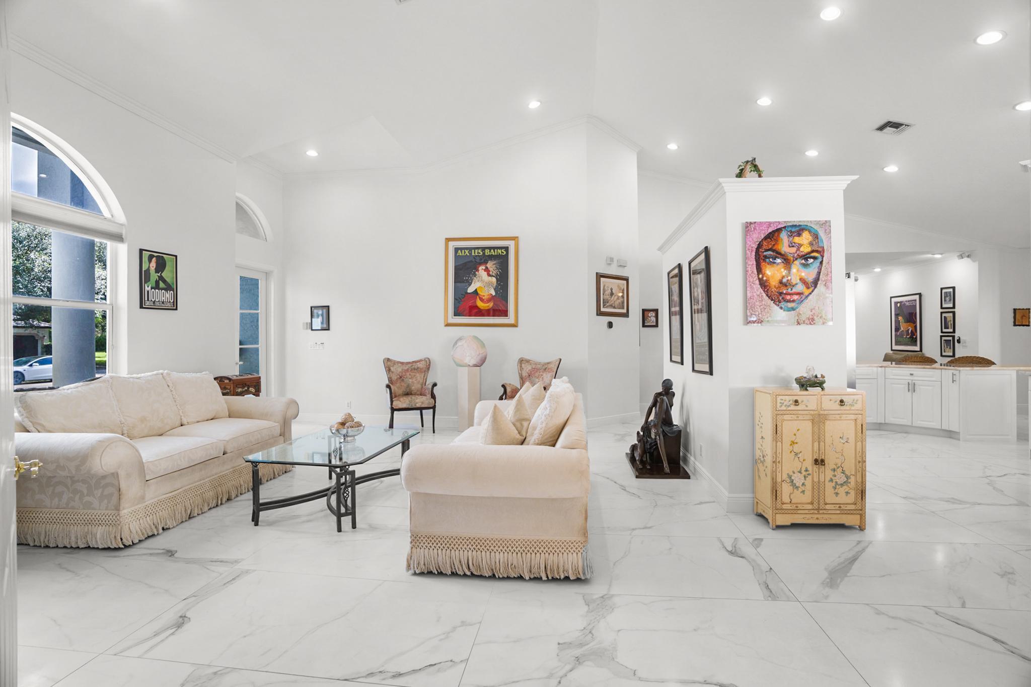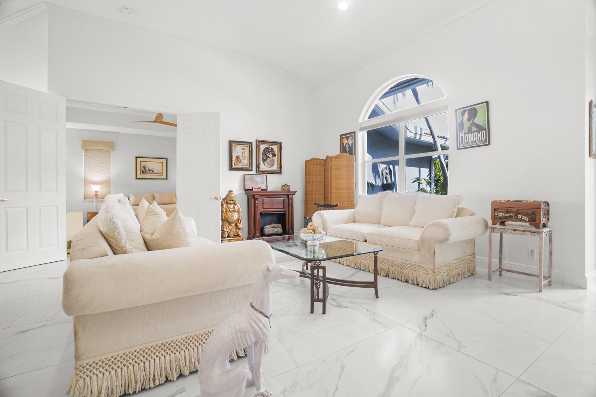 Nestled in a quiet enclave in desirable East Boca Raton, this Mizner Forest home was built in 1998 and offers a thoughtfully designed layout with stylish upgrades throughout. Featuring soaring high ceilings and a renovated white kitchen, the home has modern flooring throughout the main living areas and one guest bedroom & family room. The split bedroom floor plan offers privacy, and the spacious primary suite includes direct access to the covered patio and pool area. Primary bath features a separate soaking tub and shower. Additional highlights include a 3-year-old A/C system, a tankless water heater, and an extra water heater dedicated to the primary suite. Impact doors. Fully fenced backyard is an entertainer's dream, showcasing a stunning pool &expansive patio