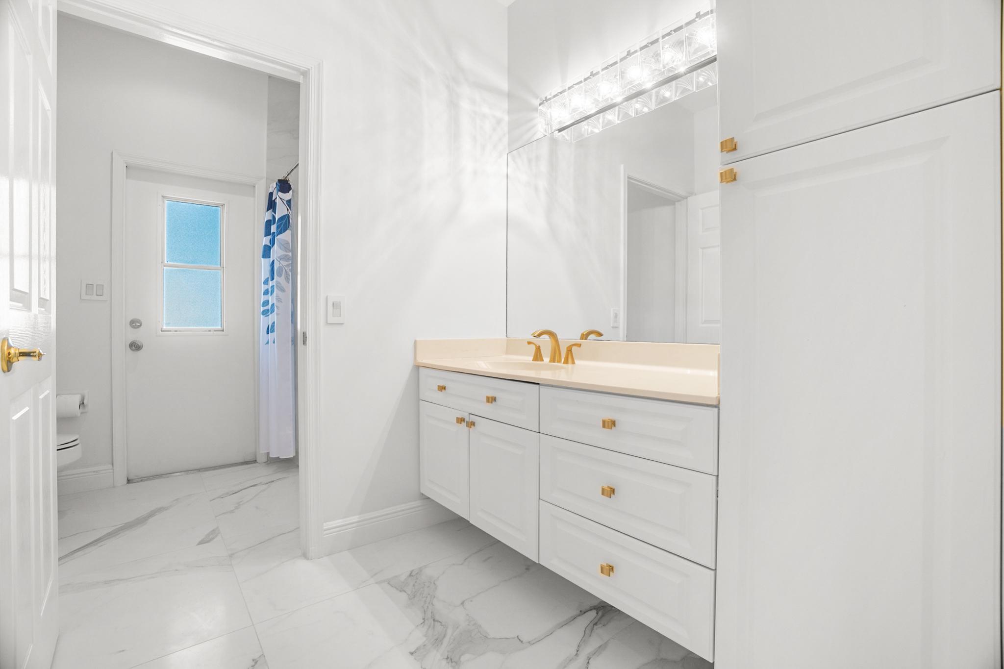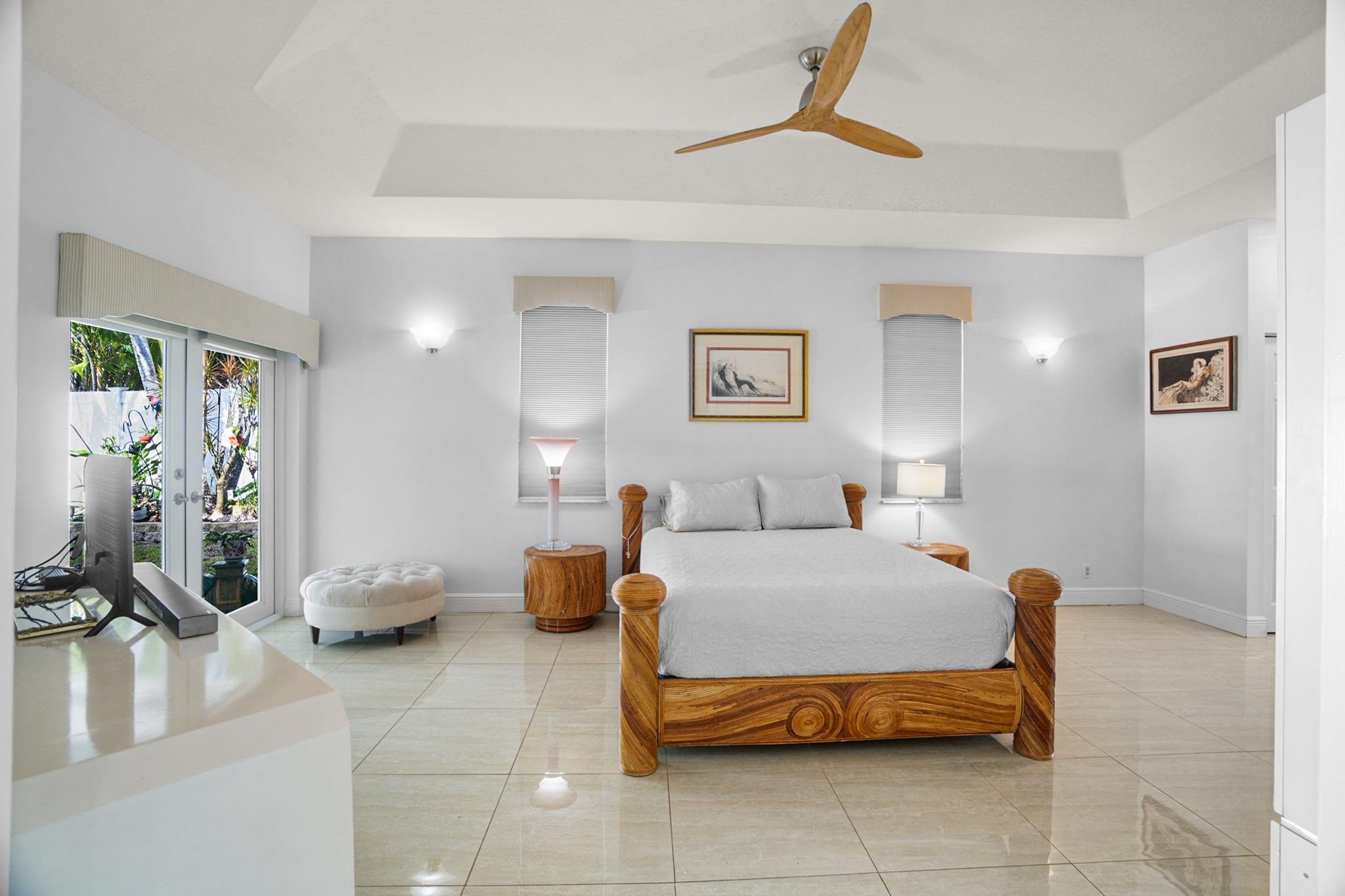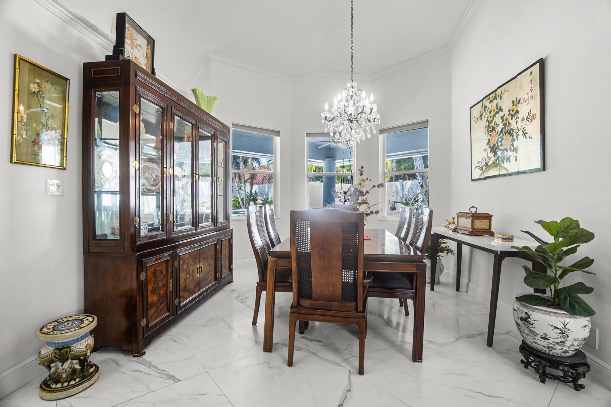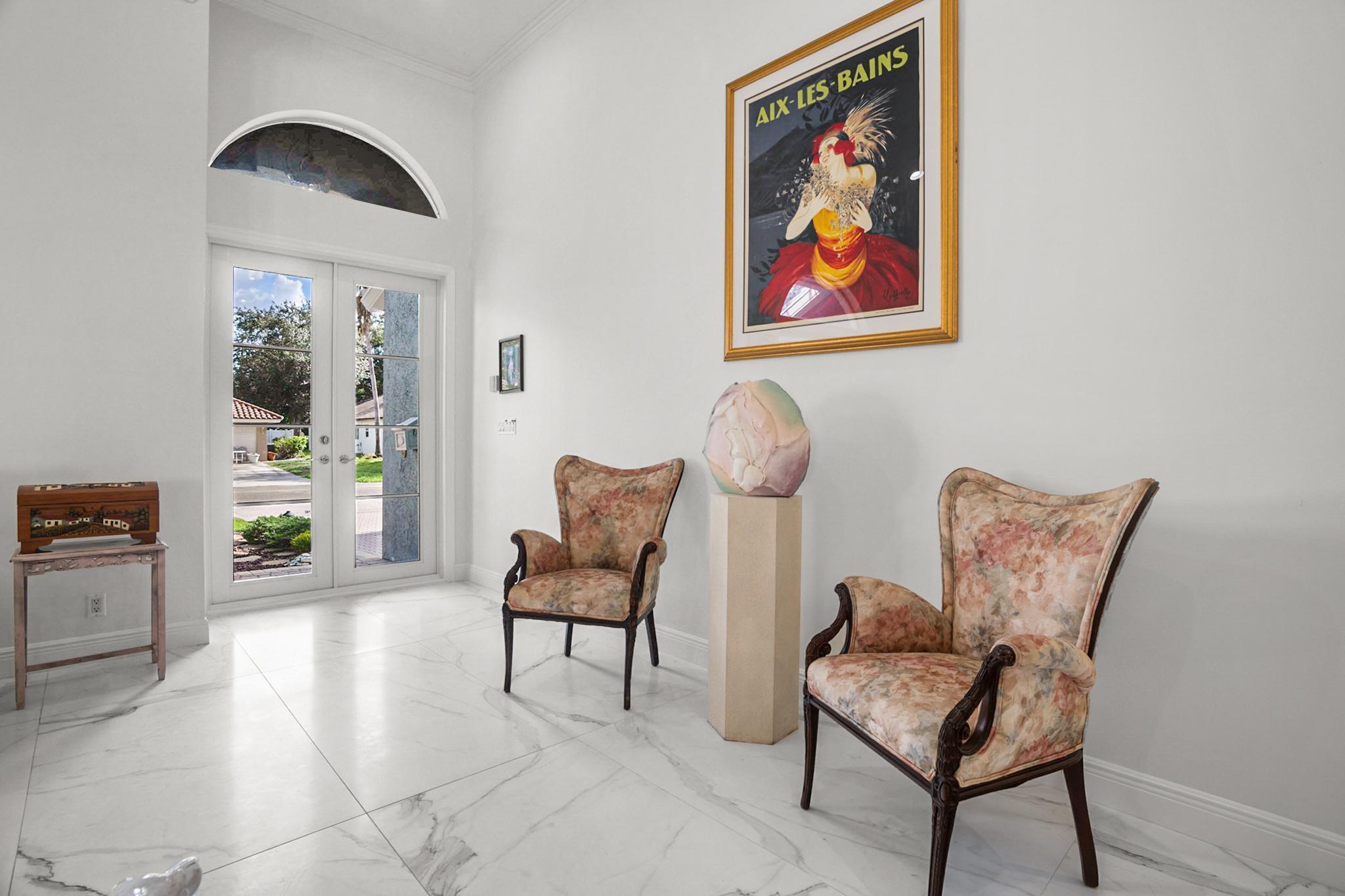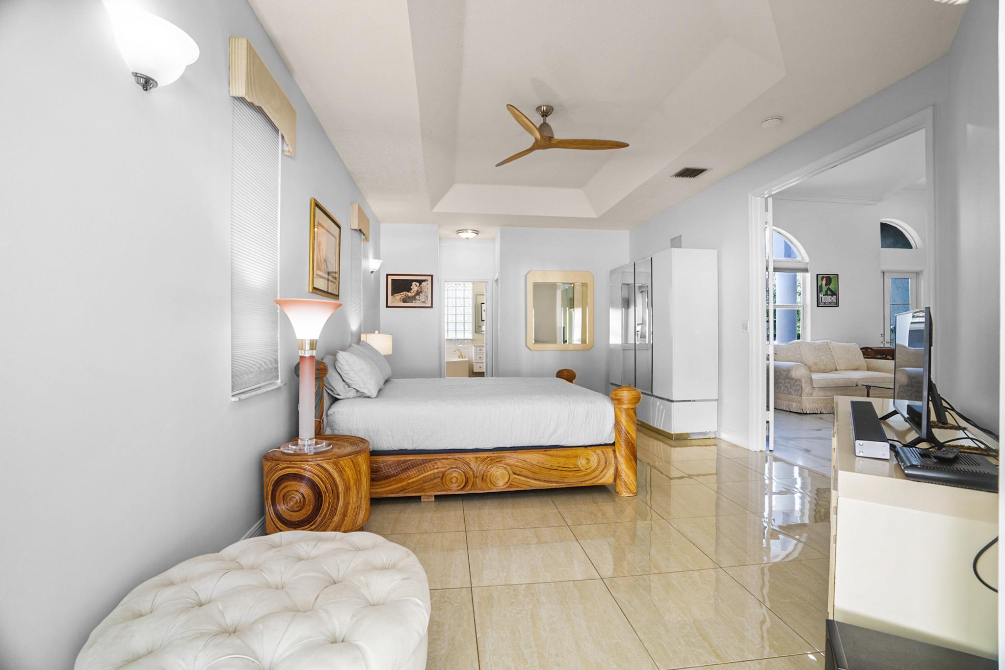 Nestled in a quiet enclave in desirable East Boca Raton, this Mizner Forest home was built in 1998 and offers a thoughtfully designed layout with stylish upgrades throughout. Featuring soaring high ceilings and a renovated white kitchen, the home has modern flooring throughout the main living areas and one guest bedroom & family room. The split bedroom floor plan offers privacy, and the spacious primary suite includes direct access to the covered patio and pool area. Primary bath features a separate soaking tub and shower. Additional highlights include a 3-year-old A/C system, a tankless water heater, and an extra water heater dedicated to the primary suite. Impact doors. Fully fenced backyard is an entertainer's dream, showcasing a stunning pool &expansive patio