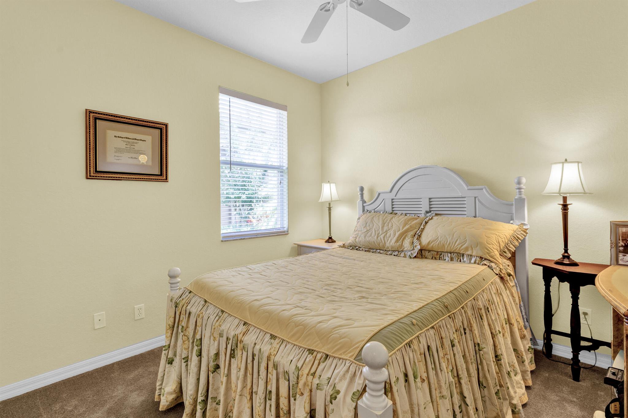 Located on a lake with a view of a beautiful tropical backyard from the lanai. Impact windows, large eat-in kitchen, and an open living area. Primary bedroom/bath is spacious with dual sinks, separate walk-in shower, soaking tub. The Woodfield Clubhouse has a resort-style heated pool & spa, bocce ball, Har-tru tennis courts, a billiard room, full fitness center and onsite management. Most of all, there are many social activities all month long. Close to great shopping, dining and, of course, Vero's beautiful beaches.