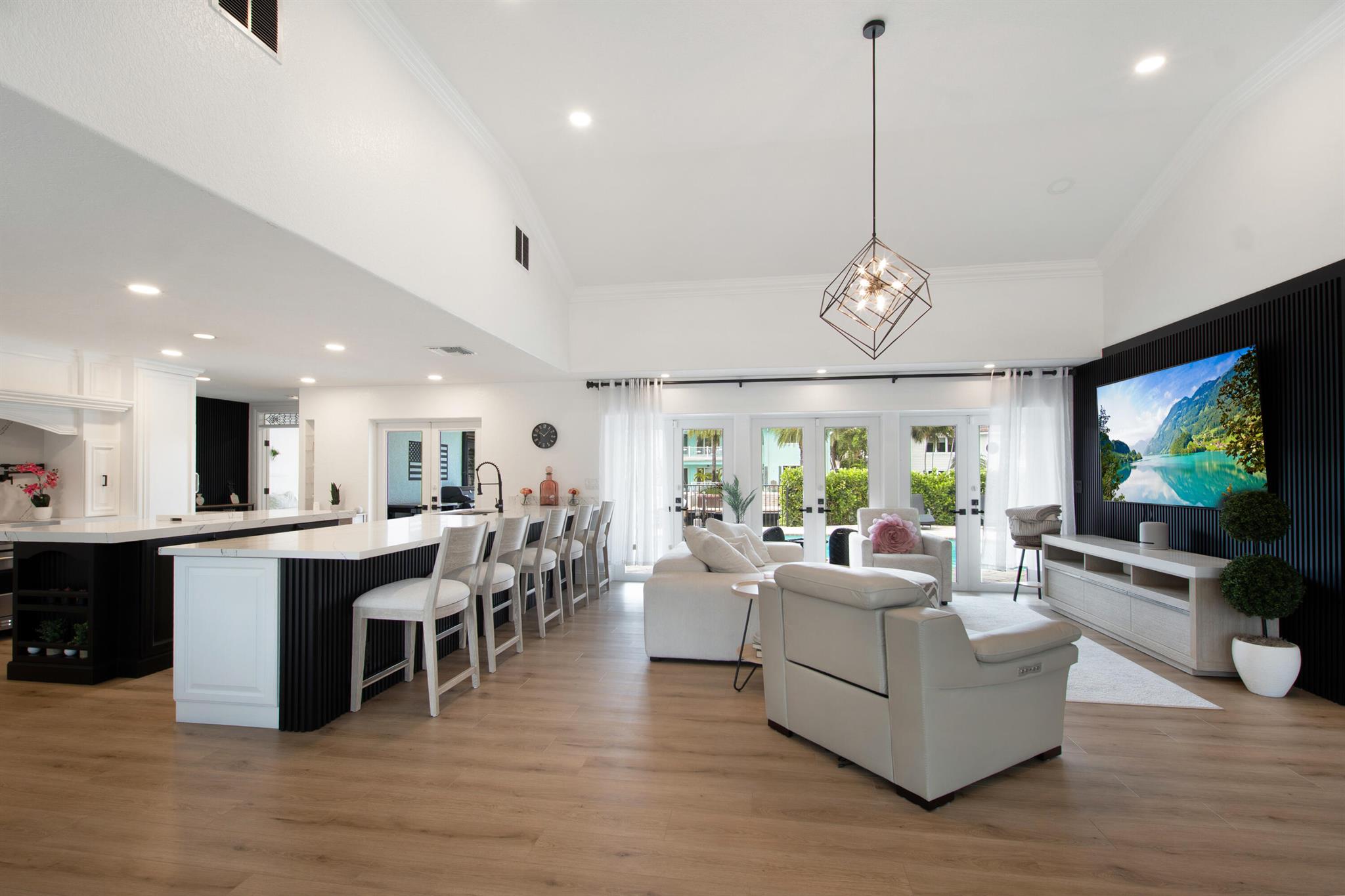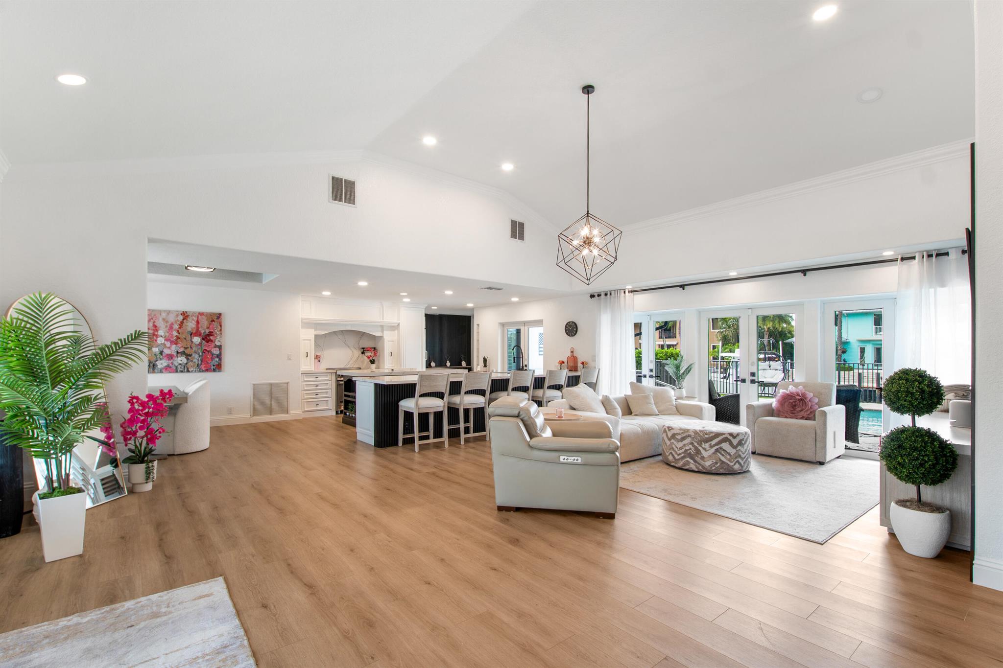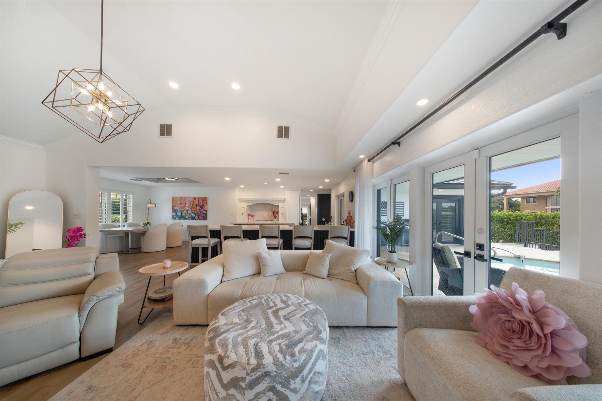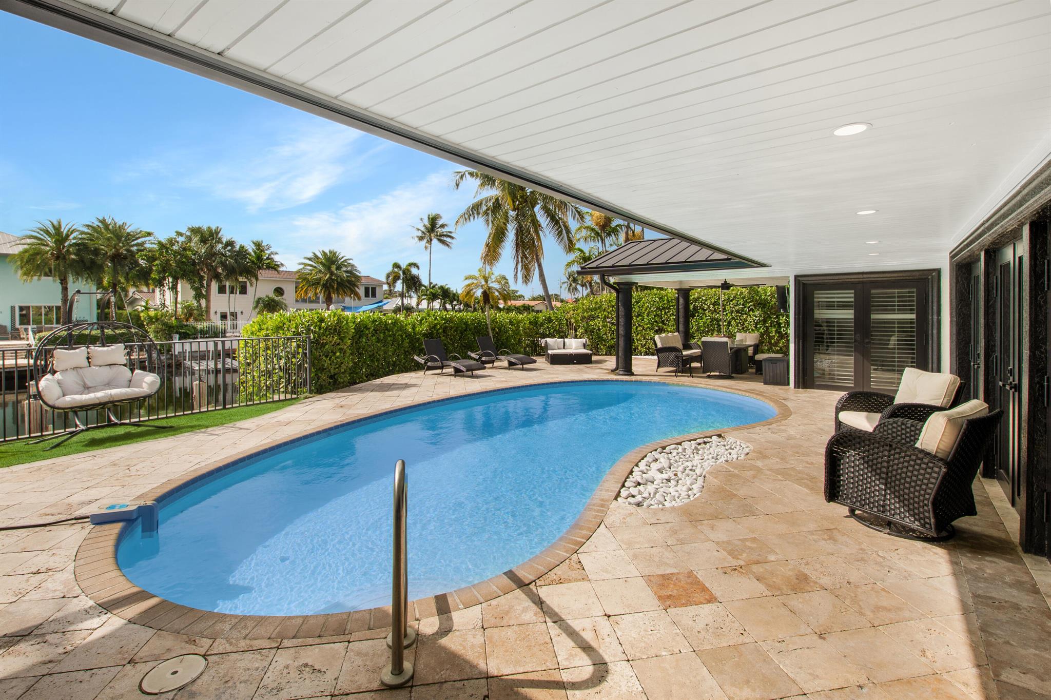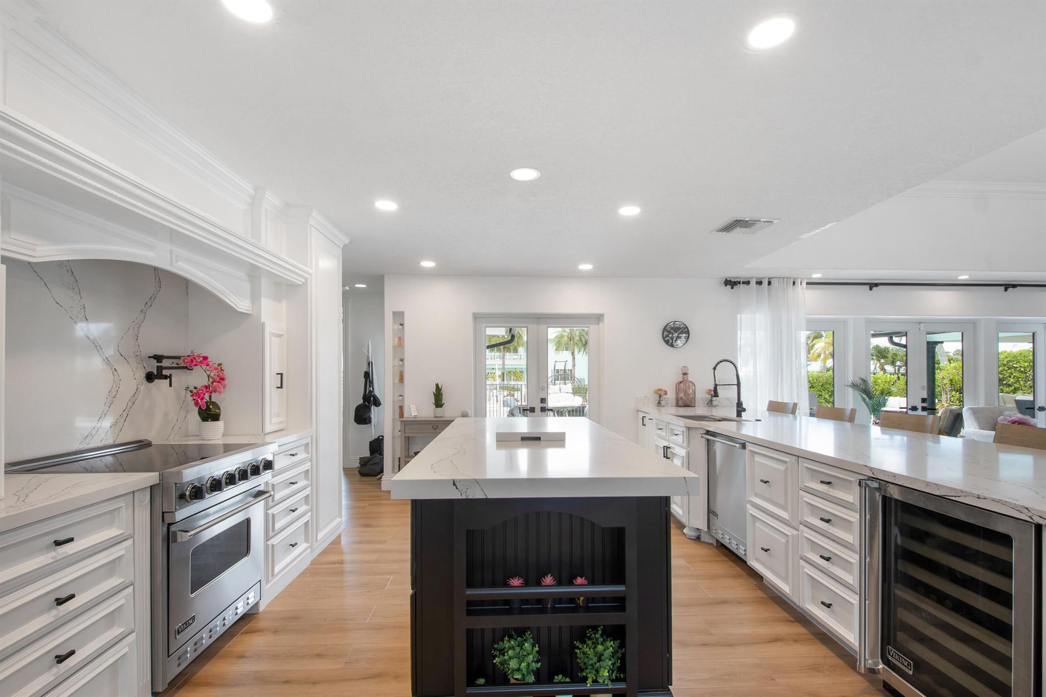 This beautifully redesigned estate in Venetian Isles offers 90 feet of waterfront and a private dock, ideal for those who desire the ultimate in coastal living. Highlights include dual primary suites, elegant marble and modern porcelain tile flooring, refined millwork, plantation shutters, and soaring ceilings. French doors in every room create a seamless indoor-outdoor flow, opening onto expansive terraces that embrace the waterfront setting.