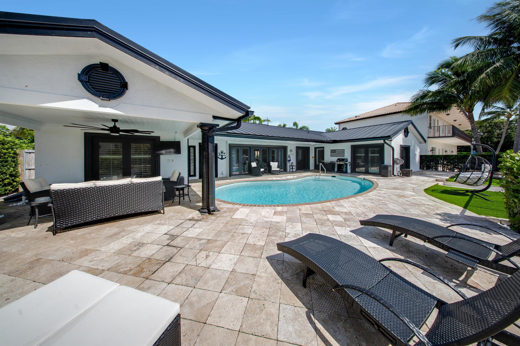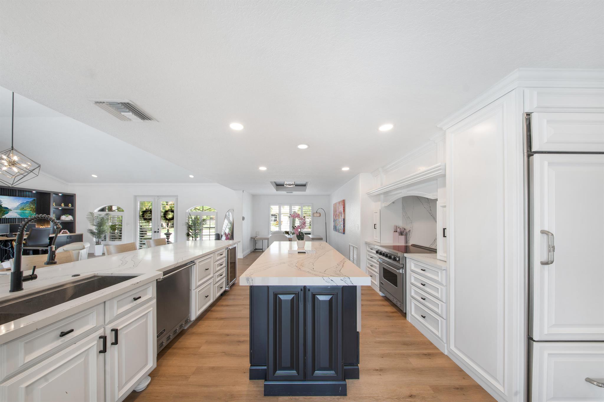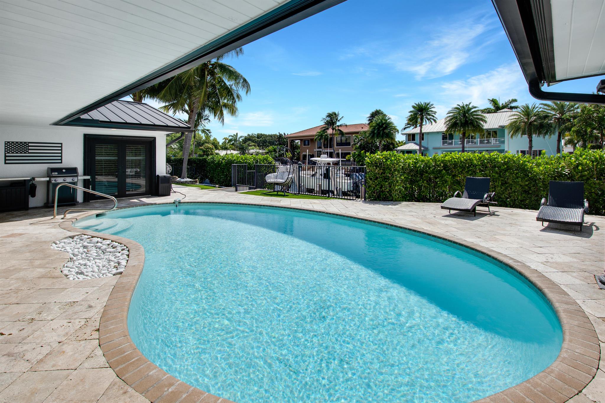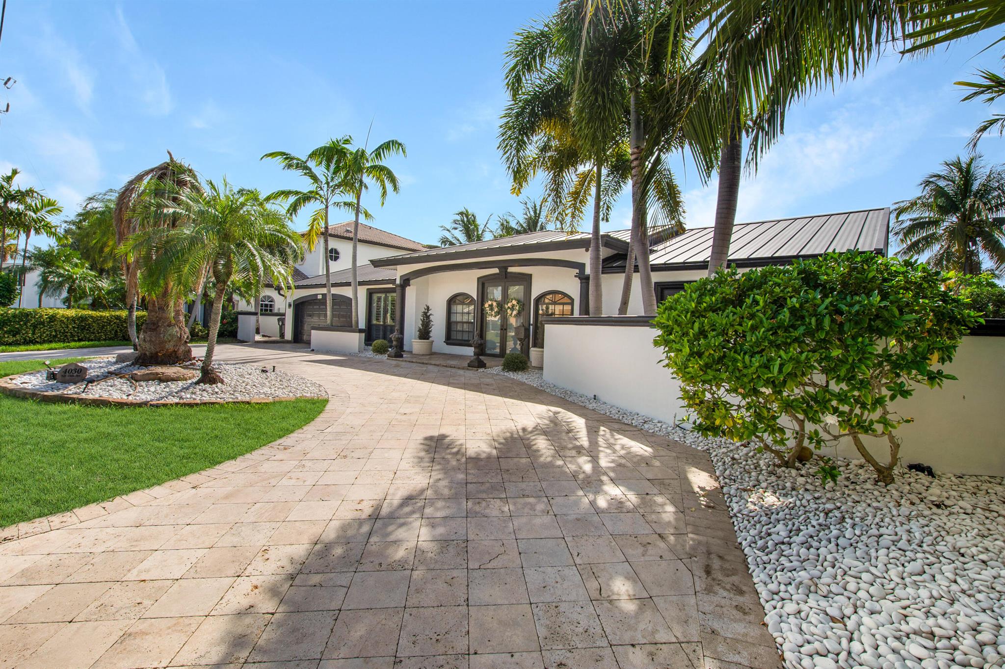 This beautifully redesigned estate in Venetian Isles offers 90 feet of waterfront and a private dock, ideal for those who desire the ultimate in coastal living. Highlights include dual primary suites, elegant marble and modern porcelain tile flooring, refined millwork, plantation shutters, and soaring ceilings. French doors in every room create a seamless indoor-outdoor flow, opening onto expansive terraces that embrace the waterfront setting.
