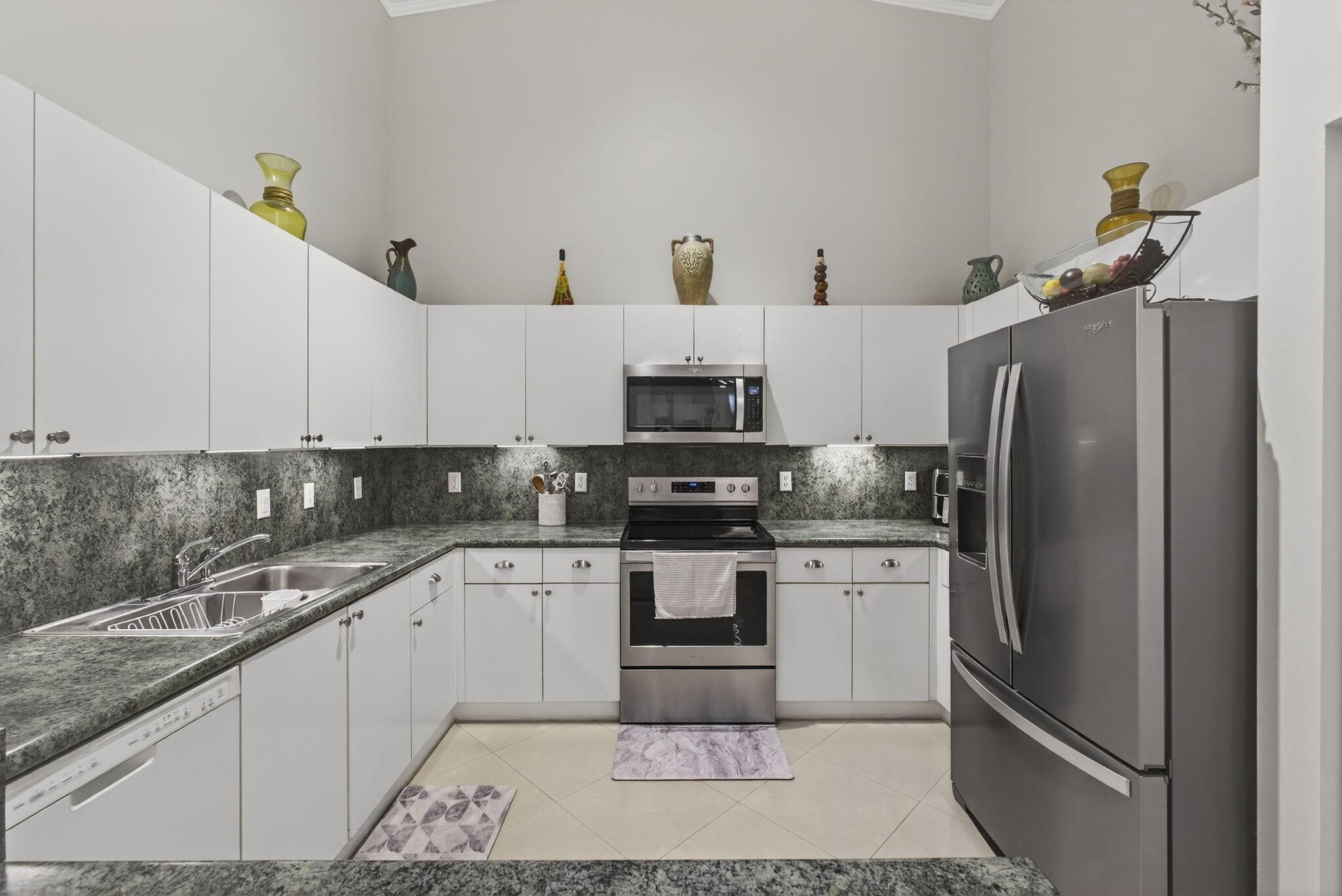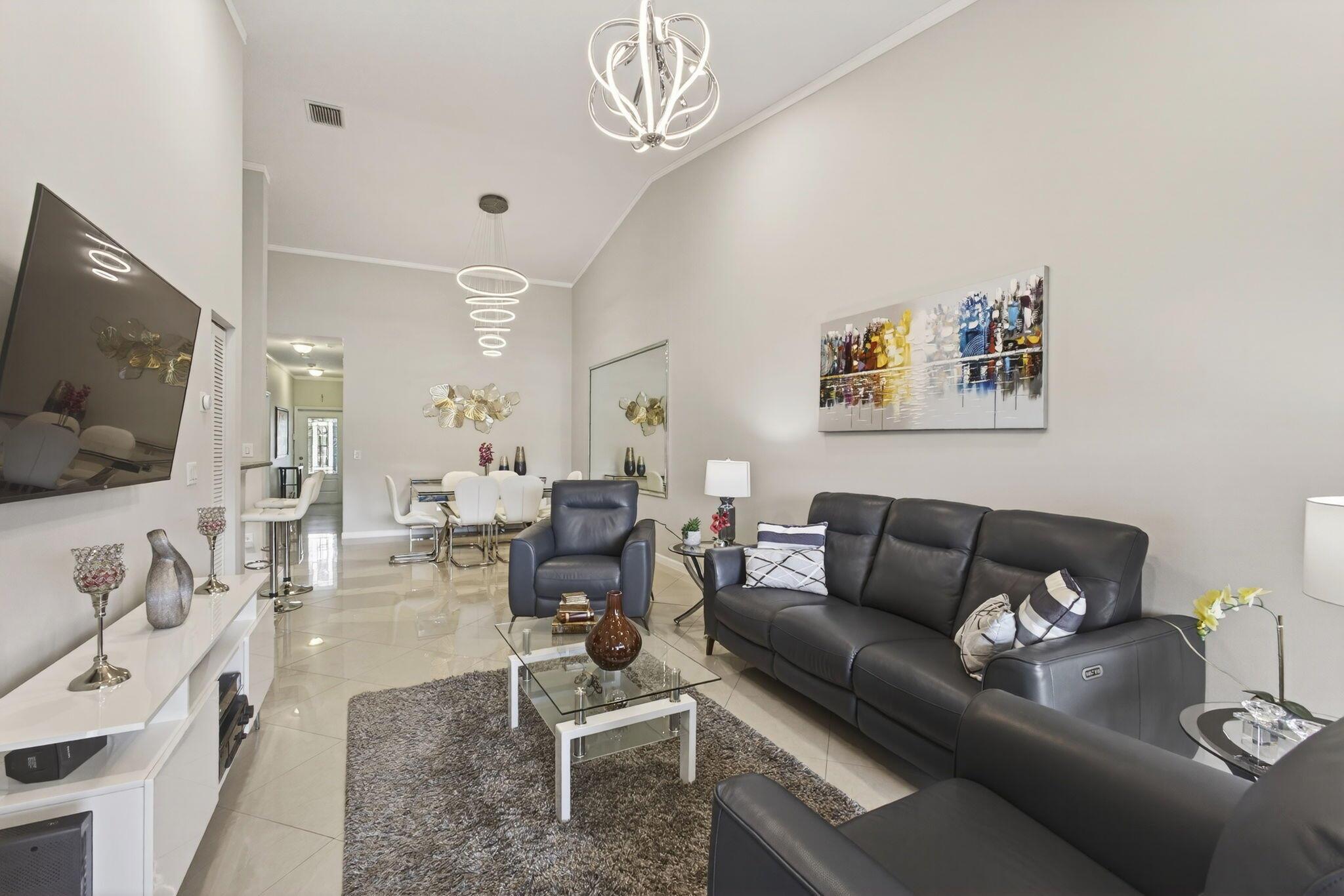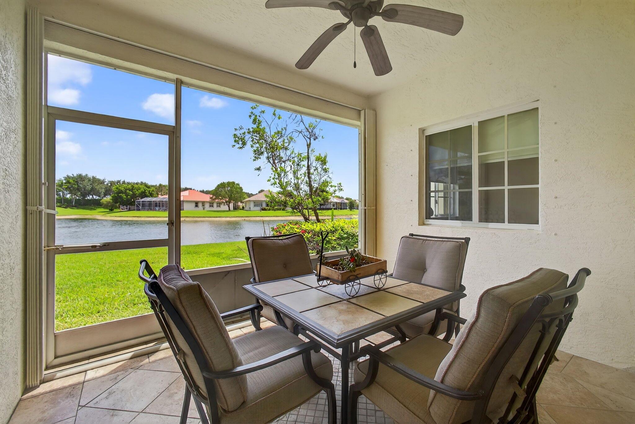 PRICED TO SELL! This pristine, one-story townhouse offers 2 bedrooms and 2 bathrooms in a beautifully maintained and thoughtfully upgraded home. From the moment you walk in, you're welcomed by a sense of warmth and comfort. Featuring elegant porcelain tile flooring, a spacious kitchen, and an open layout perfect for both daily living and entertaining, this home blends style with ease.Step outside to your private patio oasis with peaceful water views--ideal for relaxing or hosting guests. Additional highlights include a one-car garage and driveway parking.Protected with Accordion Shutters. Enjoy resort-style amenities including an adult lap pool, family pool, spa, resistance walking pool, six tennis courts, bocce, shuffleboard, and a clubhouse with gym, ballroom, card room, billiards
